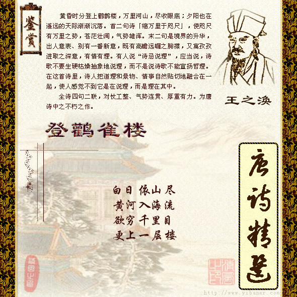 作者:王之涣 白日依山尽,黄河入海流。 欲穷千里目,更上一层楼。 ![]() 【注解】: 1、鹳雀楼:在今山西省蒲县西南,传说鹳雀经常栖息于此。 【韵译】: 夕阳依傍着西山慢慢地沉没,滔滔黄河朝着东海汹涌奔流。 若想把千里的风光景物看够,那就要登上更高的一层城楼。 【评析】: 这是一首登高望远诗。寥寥数语,把景色写得浩瀚壮阔,气魄雄浑,放眼宇宙之无限,寓寄哲理之深沉。诗的两联皆用对仗,而且对得顺乎自然,气势充沛,浩大无边,浑然天成。“欲穷千里目,更上一层楼”,被作为追求理想境界的座右铭,遗芳千古。