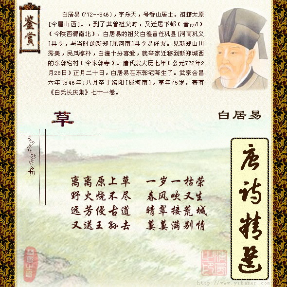 作者:白居易 离离原上草,一岁一枯荣。 野火烧不尽,春风吹又生。 远芳侵古道,晴翠接荒城。 又送王孙去,萋萋满别情。 ![]() 【注解】: 1、离离:历历,分明的样子。 2、远芳:伸展到远处的草。 3、萋萋:茂盛的样子。 【韵译】: 古原上的野草乱生乱长,每年春来茂盛秋来枯黄。 任凭野火焚烧不尽不灭,春风一吹依旧蓬勃生长。 远处芳草掩没古老驿道,延至荒城一片翠绿清朗。 春绿草长又送游子远去,萋萋乱草可比满腹离伤。 【评析】: 这是咏物诗,也可作为寓言诗看。有人认为是讥刺小人的。从全诗看,原上草虽有所指,但喻意并无确定。“野火烧不尽,春风吹又生,”却作为一种“韧劲”而有口皆碑,成为传之千古的绝唱。