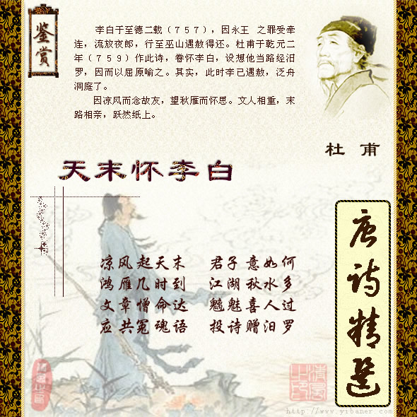 作者:杜甫 凉风起天末,君子意如何。 鸿雁几时到,江湖秋水多。 文章憎命达,魑魅喜人过。 应共冤魂语,投诗赠汨罗。 ![]() 【注解】: 1、天末:犹天边; 2、君子:指李白。 3、文章句:意谓有文才的人总是薄命遭忌。 4、魑魅句:意谓山精水鬼在等着你经过,以便出而吞食,犹“水深波浪阔,无使蛟龙得”。一憎一喜,遂令诗人无置身地。 5、应共句:因屈原被谗含冤,投江而死,与李白之受枉窜身,有共通处,往夜郎又须经过汨罗,故也应有可以共语处。 6、汨罗:汨罗江,屈原自沉处,在今湖南湘阴县。 【韵译】: 凉风习习来自天边的夜郎,老朋友啊你心情可还舒畅。 鸿雁何时能捎来你的音信? 江湖水深总有不平的风浪! 有文才的人往往薄命遭忌,鬼怪正喜人经过可作食粮。 你与屈原有共冤共语之处,请别忘了投诗祭奠汨罗江! 【评析】: 李白于至德二载(757),因永王之罪受牵连,流放夜郎,行至巫山遇赦得还。杜甫于乾元二年(759)作此诗,眷怀李白,设想他当路经汨罗,因而以屈原喻之。其实,此时李已遇赦,泛舟洞庭了。 因凉风而念故友,望秋雁而怀思。文人相重,末路相亲,跃然纸上。