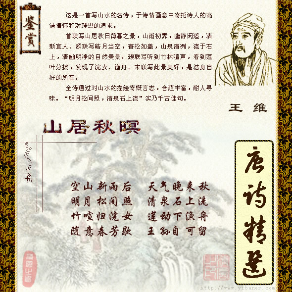 作者:王维 空山新雨后,天气晚来秋。 明月松间照,清泉石上流。 竹喧归浣女,莲动下渔舟。 随意春芳歇,王孙自可留。 ![]() 【注解】: 1、螟:夜色。 2、浣女:洗衣服的女子。 3、春芳:春草。 4、歇:干枯。 【韵译】: 一场新雨过后,青山特别清朗,秋天的傍晚,天气格外的凉爽。 明月透过松林撒落斑驳的静影,清泉轻轻地在大石上叮咚流淌。 竹林传出归家洗衣女的谈笑声,莲蓬移动了,渔舟正下水撒网。 任凭春天的芳菲随时令消逝吧,游子在秋色中,自可留连徜徉。 【评析】: 这是一首写山水的名诗,于诗情画意中寄托诗人的高洁情怀和对理想的追求。 首联写山居秋日薄暮之景,山雨初霁,幽静闲适,清新宜人。颔联写皓月当空,青松如盖,山泉清冽,流于石上,清幽明净的自然美景。颈联写听到竹林喧声,看到莲叶分披,发现了浣女、渔舟。末联写此景美好,是洁身自好的所在。 全诗通过对山水的描绘寄慨言志,含蕴丰富,耐人寻味。“明月松间照,清泉石上流”实乃千古佳句。