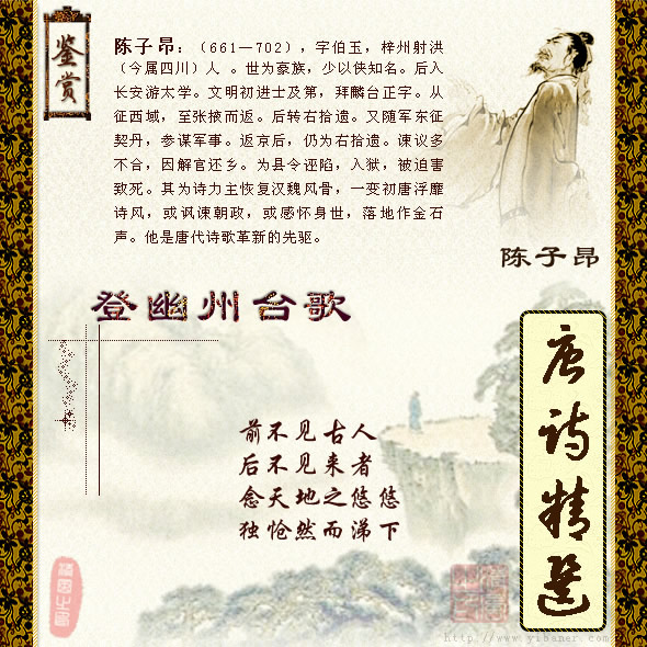 作者:陈子昂 前不见古人,后不见来者。 念天地之悠悠,独怆然而泪下。 ![]() 【注解】: 1、幽州:古十二州之一,现今北京市。 2、悠悠:渺远的样子。 3、怆然:悲伤凄凉。 4、泪:眼泪。 【韵译】: 先代的圣君,我见也没见到,后代的明主,要等到什么时候? 想到宇宙无限渺远,我深感人生短暂,独自凭吊,我涕泪纵横凄恻悲愁! 【评析】: 诗人具有政治见识和政治才能,他直言敢谏,但没有被武则天所采纳,屡受打击,心情郁郁悲愤。 诗写登上幽州的蓟北楼远望,悲从中来,并以“山河依旧,人物不同”来抒发自己“生不逢辰”的哀叹。语言奔放,富有感染力。在艺术表现上,前两句是俯仰古今,写出时间的绵长;第三句登楼眺望,写空间的辽阔无限;第四句写诗人孤单悲苦的心绪。这样前后相互映照,格外动人。句式长短参错,音节前紧后舒,这样抑扬变化,互相配合,大大增强了艺术感染力。