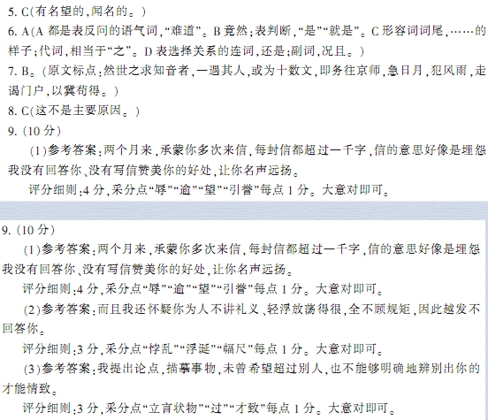 复杜温夫书① 柳宗元 二十五日,宗元白:两月来,三辱生书,书皆逾千言,意若相望仆以不对答引誉者。然仆诚过也。而生与吾文又十卷,噫!亦多矣。文多而书频,吾不对答而引誉,宜可自反。而来征不肯相见,亟拜亟问,其得终无辞乎? 凡生十卷之文,吾已略观之矣。吾性骏滞②,多所未甚谕,安敢悬断是且非耶?书抵吾必曰周、孔,周、孔安可当也7拟人必于其伦,生以直躬见抵,宜无所谀道,而不幸乃曰周、孔,吾岂得无骇怪?且疑生悖乱浮诞,无所取幅尺,以故愈不对答。来柳州,见一刺史,即周、孔之;今而去吾,道连而谒于潮,之二邦,又得二周、孔;去之京师,京师显人为文词、立声名以千数,又宜得周、孔千百。何吾生胸中扰扰焉多周、孔哉! 吾虽少为文,不能自雕斫③,引笔行墨,快意累累,意尽便止,亦何所师法?立言状物,未尝求过人,亦不能明辨生之才致。但见生用助字不当律令,唯以此奉答。所谓乎、欤、耶、哉、夫者,疑辞也;矣、耳、焉、也者,决辞也。今生则一之。宜考前闻人所使用,与吾言类且异,慎思之则一益也。庚桑子言藿蝎鹄卵④者,吾取焉。道连而谒于潮,其卒可化乎?然世之求知音者一遇其人或为十数文即务往京师急日月犯风雨走谒门户以冀苟得。今生年非甚少,而自荆来柳,自柳将道连而谒于潮,途远而深矣,则其志果有异乎?又状貌嶷然类丈夫,视端形直,心无歧径,其质气诚可也,独要谨充之尔。谨充之,则非吾独能,生勿怨。亟之二邦以取法,时思吾言,非固拒生者。孟子曰:“余不屑之教诲也者,是亦教诲而已矣。”宗元白。 【注释】①杜温夫,元和十四年自荆州来柳州,三次致书柳宗元,希望得到柳宗元的延誉。②騃(aí)滞:愚笨迟钝。③雕斫,刻意修饰文辞。④藿(huò)蝎(shǔ)鹄卵:藿蝎,生长在豆类植物上的毛虫;鹄卵,鹤之卵,形体较大。 5.对下列句子中加点词语的解释,不正确的一项是 6.下列各组句子中.加点词的意义和用法相同的一组是 7.给文中加波浪线的句子断句,正确的一项是 8.下列对原文有关内容的理解和分析.不正确的一项是 他的严肃批评。 9.把文中画横线的句子翻译成现代汉语。(10分) 参考答案 ![]() 【参考译文】 二十五日,宗元启:两个月来,承蒙你多次来信,每封信都超过一千字,信的意思好像是埋怨我没有回答你、没有写信赞美你的好处,让你名声远扬。这样讲确实是我的过错。而你又给我寄来十卷文章,唉呀!也够多了。文章寄得很多而书信写得频繁,我没有回答你,没有赞美你、让你名声远扬,你也应该自己反省一下。可你却来问我不肯和你相见的原凶,你多次来拜访、多次来询问,难道最后我连一句回答的话都没有吗? 你的十卷文章,我已简略看了一下。我这个人天性呆笨,对你的文章许多地方都不太懂,怎么敢凭空推断它们是好还是不好呢?信巾写到我,总是把我称为周公、孔子,周公、孔子,我怎么能称得上呢?比拟人一定要用和他同类的人来作比,你可以直率地把想法告诉我,不应该说一些奉承的话。可是不幸得很,你竟然用周公、孔子来称呼我,我怎能不感到惊奇呢?而且我还怀疑你为人不讲礼义、轻浮放荡得很,全不顾规矩,凶此越发不回答你。你来到柳州,见到一个刺史,就把他称为周公、孔子;现在要离开我,途经连州而到潮州,去拜访那儿的刺史,到了那两个地方,又得到了两位周公、孔子。到了京城,京城里那些有地位的人因为会写文章而建立了名声的数以千计,又该得到千百个周公、孔子了,为什么你胸中乱纷纷地有那么多周公、孔子呢? 我虽然很少写文章,自己不会修饰文词,但挥笔写作时,只觉得痛快的感受累累不断,意思表达完了就放下笔,又哪里效法过什么呢?我提出一种论点,描摹一件事物,未曾希望超过别人,我也不能够明确地辨别出你的才能情致如何。只是见到你用助字,不合语法,只能就这一点来回答你。我们所说的乎、欤、耶、哉、夫等字,都是表示疑问语气的虚字;矣、耳、焉、也等字是表示肯定语气的虚字。现在你却把它们当作一回事。你应该考察一下,从前有名声的人使用助词的方法和我所讲的有哪些相同,有哪些不同,慎重地思考一番就会有一定的收获。庚桑子说土蜂变不成豆叶上的大青虫,小鸡不能孵天鹅下的蛋,我同意他的看法。你路经连州到潮卅去拜访那里的刺史,难道最后就能变化了吗?然而,如今世上一些寻求知己的人,一遇到知己,有的写了十几篇文章,就一定要到京城去,急忙抢时间,冒着风雨,跑着去拜访高门大户,指望苟且得到好处。如今你年纪不是很小,而从荆州来到柳州,还将从柳州到连州、潮州去拜访那里的刺史,道路十分遥远,那么你的志向果真和别人不同吗?又见你形态魁梧像个大丈夫,眼神端正、身躯正直,心地单纯,没有杂念,你的气质确实是好的,只是慎重地充实自己就是了。而慎重地充实你的心胸,那又不是我独自能做得到的,你不要埋怨我。赶快到连州、潮州去学习作文的方法,时常想想我讲的话,并不是我要坚持拒绝你的要求。孟子说过:“我不屑于去教诲他,这也是对他的一种教诲呢。”宗元启。