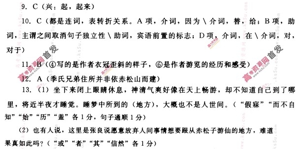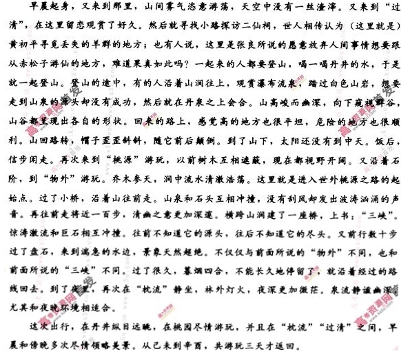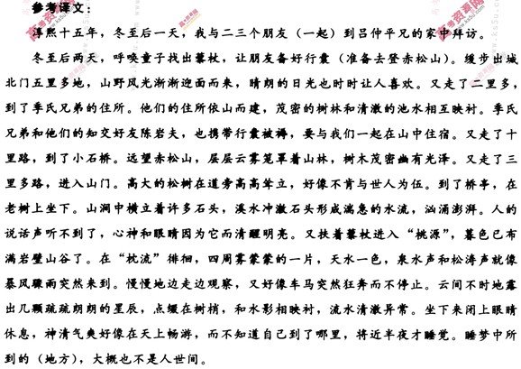 游赤松山记 吕祖谦 淳熙十五年,南至①后一日,与二三友访吕兄仲平之庐。 后二日,呼儿觅藜杖,命友戒行囊。缓步出北郭五里许,山光野色,渐与人相应接,而晴光亦时着人。又二里许,至季氏之庐。所居依山,茂林清池相映带。季民兄弟与其知友陈岩夫,亦赍袱被,欲共宿山中。又行十里,至小石桥。望赤松山,积霭横翠,蔚然深明。复行三里许,入山门。长松偃蹇道旁,若不肯与世士为伍。至桥亭,坐于老木之上。与涧横石,激为清湍,澎湃汹涌。人籁俱息,心目为之醒然。复曳杖入“桃源”,暝色已满岩谷矣。徙倚“枕流”,四际溟蒙,天水一色,泉声松韵,殆若暴风急雨之骤至。徐行察之,又若车马卒奔而未有所止也。云间时有疏星,点缀林杪,与水影相照,清澈无底。坐而假寐,神清如游钧天,而不自知,夜将半,始就寝。梦魂所历,盏亦非人间世也。 晨兴复至其处,灏气游衍,天宇无滓。再至“过清”,驻目久之。即寻支径谒二仙祠,世相传以为黄初平②觅亡羊之地;或曰,此留侯所谓愿弃人间事欲从赤松子游者,其信然耶?偕行者俱欲登山,酌丹井饮,造之。中道或有依涧而上,观瀑泉,履白石,欲穷其源而不可得,复相与会于丹泉之上。山高而深,下视群谷,莫不献状。归途高者平,险者顺。山回路转,鸟纱欹斜,随意先后。至山下,日犹未中。饭竞,信其所之。再寻“桃源”之游,昔林木交翳,今皆廓然。复循山磴,游于“物外”。乔木倚天,涧流清壮。此问桃源之津所从始也。过小桥,缘山而行。泉石相捕,无风而涛。行且百步,幽意益邃。横涧为桥,榜曰:“三峡”。惊涛怒流,与巨石相吞啮。前莫知其所穷,后莫知其所止。复行数十步过盘石,临浚流,景象天逸。不特与所谓“物外”者并,亦与所谓“三峡”者异。久之,暮烟四合,不可久留,遂寻旧游而归。抵夜复坐于“枕流”,林外灯火,久益微茫。泉流静深,尤与夜气相宜。 是行也,极目于丹井,称心于桃源,而于“枕流”“过清”之间,朝暮几与神交。自己未至辛酉,凡三日而后返。 (选自中华书局《古今游记从钞》,有删节) 注:①南至:冬至。②黄初平,东晋人,著名道教神仙,俗称黄大仙。 9.对下列句子中加点词的解释,不正确的一项是 A.亦赍袱被,欲共宿山中 B.又若车马卒奔而未有所止也 C.晨兴复至其处 D.不特与所谓“物外”者异 10.下列各组句子中,加点词的意义和用法相同的一组是 A.人籁俱息,心目为之醒然 B.殆若暴风急雨之骤至 C.泉石相捕,无风而涛 D.抵夜复坐于“枕流” 11.以下六句话分别编为四组,全都是描写赤松山景致的一组是 ①积霭横翠,蔚然深明 ③山高而深,下视群谷,莫不献状 ⑤乔木倚天,涧流清壮 A.①②④ 12.对原文有关内容的理解和分析,下列表述不正确的一项是 A.淳熙十五年冬,作者与几个朋友到了吕仲平家,后又到了季氏兄弟依赤松山而建的住处,然后一起去游览赤松山。 B.作者一行先后两次游历“桃源”,第一次是傍晚时分,光线昏暗,树木互相遮蔽;第二次是午饭后,光线明亮,视野开阔。 C.作者一行在赤松山中住了两夜,赤松山的夜晚静谧而清幽,让人感到神气清爽,心情放松,梦中所到之处也超尘脱俗。 D.本文按时间先后顺序记述了作者游览赤松山的经历,景物随作者游踪而变化,时远时近,有高有低,动静结合,写景极具特色。 13.把文言文阅读材料中加横线的句子翻译成现代汉语。(10分) (1)坐而假寐,神清如游钧天,而不自知,夜将半,始就寝。梦魂所历,盖亦非人间世也。(6分) (2)或曰,此留侯所谓愿弃人间事欲从赤松子游者,其信然耶?(4分) 参考答案 9.C 10.C 11.B 12.A 并非依赤松山而建 ![]() 参考译文 ![]() ![]()