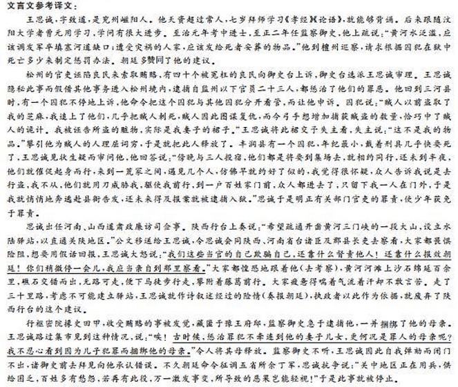 王思诚,字致道,兖州嵫阳人。天资过人,七岁,从师授《孝经》、《论语》,即能成诵。后从汶阳曹元用游,学大进。中至治元年进士第,至正二年,拜监察御史。上疏言:“黄河水溢,宜发卒塞其缺,被灾之家,死者给葬具。”行部至檀州,请定瘐死多寡罪。朝廷多是其议。 松州官吏诬构良民以取赂,诉于台者四十人,选思诚鞫问,思诚密以他事入松州境,执监州以下二十三人,皆罪之。还至三河县,一囚诉不已,俾其党异处,使之言,囚曰:“贼向盗某芝麻某追及刺之几死贼以是图复仇今弓手欲捕获功之数适中贼计。其赃,实某妻裙也。”以裙示失主,主曰:“非吾物。”其党词屈,遂释之。丰润县一囚,年最少,械系濒死,疑而问之,曰:“昏暮三人投宿,将诣集场,约同行,未夜半,趣行,至一冢间,见数人如有宿约者,疑之,众以为盗告,不从,胁以白刃,驱之前,至一民家,众皆入,独留户外,遂潜奔赴县,未及报而被收。”思诚遂正有司罪,少年获免。 出佥河南山西道肃政廉访司事。陕西行台言:“欲疏凿黄河三门,立水陆站以达于关陕。”移牍思诚,会陕西、河南省宪臣及郡县长吏视之,皆畏险阻,欲以虚辞复命,思诚怒曰:“吾属自欺,何以责人!何以待朝廷!诸君少留,吾当躬诣其地。”众惶恐从之,河中滩碛百有余里,礁石错出,路穷,舍骑徒行,攀藤葛以进,众惫喘汗弗敢言,凡三十里,度其不可,乃作诗历叙其险,执政采之,遂寝其议。 行枢密院掾史田甲,受赂事觉,匿豫邸,监察御史捕之急,并系其母,思诚过市中,见之,曰:“嘻!古者罪人不孥,况其母乎!吾不忍以子而系其母。”令释之,不从,思诚因自劾不出,诸御史谒而谢之。俄起五省余丁军,思诚争曰:“关中方用兵,困于供给,民多愁怨,复有是役,万一为变,所系岂轻耶!”事遂寝。 (节选自《元史·王思诚传》,有删改) 【注】①瘐死:泛指在狱中病死。②鞫问:审讯。③趣:cù,同“促”,催促。④孥:nú,子女,亦指妻子和儿女。 4.对下列句子中加点的词语的解释,不正确的一项是(3分) A.后从汶阳曹元用游 游:交往 B.宜发卒塞其快 发:征调 C.朝廷多是其议 是:赞同 D.诸御史谒而谢之 谒:拜见 5.对文中画波浪线部分的断句,正确的一项是(3分) A.贼向盗某芝/麻某追及/刺之几死/贼以是图复仇/今弓手欲捕/获功之数/适中贼计/ B.贼向盗某芝麻/某追及/刺之几死贼/以是图复仇/今弓手欲捕获/功之数/适中贼计/ C.贼向盗某芝麻/某追及/刺之几死/贼以是图复仇/今弓手欲捕/获功之数/适中贼计/ D.贼向盗某芝麻/某追及/刺之几死/贼以是图复仇/今弓手欲捕获功之数/适中贼计/ 6.下列对原文有关内容的概括和分析,不正确的一项是(3分) A王思诚就任监察御史后,不辱使命,连续就治河赈灾、监狱管理等事项向皇帝建言献策,表现出强烈的社会责任意识。 B.王思诚善于断狱审案,注重深入调查,注重案件细节和审理方法,敢于纠正冤狱,对官员犯罪敢于依法惩治。 C.陕西官员向朝廷提出疏凿黄河三门峡建立水陆驿站以通关陕西的奏章,奏章移交给王思诚,他实地考察后,认为不可行,当即决定废弃这一建议。 D.王思诚执法严明但又不滥用法律,在援史田甲藏匿一案的处理上,他援引古例,主张不搞株连,最后使各位监察御史承认错误。 7.把文中画横线的句子翻译成现代汉语。(10分) (1)吾属自欺,何以责人!何以待朝廷!诸君少留,吾当躬诣其地。(5分) (2)古者罪人不孥,况其母乎!吾不忍以子而系其母。(5分) 参考答案 4.A 游 学习 5.D 6.C 废弃此建议的是执政者不是王思诚 7. ![]()