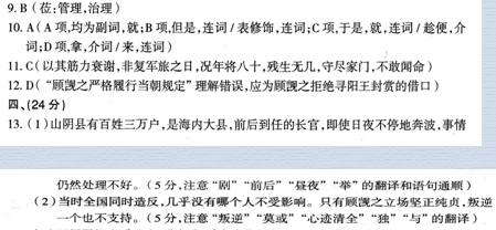 顾觊之初为郡主簿。谢晦为荆州,以为南蛮功曹,仍为晦卫军参军。爱其雅素,深相知待。时大将军彭城王刘义康秉权,乃辞脚疾自免归。在家每夜常于床上行脚,家人窃异之,而莫晓其意。后义康徙废,朝廷多以异同受祸。复为东迁、山阴令。山阴民户三万,海内剧邑,前后官长,昼夜不得休,事犹不举。觊之理繁以约,县用无事,昼日垂帘,门阶闲寂。自宋世为山阴,务简而绩修,莫能尚也。 元凶弑①立,朝士无不移任,唯觊之不徙官。世祖即位。明年,出为湘州刺史,善于莅民,治甚有绩。大明元年,征守度支尚书,领本州中正。二年,转吏部尚书。四年,致仕,不许。 时沛郡相县詹赐,往比村朱起母彭家饮酒还,因得病,吐益虫十余枚。临死语妻张,死后刳②腹出病。后张手自破视,五藏悉糜碎。郡县以张忍行刳剖,赐子副又不禁驻,事起赦前,法不能决。律伤死人,四岁刑;妻伤夫,五岁刑;子不孝父母,弃市,并非科例。三公郎刘勰议:“赐妻痛往遵言,儿识谢及理,考事原心,非存忍害,谓宜哀矜。”觊之议日:“法移路尸,犹为不道,况在妻子,而忍行凡人所不行。不宜曲通小情,当以大理为断,谓副为不孝,张同不道。”诏如觊之议。加左军将军,出为吴郡太守。 太宗泰始初,四方同反,觊之家寻阳,寻阳王子房加以位号,觊之不受,日:“礼年六十不服戎。以其筋力衰谢非复军旅之日况年将八十残生无几守尽家门不敢闻命。”孔觊等不能夺。时普天叛逆,莫或自免,唯觊之心迹清全,独无所与。宗甚嘉之。东土既平,以为左将军、吴郡太守,加散骑常侍。泰始二年,复为湘州刺史,常侍、将军如故。三年卒,时年七十六。追赠镇军将军,常侍、刺史如故。谥日简子。 (选自《宋书·顾觊之传》) 【注】:①弑(shì):封建时代称臣杀君、子杀父母。②刳(kū):剖开 9.对下列语句中加点词语的解释,不正确的一项是 A.莫能尚也 B.善于莅民 C.考事原心 D.孔觊等不能夺 10.下列各组句子中,加点词的意义和用法相同的一项是 A.乃辞脚疾自免归 B.务简而绩修 C.因得病 D.寻阳王子房加以位号 11.下列用“/”给文中画波浪线部分的断句 ,正确的一项是 A.以其筋力/衰谢非复/军旅之日/况年将八十残生/无几守尽家门/不敢闻命 B.以其筋力衰谢/非复军旅之日/况年将八十残生/无几/守尽家门/不敢闻命 C.以其筋力衰谢/非复军旅之日/况年将八十/残生无几/守尽家门/不敢闻命 D.以其筋力衰谢/非复军旅之日/况年将八十残生/无几守尽/家门不敢闻命 12.下列对原文有关内容的概括和理解,不正确的一项是 A.顾觊之具有高雅而朴素的风度,深得谢晦赏识;刘义康当权时,他就以脚病的借口辞官回家,躲过了一劫,后得以起用。 B.顾觊之为官善治理,他先后担任山阴令及湘州刺史,治理地方都政绩显著,屡得重用。后想辞 官,但没得到皇帝的应许。 C.对待唐赐一案,刘勰认为其妻与子无伤害丈夫和父亲的动机,值得哀怜原谅;顾觊之则坚持依法治罪,并得到了皇帝的同意。 D.明帝太始初年,天下大乱,四处造反,寻阳王刘子房要重用顾觊之,而顾觊之严格履行当朝规定,担绝了被授予的爵位和封号。 13.把文言文阅读材料中加横线的句子翻译成现代汉语。(10 分) (1)山阴民户三万,海内剧邑,前后官长,昼夜不得休,事犹不举。(5分) (2)时普天叛逆,莫或自免,唯觊之心迹清全,独无所与。(5分) 参考答案 ![]() 参考译文 顾觊之最开始做吴郡主簿,谢晦任荆州刺史时,让顾觊之当他的南蛮功曹,同时兼任他的卫军参军。谢晦欣赏他的朴素而高雅的风度,对他倍加重视。王弘请顾觊之当扬州主簿,同时兼任他的卫军参军和盐官令,再当衡阳王刘义季右军主簿、尚书都官郎,护军司马。当时大将军彭城王刘义康当权,殷景仁和刘湛的矛盾已显露,顾觊之不想和殷景仁过多接触,于是以脚病的借口辞官回家。在家时每天晚上常在床上走来走去,家里其他人都非常惊异,但不知他为什么这样。后来刘义康被贬谪和废去官爵,朝廷中很多人因为受牵连而遭到惩罚。而顾觊之却再当东迁县令和山阴县令。山阴县有百姓三万户,是海内大县,前后到任的长官,即使日夜不停地奔波,事情仍然处理不好。顾觊之用简单的办法对付繁杂的问题,县里因此没什么麻烦,他白天把县衙门门帘放下来,门外寂寞无声。在宋朝建国以来的所有山阴政务中,这时的事务最少而政绩最突出,没有第二个人能赶上。 元凶刘邵杀文帝自立为皇帝。朝廷人物无不迁官,只有顾觊之没有变动。孝武帝当了皇帝,顾觊之升为御史中丞。孝建元年(454),外出当义阳王刘昶东中郎长史、宁朔将军,且代管会稽郡事务。不久又调为右卫将军,兼领本郡中正。第二年,出外当湘州刺史,他善于管理老百姓,政绩斐然。大明元年(457),调为度支尚书,兼任本州中正。大明二年,转任吏部尚书,大明四年,顾觊之要辞官退休,皇帝没有同意。 时沛郡相县人唐赐到邻村人朱起的母亲彭氏家里喝酒,回来便病了,吐下蛊虫十多条。死前对他的妻子张氏说:他死后要把他的肚子剖开弄清病的原因。之后张氏亲手剖开她丈夫的肚子察看,唐赐的五脏都弄成了碎片。沛郡相县的官员认为张氏竟做出剖开丈夫的肚子的事情,唐赐的儿子唐副又不阻拦,因为这事发生在大赦之前,法官们不能判决。当时法律规定:伤害死人,判徒刑四年;妻子伤害丈夫,判徒刑五年;儿子不孝顺父母,判死刑,都不符合本案的条例。三公郎刘勰认为:“唐赐的妻子悲痛地按丈夫的话去做,他