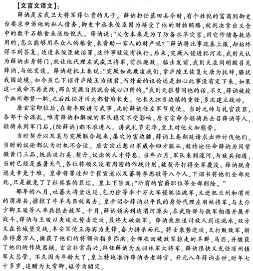 薛讷,左武卫大将军仁贵子也。为蓝田令,有富商倪氏于御史台理其私债,中丞来俊臣受其货财,断出义仓米数千石以给之。讷日:“义仓本备水旱,以力储蓄,安敢绝众人之命,以资一家之产?”竞报上不与。会俊臣得罪,其事乃不行。其后突厥入寇河北,武则天以讷将门,使摄左武威卫将军。临行,于同明殿召见与语,讷因奏日:“丑虏恁凌,以庐陵①为辞。今虽有制升储②,外议犹恐未定。若此命不易,则狂贼自然款伏。”则天深然其言。寻拜幽州都督,转并州大都督府长史,久当边镇之任,累有战功。 玄宗即位,于新丰讲武,讷为左军节度。时元帅与礼官得罪,诸部颇亦失序。唯讷及解琬之军不动。玄宗令轻骑召讷等,至军门,皆不得入。礼毕,上甚加慰劳。 时契丹及奚与突厥连和,屡为边患,讷建议请出师讨之。时议成以为不便。玄宗方欲威服四夷,特令讷同紫微黄门三品,总兵击奚、契丹,议者乃息。六月,师至滦河,遇贼,时既蒸暑,诸将失计会,尽为契丹等所覆。讷脱身走免,归罪于崔宣道及蕃将李思敬等八人,诏尽令斩之,特免杜宾客之罪。下制日:“所有官爵等并从除削。” 其年八月,吐蕃大将坌③达延、乞力徐等率众十万寇临洮军④,又进寇兰州及渭州之渭源县,掠群牧而去。诏讷白衣摄左羽林将军,与大仆少卿王唆等率兵邀之。十月,讷领众至渭源,遇贼战于武阶驿,与王唆掎角夹攻之,大破贼众。追奔至洮水,又战于长城堡,丰安军使王诲宾先锋力战死之。将士乘势进击,又败之,杀获万人,擒其将六指乡弥洪,尽收其所掠羊马,并获其器械,不可胜数。玄宗大悦,拜讷为左羽林军大将军。俄又充凉州镇军大总管。寻以年老,特听致仕⑤。八年卒,年七十余,赠太常卿,谥日昭定。 (选自《旧唐书•列传第四十三》,有删改) 【注】①庐陵:指太子李显,被武则天废为庐陵王。 ②储:储君,太子。 ③坌:bèn。 ④临洮军:唐代边防军建制名。 ⑤致仕:辞官。 9.对下列语句中加点词语的解释,不正确的一项是 A.会俊臣得罪 会:适逢 B.则天深然其言 然:认为正确 C.吐蕃大将坌达延、乞力徐等率众十万寇临洮军 寇:贼寇 D.与大仆少卿王睃等率兵邀之 邀:拦击 10.下列各组句子中,加点词的意义和用法相同的一项是 A_义仓本备水旱,以为储蓄 兵精粮多,足以立事 B.讷因奏曰 若民,则无恒产,因无恒心 C.尽为契丹等所覆 为击破沛公军 D.掠群牧而去 怒而飞,其翼若垂天之云 11.下列各组语句中,全都能体现薛讷为国家着想的一组是 ①断出义仓米数千石以给之 ②安敢绝众人之命,以资一家之产 ③今虽有制升储,外议犹恐未定 ④唯讷及解琬之军不动 ⑤讷建议请出师讨之 ⑥俄又充凉州镇军大总管 A.①③⑥ B.②④⑥ C.①④⑤ D.②③⑤ 12.下列对原文有关内容的理解和分析,不正确的一项是 A.薛讷担任蓝田县令时,担任御史中丞的来俊臣收受贿赂,并想从赈灾粮仓中拨官粮给倪姓富商。薛讷给予回绝,并且上报。 B.薛讷是将门之后。武则天在位时,他主动要求带兵迎战来犯的突厥军队,并借机谏言皇上,定下让庐陵王李显升为太子的君命。 C.薛讷深得唐玄宗的器重。当官员们获罪时,他没受到影响;当外敌危害边疆时,他力主迎战,结果兵败被削职.却免于死罪。 D.薛讷抗击吐蕃军时,先与王睃形成夹攻之势,大败敌军;后又乘胜追击,再败敌军,不仅夺回掠走的羊马,还俘获了敌将。 13.把文言文阅读材料中加横线的句子翻译成现代汉语。(10分) (1)寻拜幽州都督,转并州大都督府长史,久当边镇之任,累有战功。(5分) (2)玄宗令轻骑召讷等,至军门,皆不得入。礼毕,上甚加慰劳。(5分) 参考答案 ![]()