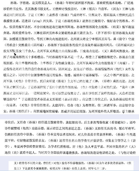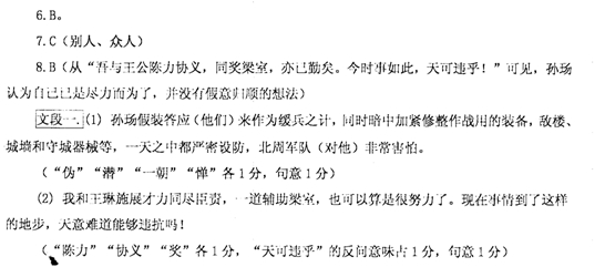 孙砀,字德琏,吴郡吴人也。少倜傥,好谋略,博涉经史,尤便书翰。王僧辩之讨侯景也,王琳为前军,琳与砀同门,乃表荐为戎昭将军、宜都太守,仍从僧辩救徐文盛于武昌。会郢州陷,乃留军镇巴陵,修战守之备。俄而侯景兵至,日夜攻围,场督所部兵悉力拒战,贼众奔退。高祖受禅,王琳立梁永嘉王萧庄于郢州,征场为太府卿,加通直散骑常侍。及王琳入寇,周遣大将史宁率众四万,乘虚奄至,场助防张世贵举外城以应之,所失军民男女三千馀口。周军又起土山高梯,日夜攻逼,因风纵火,烧其内城南面五十馀楼。时砀兵不满千人,乘城拒守,砀亲自抚巡,行酒赋食,士卒皆为之用命。周人苦攻不能克,乃矫授砀柱国、郢州刺史,封万户郡公。场伪许以缓之,而潜修战具,一朝严设,周人甚惮焉。及闻大军败王琳,乘胜而选,周兵乃解。砀于是尽有中流之地,集其将士而谓之日:“吾与王公陈力协义,同奖梁室,亦已勤矣。今时事如此,天可违乎!”遂遣使奉表诣阙。高宗即位,以场功名素著,深委任焉。太建四年,授都督荆、信二州诸军事、安西将军、荆州刺史,出镇公安。砀增修城池,怀服边远,为邻境所惮。后主嗣位,复除通直散骑常侍,兼起部尚书。后主频幸其第,及著诗赋述勋德之美,展君臣之意焉。又为五兵尚书,领右军将军,侍中如故。砀事亲以孝闻,于诸弟甚笃睦。性通泰有财物散之亲友常于山斋设讲肆集玄儒之士冬夏资奉为学者所称而处己率易。不以名位骄物。时兴皇寺朗法师该通释典,砀每造讲筵,时有抗论,法侣莫不倾心。以年老累乞骸骨,优诏不许。祯明元年卒官,时年七十二。 (节选自《陈书》) 6.下列对文中画波浪线部分的断句,正确的一项是 A.性通泰/有财物散之/亲友常于山斋设讲肆/集玄儒之士/冬夏资奉为学者/所称而处/己率易/ B.性通泰/有财物散之亲友/常于山斋设讲肆/集玄儒之士/冬夏资奉/为学者所称/而处己率易/ C.性通泰/有财物散之亲友/常于山斋设讲肆/集玄儒之士/冬夏资奉为学者/所称而处/己率易/ D.性通泰/有财物散之/亲友常于山斋设讲肆/集玄儒之士/冬夏资奉/为学者所称而处/己率易/ 7.下列对文中加点词语解说,不正确的一项是 A.高祖受禅 B.周遣大将史宁率众四万,乘虚奄至 C.不以名位骄物 D.以年老累乞骸骨 8.下列对原文有关内容的概括和分析不正确一项是 A.孙场通晓谋略,战功卓著。侯景围攻,他率部下全力抵抗,顺利解围;与大将史宁作战时,在兵力悬殊、形势不利的情况下,仍让周兵吃尽了苦头。 B.孙砀审时度势,能屈能伸。他先前跟随王琳做梁永嘉王的太傅卿、通直散骑常侍,当王琳兵败之后,他召集将士分析形势,假意归顺,保留实力,伺机而动。 C.孙场劳苦功高,深受恩宠,高宗即位后,非常信任和重用他,派他都督军事,把守重镇;后主继位后,常常亲自拜访他,并写诗称赞他的功绩。 D.孙砀博学多才,被人钦慕。他自幼涉猎广泛,博览群书,后又造访讲经之处,经常和高僧谈论佛经,并时有论辩,让僧侣们心悦诚服。 9.翻译句子 (1)砀伪许以缓之,而潜修战具,一朝严设,周人甚惮焉。 (2)吾与王公陈力协义,同奖梁室,亦已勤矣。今时事如此,天可违乎 参考答案 6.B 7.C 8.B ![]() 参考译文 ![]()