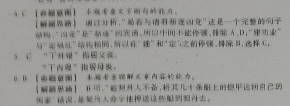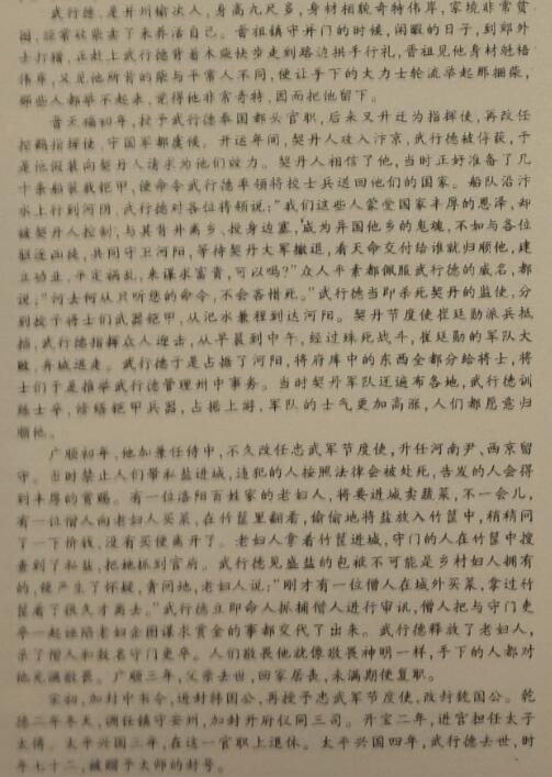 武行德,并州榆次人,身长九尺余,材貌奇伟,家甚贫,常采樵鬻之自给。晋祖镇并门,暇日,从禽郊外,值行德负薪趋拱于道左,晋祖见其魁岸,又所负薪异常,令力士更举之,俱不能举,颇奇之,因留帐下。 晋天福初,授奉国都头,迁指挥使,改控鹤指挥使、宁国军都虞候。开运中,契丹至汴,行德被获,乃伪请于契丹以自效。契丹信之,方具舟数十艘载铠甲,令行德率将校军卒送归其国。溯汴至河阴,行德谓诸将曰:“我辈受国厚恩,而受制于契丹,与其离乡井、投边塞,为异域之鬼,曷若与诸君驱逐凶党共守河阳姑俟契丹兵退视天命所属归之建功业定祸乱以图富贵可乎?”众素服行德威名,皆曰:“所向惟命,不敢爱死。”行德即杀契丹监使,分授器甲,由汜水倍道抵河阳。契丹节度使崔廷勋出兵来拒,行德麾众逆击,自旦及午殊死战,廷勋大败,弃城走。行德遂据河阳,尽以府库分给将士,因推行德知州事。时契丹兵尚充斥,行德厉士卒,缮甲兵,据上游,士气益奋,人望归之。 广顺初,加兼侍中,俄改忠武军节度,迁河南尹、西京留守。时禁盐入城,犯者法至死,告者给厚赏。洛阳民家妪将入城鬻蔬,俄有僧从妪买蔬,就筥翻视,密置盐筥中,少答其 直,不买而去。妪持入城,抱关者搜得盐,擒以诣府。行德见盛盐襥非村妪所有,疑而诘之,妪言:“适有僧自城外买蔬,取视久之而去。”即捕僧讯治之,具伏与关吏同诬妪以希赏。行德释妪,斩僧及抱关吏数辈。人畏之若神明,部下凛然。三年,丁外艰,起复。 宋初,加中书令,进封韩国公,再授忠武军节度,改封魏国公。乾德二年冬,移镇安州,加开府仪同三司。开宝二年,入为太子太傅。太平兴国三年,以本官致仕。四年,卒,年七十二,赠太师。 (选自《宋史》,有删改) 4.对文中画波浪线部分的断句,正确的一项是(3分) A.曷若与诸君驱逐/凶党共守河阳/姑俟契丹兵退/视天命所属/归之建功业/定祸乱/以图富贵可乎? B.曷若与诸君驱逐凶党/共守河阳/姑俟契丹兵退/视天命所属/归之建功业/定祸乱/以图富贵可乎? C.曷若与诸君驱逐凶党/共守河阳/姑俟契丹兵退/视天命所属归之/建功业/定祸乱/以图富贵可乎? D.曷若与诸君驱逐/凶党共守河阳/姑俟契丹兵退/视天命所属归之/建功业/定祸乱/以图富贵可乎? 5.下列对文中加点词语的相关内容的解说,不正确的一项是(3分) A.“致仕”在古代指交还官职,即退休。古人还常用致事、致政、休致等名称指官员辞职归家。 B.“弃城走”中的“走”为逃跑的意思。现代的“走”在古代常用“行”来表示,现代的“散步”在古代用“步”。 C.“丁外艰”在古代指遭逢母亲丧事,等同于“丁母忧”。与之相对的“丁内艰”指的是居父丧。 D.“进封韩国公”中的“公”是爵位,中国古代置五等爵:公、侯、伯、子、男。五等之首曰公。 6.下列对原文有关内容的概括和分析,不正确的一项是(3分) A.武行德身材相貌奇特伟岸,力量很大。他在路边卖柴时,晋祖手下的大力士都不能举起他背上的柴,晋祖因此收留了他。 B.武行德头脑机智,善于变通。在契丹人攻到汴京时,他被俘后假装投降,趁契丹人不备,将其几十条船上的铠甲运回自己的国家。 C.武行德对待手下很好,深得手下佩服。河阳一役,他率众打败崔廷勋的大军,将府库里的东西分给士兵,士兵推举他管理州中事务。 D.武行德心思缜密,断案如神。在审理村妪带私盐进城一案时,他由盛盐的袋子推断不是村妪所为,最终查出真正的罪犯,并严加惩治。 7.把文中画横线的句子翻译成现代汉语。(10分) (1)开运中,契丹至汴,行德被获,乃伪请于契丹以自效。(5分) (2)时契丹兵尚充斥,行德厉士卒,缮甲兵,据上游,士气益奋,人望归之。(5分) 参考答案 4C 5C 6B ![]() 7.(1)开运年间,契丹人攻入汴京,武行德被俘获,于是他假装向契丹人请求为他们效力。 (2)当时契丹人还遍布各地,武行德训练士卒,修缮铠甲兵器,占据上游,军队的士气更加高涨,人们都愿意归顺他。 参考译文