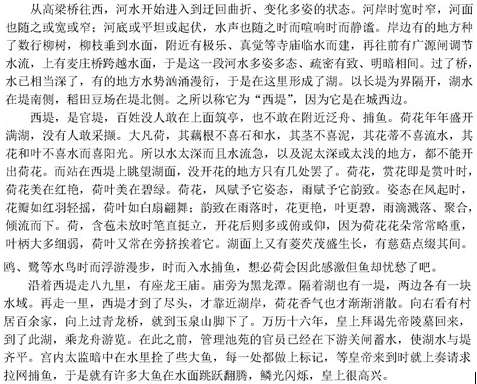 西堤 【明】刘侗 水从高梁桥而又西,萦萦入乎偶然之中。岸偶阔狭,而面以阔以狭,水底偶平不平,而声以鸣不鸣。偶值数行柳垂之,傍极乐、真觉诸寺临之,前广源闸节之,上麦庄桥【1】越之,而以态写,以疏密致,以明暗通。过桥,水亦已深,偶得濆【2】衍,遂湖焉。界之长堤,湖在堤南,堤则北;稻田豆场在堤北,堤则南。曰西堤者,城西堤也。 堤,官堤,人无敢亭,无敢舫,无敢渔。荷年年盛一湖,无敢采采。凡荷,藕恶石及水,芊恶泥,蒂恶流水,花叶恶水而乐日。故水太深以流,泥太深浅者,不能花也。西堤望湖,不花者数段耳。荷,花时即叶时,花香其红,叶香其绿。荷,风姿而雨韵。姿在风,羽红摇摇,扇白翻翻;韵在雨,粉历历,碧琤琤,珠溅合,合而倾。荷,朵时笔植,而花好偃仰,花头每重,柄每弱,盖每傍挤之。菱砌芡铺,簪之慈菇。鹥步鶂投,浮鹭没凫,则感荷而愁鱼矣。 堤行八九里,龙王庙。庙之傍,黑龙潭。隔湖一堤,而各为水。又行一里,堤始尾,湖始濒,荷香始回。右顾村百家,上青龙桥,即玉泉山下也。万历十六年,上谒陵还,幸湖,御龙舟。先期,水衡【3】于下流闸水,水平堤。内侍潜系巨鱼水中,处处识之,则奏举纲,紫鳞银刀,泼剌水面,上颜喜。 注释: 【1】麦庄桥:即今日麦钟桥。 【2】濆(pēn)衍:水势汹涌漫衍。 【3】水衡:管理池苑之官。 7.下列句中加点词的解释,正确的一项是(2分) ①傍极乐、真觉诸寺临之 A.面对 ②朵时笔植 A.栽种 8.下列各组句中加点词的意义和用法,相同的一组是(2分) A.萦萦入乎偶然之中 B.遂湖焉 C.故水太深以流 D.堤始尾 9.下列对文中语句的解释,不正确的一项是(3分) A.岸偶阔狭,而面以阔以狭 河岸时宽时窄,河面也随之或宽或窄 B.前广源闸节之 C.鹥步鶂投,浮鹭没凫 D.则奏举纲 10.请把最后一段画波浪线的句子译为现代汉语。(4分) 11.本文在写景记游中折射出当时怎样的社会现实?请结合文意简要说明。(3分) 12.荷,亦称莲,向来为文人墨客所钟爱,周敦颐《爱莲说》与本文都对其进行了描绘。相比之下,两篇文章所写荷(莲)在形象、写法上有何不同?(5分) 13.在横线处填写相关作品原句。(6分。限选其中6处。) 信步闲游的刘侗笔下有“风姿而雨韵”的荷。其实,在古代诗文作品中,花草树木一直扮演着重要角色,折射出人的不同境遇与追求:陶渊明的理想境界在一片“中无杂树, 参考答案 7.A B 8.D 9.D 10.万历十六年,皇上拜谒先帝陵墓回来,到了此湖,乘龙舟游览。在此这前,管理池苑的官员已经在下游关闸蓄水,使湖水与堤齐平。 ![]() 参考译文