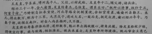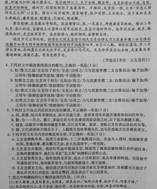 王友直传译文 王友直,字圣益,博州高平人。父亲王佐,因才能和勇武著称。王友直十二岁时,跟随父亲游历,精通兵法。 绍兴三十一年,金人背弃盟约,王友直结交豪杰,立志收复失地。对众人说:“权力是用来成事的,权力(如果)用得对,对道义有什么损害呢。”就假托朝廷命令自己拟定了承宣使、河北等地的安抚制置使,其余拟定的官职各有差别,通告各州县起兵救援王朝。不久,得到几万人马,编成十三支军队。九月戊子这一天,进军攻打大名,一举攻克,安抚百姓,用绍兴年号晓谕民众。于是向朝廷上奏,想要率领军队返回南部。当时金兵还在扬州,奏章长时间没有上报。 王友直将从寿春过淮水渡河,在路上接受了皇帝的诏书,皇帝勉励王友直率军直捣敌军要害,形成掎角之势接应支援。授予王友直检校少保职位,能够自行决断处理事务。不久和敌军相遇,在淮北抵御他们。敌军来得越来越多,王友直立刻率领军队渡过淮水。不久知悉金主完颜亮已经死了,遇到的金军是回撤(金国)的军队,后悔自己没有(趁机)攻打他们。高宗在长江边督率军队,在金陵接见王友直,赏赐他金带。王友直耻于先前的事没做成,自己陈奏,改任复州防御使。过了四个月,皇帝下诏(让王友直)偕同统制张子盖救援海州。刚一交战,王友直展开一面大旗,大字书写“宋忠义将河北王九郎”来表明心志。(王友直)秘密地从小路转到敌阵背后,凭借敌军粮草营帐的掩护,控制了敌军撤退的桥梁,士兵埋伏在河两侧。张子盖知道王友直已经趁机到了敌军后面,就指挥军队进攻,敌军溃败逃走,全部溺水而死,围困于是解除。 孝宗即位,王友直多次出奇谋连续作战。张浚时任江淮都督,一见友直就很欣赏他,授予他建康前军统制官职。隆兴二年九月,金人侵犯边境,宣谕使王之望命令(友直)带领前军戍守昭关,王友直立刻出发。一同戍守的其他守军,敌军到了,就退守到和州,王友直孤军坚持守卫。金军驻扎在黄山,两军相隔很近,(王友直)越发有序从容地坚守。 不久改任步司左军统制。当初,在淮北作战时,王友直母子失散了,到这时才寻访找到。于是,(友直)和妻子李氏带着两个女儿从淮北回来。皇帝的赏赐很丰厚,第二年又被授予御前诸军统制,王友直推辞请求担任祠禄官(这类闲职),皇帝亲写诏书慰劳。隆兴四年,从京口去朝见皇帝。朝廷商议派遣马司和步司去驻扎军事重地,丞相虞允文想要先派遣步司,王友直请求让马司先去。等到马司统帅李显忠屯兵金陵,王友直上奏说马司军队路途辗转,困顿死亡(的情况)非常严重。(于是皇帝)下旨不派遣步司(前往)。 ![]() ![]() 参考答案 4.A(根据文意,应如此停顿。) 5.C(辎重泛指义不含“负责运送的兵马”。) 6.C(原文“鼓柝相闻”是说两军驻地很近,不是“鸣鼓战斗”。) 7.(1)金人背弃盟约,王友直结交豪杰,立志收复失地。对众人说:“权力是用来成事的,权力(如果)用得对,对道义有什么损害呢。”(5分) (2)高宗在长江边督率军队,在金陵接见王友直,赏赐他金带。王友直耻于先前的事没做成,自己陈奏,改任复州防御使。(5分)