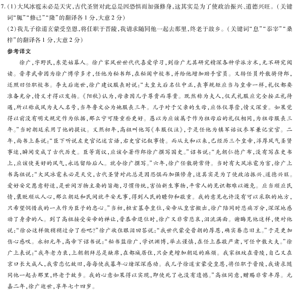 徐广,字野民,东莞姑幕人也。家世好学,至广尤精,百家数术,无不研览。晋孝武帝以广博学,除为秘书郎,校书秘阁,增置职僚。转员外散骑侍郎,领校书如故,李太后薨,广议服曰:“太皇太后名位允正,体同皇极,理制备尽,情礼弥申,《阳秋》之义母以子贵既称夫人礼服从正故成风显夫人之号文公服三年之丧子于父之所生体尊义重若嫌明文不存,则疑斯从重。谓应同于为祖母后,齐衰三年。”时从其议。义熙初,高祖使撰《车服仪注》,乃除镇军咨议参军,领记室:二年,尚书奏曰:“臣闻左史述言,右官书事。而太和以降,世历三朝,玄风圣迹,倏为畴古。臣等参详,宜敕著作郎徐广撰成国史。”诏曰:“先朝至德光被,未著方策,宜流风缅代,永贻将来者也。便教撰集。”六年,迁散骑常侍。时有风雹为灾,广献书高祖曰:“风雹变未必为灾,古之圣贤辄惧而修己,所以兴政化而隆德教也。好安愿逸,万物之大趣,习旧骇新,凡识所不免。要当俯顺群情,抑扬随俗,则朝野欢泰,具瞻允康矣。言无可采,愿矜其愚款之志。”初,桓玄篡位,安帝出宫,广陪列悲恸,哀动左右。及高祖受禅,恭帝逊位,广又哀感,涕泗交流。谢晦见之,谓之曰:“徐公将无小过?”广收泪答曰:“身世荷晋德,实眷恋故主。”因更歔欷。永初元年,诏曰:“秘书监徐广,学优行谨,历位恭肃,可中散大夫。”广上表曰:“臣年时衰耄,朝敬永阙,端居都邑,徒增替怠。臣坟墓在晋陵,臣又生长京口,恋旧怀远,每感暮心。息道玄谬荷朝恩,忝宰此邑,乞相随之官,归终桑梓。微志获申,殒没无恨。”许之,赠赐甚厚。元嘉二年,卒,时年七十四。 4.下列对文中画波浪线部分的断句,正确的一项是(3分) A.《阳秋》之义/母以子/贵既称夫人/礼服从正/故成风显夫人之号/文公服三年之丧/子于父之所生/体尊义重/ B.《阳秋》之义/母以子/贵既称夫人/礼服从正/故成风显夫人/之号文公/服三年之丧/子于父之所生/体尊义重/ C.《阳秋》之义/母以子贵/既称夫人/礼服从正/故成风显夫人之号/文公服三年之丧/子于父之所生/体尊义重/ 5.下列对文中加点词语的相关内容的解说,不正确的一项是(3分) A.太后,是封建时代对皇帝生母的尊称。太皇太后便是皇帝祖母的尊称。 B.愚款,谦指己之诚意:愚,自称谦词,表示自谦的词还有卑、鄙、拙、敝等。 C.表,中国古代臣子向皇帝上书陈情言事的一种特殊文体,往往带有抒情色彩。 D.元嘉二年,采用的是年号纪年法,在中国古代,纪年法还有王公年次纪年法、干支纪年法等。 6.下列对原文有关内容的概括和分析,不正确的一项是(3分) A.徐广学识广博,受到重用。徐广对各种学派方术无不涉猎;由于博学多才.孝武帝任命他为秘书郎,并给他增加下属官员,后来转任员外散骑侍郎。 B.徐广以礼进谏,得到采纳。李太后逝世后,徐广在谈论服丧时,引用典故,按孝义为先,认为应为李太后守孝三年,他的建议得到朝廷认可和采纳。 C.徐广重情重义,深念旧恩。徐广身为旧臣,当安帝被迫离开皇宫和退位时,他悲痛万分;徐广曾经有过错却蒙受到晋朝的大恩,因而愈发思念旧主。 D.徐广不慕高位,极力辞官。朝廷打算让徐广担任中散大夫。他以年老力衰,难以胜任,恋忆故旧,怀念过去为由推辞,最终得到高祖同意。 7.把文中画横线的句子翻译成现代汉语。(10分) (1)风雹变未必为灾,古之圣贤辄惧而修己,所以兴政化而隆德教也。 (2)息道玄谬荷朝恩,忝宰此邑,乞相随之官,归终桑梓。 参考答案 4.C 5.A 6.C