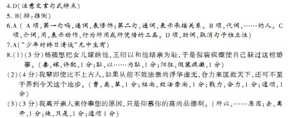 王衍字夷甫,神情明秀,风姿详雅。总角尝造山涛,涛嗟叹良久。既去,目而送之曰:“何物老妪,生宁馨儿!然误天下苍生者,未必非此人也。”衍年十四,时在京师,造仆射羊祜,申陈事状,辞甚清辩。祜名德贵重,而衍幼年无屈下之色,众咸异之。杨骏欲以女妻焉,衍耻之,遂阳狂自免。武帝闻其名,问戎曰:“夷甫当世谁比?”戎曰:“未见其比,当从古人中求之。” 泰始八年,诏举奇才可以安边者,衍初好论从横之术,故尚书卢钦举为辽东太守。不就,于是口不论世事,唯雅咏玄虚而已。父卒于北平,送故甚厚,为亲识之所借贷,因以舍之。数年之间,家资罄尽,出就洛城西田园而居焉。后为太子舍人,迁尚书郎。出补元城令,终日清谈,而县务亦理。入为中庶子、黄门侍郎。 衍既有盛才关貌,明悟若神,常自比子贡。兼声名藉甚,倾动当世。妙善玄言,唯谈《老》《庄》为事。每捉玉柄麈尾,与手同色。义理有所不安,随即改更,世号“口中雌黄。”朝野翕然,谓之“一世龙门”矣。累居显职后进之士莫不景慕仿效选举登朝皆以为称首矜高浮诞遂成风俗焉。 衍俊秀有令望,希心玄远,未尝语利。衍妻郭氏,贾后之亲,藉中宫之势,刚愎贪戾,聚敛无厌而不能禁。衍疾郭之贪鄙,故口未尝言钱。郭欲试之,令婢以钱绕床,使不得行。衍晨起见钱,谓婢曰:“举却阿堵物!”其措意如此。 衍虽居宰辅之重,不以经国为念,而思自全之计。及东海王越薨,举军为石勒所破,勒呼王公与之相见,问衍以晋故。衍为陈祸败之由,云计不在己。勒甚悦之,与语移日。衍自说少不豫事,欲求自免,因劝勒称尊号。勒怒曰:“君名盖四海,身居重任,少壮登朝,至于白首,何得言不豫世事邪?破坏天下,正是君罪。”使人夜排墙填杀之。衍将死,顾而言曰:“呜呼!吾曹虽不如古人,向若不祖尚浮虚,戮力以匡天下,犹可不至今日。”时年五十六。 4.下列对文中画波浪线的句子断句最恰当的一项是(3分)( ) A.累居显职后/进之/士莫不景慕/仿效选举登朝/皆以为称首矜高/浮诞遂成风俗焉 B.累居显职后/进之士莫不景慕/仿效选举/登朝皆以为称首/矜高浮诞/遂成风俗焉 C.累居显职/后进之士/莫不景慕/仿效选举/登朝皆以为称首/矜高浮诞/遂成风俗焉 D.累居显职/后进之士/莫不景慕仿效/选举登朝/皆以为弥首/矜高浮诞/遂成风俗焉 5. 下列语句中加点词语的解释,不正确的一项是(3分) ( ) A.造仆射羊祜 造:拜访 B.使人夜排墙填杀之 排:排列 C.总角尝造山 总角:古时儿童束发为两结,向上分开,形状如角,故称总角。借指八九岁至十三四岁时期的童年。 D.衍初好论纵横之术 从横:指合纵连横,战国至秦汉之际善于外交的外交家所使用的谋术。 6.下列各组语句中加点的词语,意义用法不相同的一组是(3分) A.既去,目而送之 置之地,拔剑撞而破之 B.然误天下苍生者 诏举奇才可以安边者 C.令婢以钱绕床,使不得行 愿以十五城请易璧 D. 衍疾郭之贪鄙,故口未尝言钱 公之视廉将军孰与秦王 7.下列对原文有关内容的分析和概括,不正确的一项是(3分)( ) A.王衍小时神情清明,终日清谈,风姿安详优雅,但山涛却说他可能“误天下苍生”,事实证明山涛眼光独到。 B.王衍擅长言辞,他十四岁时,到当时名望很大的仆射羊祜那里,言辞清晰明白,且无屈从卑下的神色,众人都认为他非同寻常。 C.王衍有优异的才能和俊美的形貌,聪明颖悟犹如神人,名气很大,倾倒并震动当世,又连续担任显要的职务,后辈读书人,没有不羡慕仿效他的。 D.王衍盛才美貌,明悟自负,常自比子贡。他妙善玄言,常常口中雌黄,朝野之人对他很仰慕。 8.把下面文言句子翻译成现代汉语。(10分) (1)杨骏欲以女妻焉,衍耻之,遂阳狂自免。(3分) (2)吾曹虽不如古人,向若不祖尚浮虚,戮力以匡天下,犹可不至今日。(4分) (3)臣所以去亲戚而事君者,徒慕君之高义也。(《廉颇蔺相如列传》)(3分) 参考答案 DBAA ![]() 参考译文 王衍字夷甫,神态表情明净秀美,风度姿态安详文雅。童年时曾拜访山涛,山涛感叹了很久,王衍离开后,山涛目送他说:“什么老妇人,生了这样的孩子!然而耽误天下百姓的,未必不是这个人。”王衍十四岁,当时在京城,拜访仆射羊祜,陈述事件情状,言辞十分清楚漂亮。羊祜名望德行尊贵显赫,而王衍年纪虽小却毫无屈从人下的神色,众人都认为他与众不同。杨骏想把女儿嫁给他,王衍以和他结亲为耻,便装疯使自己躲过这桩婚事。武帝听说他的名声,问王戎说:“王衍在当世谁与他相当?”王戎说:“当世没有看到与他相当的人,应该从古人中寻求这样的人。” 王衍既有高才美貌,又明智颖悟如神,常常自比子贡。女儿是愍怀太子的妃子,太子被贾后诬陷,王衍害怕惹来灾祸,自己上表请求离婚。贾后被废黜后,官吏弹劾王衍,说:“太子被诬陷获罪,王衍不能以死固守善道,立即要求离婚。得到太子亲手写的信,又隐藏不拿出来。意在苟且避祸,无忠直的节操。应该加以重罚,来激励人臣坚守节操。可以对他终身禁锢。”晋帝听从了他的意见。 王衍虽然身居宰辅的重要职位,却不把治理国家放在心上,只考虑保全自身的办法。劝说东海王司马越说:“中原已经乱了,应当依赖地方长官,应该选拔文武兼备的人来担任地方长官。”便任命弟弟王澄为荆州刺史,族弟王敦为青州刺史。于是对王澄、王敦说:“荆州有江汉的险要地势,青州有背靠大海的险峻地势,你们二人在外,而我留在这里,足以算作狡兔三窟了。”有识之士鄙视