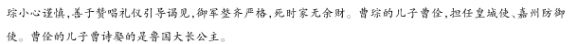 琮字宝章。兄珝,娶秦王女兴平郡主。琮幼时,从主入禁中,太宗置膝上,拊其背曰:“曹氏有功我家,此亦佳儿也。”及彬领镇海军节度使,补衙内都指挥使。彬卒,时迁西头供奉官、阁门祗候、勾当骐骥院、群牧估马司,市马课有羡,再迁西上阁门副使。与曹利用连姻利用贬出为河阳兵马都监领内军器库迁东上阁门使荣州刺史仁宗册琮兄女为后礼皆琮主办除卫州团练使。琮因奏曰:“陛下方以至公属天下,臣既备后族,不宜冒恩泽,乱朝廷法。族人敢因缘请托,愿致于理。”时论称之。出为环庆路马步军总管、知邠州,迁秦州防御使、秦凤路副都总管兼知秦州。度羡材为仓廪,大积谷古渭、冀城。生羌屡入钞边,琮怀以恩信,击牛酾酒犒之,多请内属。宝元初南郊,召入侍祠。会元昊反,拜同州观察使,复知秦州,上攻、守、御三策。久之,兼同管勾泾原路兵马、定国军节度观察留后。刘平、石元孙败,关辅震恐。琮请籍民为义军,以张兵势,于是料简乡弓手数万人。贼寇山外,还天都,劫仪、秦属户。琮发骑士,设伏以待之,贼遂引去。琮欲诱吐蕃犄角图贼,得西川旧贾,使谕意。而沙州镇王子遣使奉书曰:“我本唐甥,天子实吾舅也。自党项破甘、凉,遂与汉隔。今愿率首领为朝廷击贼。”帝善琮策,改陕西副都总管、经略安抚招讨副使,拜步军副都指挥使。与夏竦屯鄜州,还为马军副都指挥使,以疾卒。帝临奠,后并出临丧,就第成服。赠安化军节度使兼侍中,谥忠恪。琮小心谨畏,善赞谒,御军整严,死时家无余赀。子佺,皇城使、嘉州防御使。佺子诗,尚鲁国大长公主。 (结算自《宋史 曹琮传》) 4.下列对文中画波浪线部分的断句,正确的一项是(3分) A.与曹利用连姻/利用贬出/为河阳兵马都监/领内军器库/迁东上阁门使/荣州刺妙仁宗册踪兄女/为后礼皆琮主办/除卫州团练使/ B.与曹利用连姻/利用贬/出为河阳兵马都监/领内军器库/迁东上阁门使/荣州刺史/仁宗册琮兄女/为后礼皆琮主办/除卫州团练使/ C.与曹利用连姻/利用贬出/为河阳兵马都监/领内军器库/迁东上阁门使/荣州刺史/仁宗册踪兄女为后/礼皆琮主办/除卫州团练使/ D.与曹利用连姻/利用贬/出为河阳兵马都监/领内军器库/迁东上阁门使/荣州刺史/仁宗册琮兄女为后/礼皆琮主办/除卫州团练使/ 5.下列对文中加点词语的相关内容的解说,不正确的一项是(3分) A.关辅指陕西中部一带,“关”即关中,主要指今陕西;“辅”即裘辅,原指长安京盛地区。 B.天子与殿下、万岁、圣上等都是对皇帝的尊称,说皇帝是天子,意在强调君权的正统性。 C.党项是我国古代的少数民族之一,其首领元吴建立了西夏政权,与北宋和辽并立,常发生争端。 D.公主是中国占代对皇女、王女、宗女的封号或敬称,公主下嫁常称“适”迎娶公主则称“尚”。 6.下列对原文有关内容的概括和分析,不正确的一项是(3分) A.曹琮为政有方,为人品正廉直。他负责马市,征税有功,获得升迁;他自己严守津法,也不允许家族中人彻私情,死时家无余财。 B.曹琮善于治军,很有军事才干。他御军快齐严格,多次担任军事要职.掌管兵马;当贼军侵犯,他以奇兵设伏,迫使贼兵退去。 C.曹琮治边有术,措施富有成效,他首知秦州,建仓储粮,安抚羌民;再知秦州,他加强军备,通过商人联合沙州镇王子击败了贼兵。 D.曹琮出身富贵,深受皇帝垂爱。他出身官宦,且是皇亲国戚;他年幼曾人宫,受到太宗赞誉;他死后,皇帝皇后亲临祭奠。 7.把文中横线的句子翻译成现代汉语。(10分) (1)生羌屡入钞边,琮怀以恩信,击牛酾酒犒之,多请内属。 (2)琮请籍民为义军,以张兵势,于是料简乡弓手数万人。 参考答案 4.D 与曹利用连姻,利用贬,出为河阳兵马都监,领内军器库,迁东上阁门使、荣州刺史。仁宗册琮兄女为后,礼皆琮主办,除卫州团练使。 5.B 殿下不是对皇帝的尊称 6.C 原文没有说明是否击败贼兵 7. ![]() ![]()