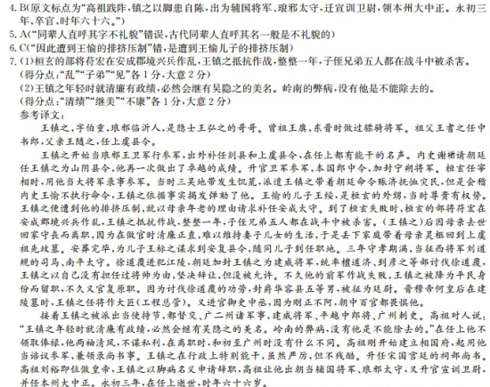 王镇之,字伯重,琅邪临沂人,征士弘之兄也。曾祖廙,晋骠骑将军。祖耆之,中书郎。父随之,上虞令。 镇之初为琅邪王卫军行参军,出补剡、上虞令,并有能名。内史谢輶请为山阴令,复有殊绩。迁卫军参军,本国郎中令,加宁朔将军。桓玄辅晋,以为大将军录事参军。时三吴饥荒,遣镇之衔命赈恤,而会稽内史王愉不奉符旨,镇之依事纠奏。愉子绥,玄之外甥,当时贵盛,镇之为所排抑,以母老求补安成太守。及玄败,玄将苻宏寇乱郡境,镇之拒战弥年,子弟五人,并临阵见杀。母忧去职,在官清洁,妻子无以自给,乃弃家致丧还上虞旧墓。葬毕,为子标之求安复令,随子之官。服阕,为征西道规司马、南平太守。徐道覆逼江陵,加镇之建威将军,统檀道济、到彦之等讨道覆,以不经将帅,固辞,不见听。既而前军失利,白衣领职,寻复本官。以讨道覆功,封华容县五等男,征廷尉。晋穆帝何皇后山陵,领将作大匠。迁御史中丞,秉正不挠,百僚惮之。 出为使持节、都督交广二州诸军事、建威将军、平越中郎将、广州刺史。高祖谓人曰:“王镇之少著清绩,必将继美吴隐之。岭南之弊,非此不康也。”在镇不受俸禄,萧然无所营。去官之日,不异始至。高祖初建相国府,以为谘议参军,领录事。善于吏职,严而不残。迁宋台祠部尚书。高祖践阼镇之以脚患自陈出为辅国将军琅邪太守迁宣训卫尉领本州大中正永初三年卒官时年六十六。 4.下列对文中画波浪线部分的断句,正确的一项是(3分) A.高祖践阼/镇之以脚患自陈出/为辅国将军/琅邪太守/迁宣训卫尉领/本州大中正/永初三年/卒官/时年六十六 B.高祖践阼/镇之以脚患自陈/出为辅国将军/琅邪太守/迁宣训卫尉/领本州大中正/永初三年/卒官/时年六十六 C.高祖践阼/镇之以脚患自陈/出为辅国将军/琅邪太守迁宣训卫尉/领本州大中正/永初三年/卒官/时年六十六 D.高祖践阼/镇之以脚患自陈出/为辅国将军/琅邪太守迁宣训卫尉/领本州大中正/永初三年/卒官/时年六十六 5.下列对文中加点词语的相关内容的解说,不正确的一项是(3分) A.字,古人成年所取,与名在意义上一般是有关联的,同辈人直呼其字不礼貌。 B.母忧意思是母亲的丧事,中国古代朝廷官员在位期间,如若父母去世,须辞官回家守孝。 C.男,指男爵,我国春秋时期有“公、侯、伯、子、男”五等爵位。 D.高祖是庙号,庙号是皇帝死后,在太庙立室奉祀时特起的名号。 6.下列对原文有关内容的概括和分析,不正确的一项是(3分) A.王镇之初进仕途,成绩显著。他担任琅邪王卫军行参军和出外任剡县、上虞县令时,都获得很好的名声;他任山阴县令时,也特别能干。 B.王镇之经验不足,作战失利。朝廷让他统率军队讨伐徐道覆,他以自己没有担任过将帅为由,坚决辞让,但没被允许;不久就被打败,削职为平民。 C.王镇之刚正不阿,不惧权贵。他到三吴去赈济灾民,弹劾了不执行命令的会稽内史王愉,因此遭到王愉的排挤压制;他任御史中丞,朝中百官都畏惧他。 D.王镇之为官清廉,不谋私利。他生活清贫,有时连妻子儿女的基本生活都难以维持;在镇守交、广二州的官位上,他不领俸禄,两袖清风。 7.把文中画横线的句子翻译成现代汉语。 参考答案 4.B 高祖践阼,镇之以脚患自陈,出为辅国将军、琅邪太守、迁宣训卫尉,领本州大中正。永初三年,卒官,时年六十六。 5.A 同辈人直呼其字不礼貌 错误,古代同辈人直呼其名一般是不礼貌的 6.C 遭到王愉的排挤压制错,是遭到王愉儿子的排挤压制。 ![]() 参考译文 王镇之字伯重,琅笽临沂人,是隐士王弘之的哥哥,曾祖王訥,是晋代的骠骑将军。祖父王耆之是中书郎,父亲王随之,是上虞县令。 王镇之开始当琅笽王卫军行参军,出外补任剡县和上虞县令,在任上都有能干的名声。内史谢车酋请王镇之当山阴县令,他再一次作出了特别的成绩。升官卫军参军,本国郎中令,加号宁朔将军。桓玄辅佐晋朝,用他当大将军录事参军。当时三吴发生饥荒,派遣王镇之带着朝廷命令赈济灾民,但是会稽内史王愉不接受圣旨,王镇之按法律弹劾了他。王愉的儿子王绥,是桓玄的外甥,当时是非常显赫的人物。王镇之便遭到他的排挤。王镇之因为母亲年老便以此作为借口请求补任安成太守,到了桓玄失败时,桓玄的部将苻宏侵略本郡边境,王镇之抵抗了一年多,兄弟子侄五人都在战斗中牺牲。母亲去世他就离职,因为在做官时清廉正直,他的妻子儿女无法得到完全的物质供应。于是丢下家庭带着母亲灵柩回到上虞祖先坟墓,安葬完毕,为儿子王标之请求任安彳复县令,随同儿子到任上做官。三年守孝期满,当征西将军刘道规的司马,南平太守。徐道覆进逼江陵。朝廷增加王镇之建威将军的官号,统率檀道济、到彦之等人讨伐徐道覆,王镇之因为未搞过军事,坚决辞让,但没被允许。既而他的先锋将军打败了。王镇之以大兵身份兼任官职,不久又恢复官职。因为讨伐徐道覆的功劳,封爵华容县五等男、被征为廷尉。晋穆帝何皇后在建陵墓时,王镇之任将作大匠(工程总管),又进官御史中丞。因为刚正不阿,朝中百官都怕他。 接着王镇之出外当使持节,都督交广二州诸军事,建威将军、平越中郎将、广州刺史。高祖对人说:“王镇之青年便建立清廉名誉,他必定会成为吴隐之之后最好的官吏。岭南的弊病必定会一洗干净。”在任上不接受俸禄,离开广州时,和初至广州时几乎一样干净。高祖刚开始建立相国府,用他当谘议参