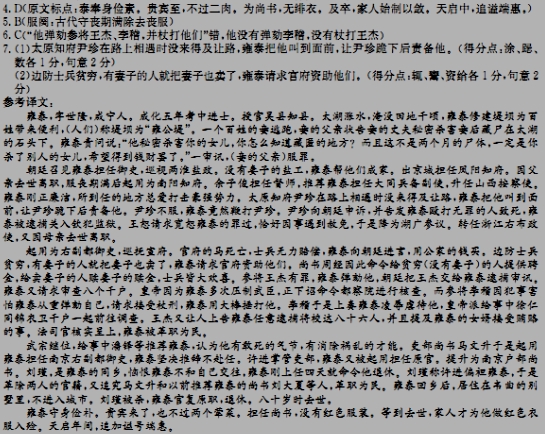 雍泰,字世隆,咸宁人。咸化五年进士。雍泰,字世隆,咸宁人。成化五年进士。除吴县知县。太湖涨,没田千顷,泰作堤为民利,称“雍公堤”。民妾亡去,妾父讼其夫密杀女匿尸湖石下。泰诘曰:“彼密杀汝女,汝何以知匿所。且此非两月尸,必汝杀他人女,冀得赂耳。”一考而服。 召为御史,巡盐两淮。灶丁①无妻者,泰为婚匹。出知凤阳府。父忧去,服阕起知南阳。余子俊督师,荐为大同兵备副使,擢山西按察使。泰刚廉,所至好搏击豪强。太原知府尹珍涂遇弗及避,泰召至,跽而数之。珍不服,泰竟笞珍。珍诉于朝,且告泰非罪杖人死,逮下诏狱。王恕请宽泰罪,会事经赦,乃降湖广参议。转浙江右布政使,复以母忧去。 起右副都御史,巡抚宣府。官马死,军士不能偿,泰言于朝,以官帑市。边军贫,有妻者辄鬻,泰请官为资给。尚书周经因令贫者给聘财,典卖者收赎,军尽欢。参将王杰有罪,泰劾之,下泰逮问。泰又请按千户八人,帝以泰屡抑武臣,方诏都察院行勘。而参将李稽坐事畏泰重劾,乞受杖,泰取大杖决之。稽乃奏泰凌虐,帝遣给事中徐仁偕锦衣千户往按。杰复使人讼泰妄逮将校至八十六人,并及其婿纳赂事。法司核上,褫②为民。 武宗立,给事中潘铎等荐泰有敢死之节,克乱之才。吏部尚书马文升遂起泰南京右副都御史,固辞不赴。许进为吏部,复起前官。擢南京户部尚书。刘瑾,泰乡人也,怒泰不与通,甫四日即令致仕。谓进私泰,遂削二人籍,而追斥马文升及前荐泰者尚书刘大夏等为民。泰归,居韦曲别墅,不入城市。瑾诛,复官,致仕。年八十卒。 泰奉身俭素贵宾至不过二肉为尚书无绯衣及卒家人始制以敛天启中追谥端惠。 【注】①灶丁:盐工。②褫(chǐ):褫夺,革除。 4.下列对文中画波浪线部分的断句,正确的一项是( A.泰奉身/俭素贵宾至/不过二肉/为尚书/无绯衣/及卒/家人始制以敛/天启中/追谥端惠/ B.泰奉身/俭素贵宾至/不过二肉/为尚书/无绯衣及/卒家人始制以敛/天启中/追谥端惠/ C.泰奉身俭素/贵宾至/不过二肉/为尚书/无绯衣及/卒家人始制以敛/天启中/追谥端惠/ D.泰奉身俭素/贵宾至/不过二肉/为尚书/无绯衣/及卒/家人始制以敛/天启中/追谥端惠/ 5.下列对文中加点词语的相关内容的解说,不正确的一项是( A.进士:中国古代科举制度中,会试考取后,通过中央政府最后一级考试的人,称为进士。 B.服阕:古代居丧时穿丧服。古代官员如父母去世,必须辞官回家,为父母守孝。 C.户部:古代六部之一,掌管土地、户籍、赋税、俸禄等职事,长官为户部尚书。 D.致仕:本义是将享受的禄位交还给君王,表示官员辞去官职或到规定年龄而离职。 6.下列对原文有关内容的概括和分析,不正确的一项是( A.雍泰关心百姓,体恤民情。他在吴县任职时,太湖涨水淹没田地,他修堤坝使百姓受益;他任御史时,帮助没有妻子的盐工成家。 B.雍泰性格烈,判断力强。他任按察使时,曾因鞭笞下属而被告到朝廷,之后被逮捕下狱,最终被降职;有杀人者企图蒙骗他,结果被他识破。 C.雍泰尽心尽职,为政务实。官马死亡,士兵不能赔偿,他想办法解决;他弹劾参将王杰、李稽,并杖打他们,遭到反击而被削职为民。 D.雍泰不阿谀权贵,遭到报复。他和刘瑾是同乡,但他不巴结刘瑾,刘瑾革除他和许进的官籍,而曾经赏识过他的马文升等人也受到牵连。 7.把文中画横线的句子翻译成现代汉语。 (1)太原知府尹珍涂遇弗及避,泰召至,跽而数之。 (2)边军贫,有妻者辄鬻,泰请官为资给。 参考答案 4.D(原文标点“泰奉身俭素。贵宾至,不过二肉。为尚书,无绯衣。及卒,家人始制以敛。天启中,追谥端惠。) 5.B(“古代居丧时穿丧服”错,应是古代守丧期满除去丧服) 6.C(“他弹劾参将王杰、李稽,并杖打他们"错,他没有弹劾李稽,没有杖打王杰) 7.(1)太原知府尹珍在路上相遇时没来得及让路,雍泰把他叫到面前,站他跪下责备他。 (2)边防士兵贫穷,有妻子的人就把妻子也卖了,雍泰请求官府资助他们。 ![]() 参考译文 雍泰,字世隆,咸宁人。成化五年中进士。授官吴县知县。太湖涨水淹没田地千顷,雍泰修建堤坝爲人民带来便利,称爲“雍公堤”。一个百姓的妾逃跑,妾父状告她的丈夫把她秘密杀害后藏尸于太湖的石头下。雍泰责问他説:“他秘密杀害你的女儿,你怎麽知道藏匿的地方?而且这并非两个月的尸首,一定是你杀了别人的女儿,希望得到钱财罢了。”一审讯,罪犯果然服罪。 召任御史,巡察两进盐政。没有妻子的盐工,雍泰帮他们成家。出任凤阳知府。因父亲去世离职,服丧期满后起用爲南阳知府。余子俊督师,推荐雍泰爲大同兵备副使,升任山西按察豪强势力。太塬知府尹珍与他在路上相遇时没来得及让路,雍泰便把他叫到面前,令尹珍跪下后责备他。尹珍不服,雍泰竟鞭打他。尹珍上诉朝廷,并告发雍泰殴打无罪的人致死。雍泰被逮捕入钦犯监狱。王恕请求饶恕雍泰,恰逢因事遇赦,便降职湖广参议。弘治四年,转任浙江右布政使,又因母亲去世离职。 起用任右副都御史,巡抚宣府。官府的马死亡,边防兵士无力赔偿,雍泰便向朝廷进言,用公家的钱买马。边防士兵贫困,有妻的人穷得把妻子也卖了,雍泰请求官府资助他们。尚书周经因此命令给没有妻室的贫困士兵提供聘金,给典卖妻子的士兵赎妻的赎金,军士皆大欢喜。参将王杰有罪,雍泰弹劾他,朝廷将王杰交给雍泰逮捕审讯。雍泰又请求审察千户八人。皇帝因雍泰多次压制武臣,正命