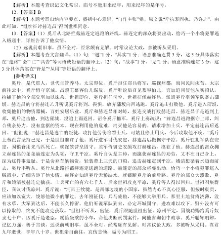 奚斤,代人也,世典马牧。太宗即位为郑兵将军循行州郡问民疾苦太宗幸云中斤留守京师昌黎王慕容伯儿反斤闻而召伯儿穷问款引悉收其党诛之世祖即位,为司空。世祖征赫连昌,遣斤率兵袭蒲坂。昌守将 赫连乙升闻斤将至,惧,弃蒲坂西走。斤追败之。斤入蒲坂,收其资器,百姓安业。与赫连昌相持,累战破昌。昌遂走上邦,斤追之,至雍,不及而还。诏斤班师,斤上疏曰:“赫连昌亡保上邦,鸠合余烬,未有盘据之资。今因其危,灭之为易。请益铠马,平昌而还。”世祖曰:“昌亡国叛夫,击之劳伤将士,且可息兵,取之不晚。”斤抗表固执,乃许之。斤进讨安定,昌退保平凉。斤屯军安定,以粮竭马死,遂深垒自固。监军侍御史安颉击昌,擒之。昌众复立昌弟定为主,守平凉。斤自以元帅,而擒昌之功,更不在己,深耻之。乃舍辎重,轻赍三日粮,追定于平凉。娥清欲寻水而往,斤不从。斤自北道邀其走路。定众将出,会一小将有罪亡入贼,具告其实。定知斤军无粮乏水,乃邀斤前后。斤众大溃,斤及娥清为定所禽,士卒死者六七千人。后世祖克平凉,斤等得归。世祖大集群臣,议伐凉州。斤曰:“河西王牧犍,西垂下国,虽内不纯臣,而外修职贡,宜加宽宥,恕其微愆。去岁新征,士马疲弊,未可大举。其地卤薄,略无水草,大军既到,不得久停。彼闻军来,必婴城固守。攻则难拔,野无所掠,终无克获。”世祖不从,征之,斤随世祖征。凉州平,以战功赐僮隶七十户。以斤元老,赐安车,平决刑狱,谘访朝政。斤聪辩强识,善于谈论,远说先朝故事,虽未皆是,时有所得。每议大政,多见从用。真君九年薨,时年八十。世祖亲临哀恸,谥曰昭王。 10.下列对文中画波浪线部分的断句,正确的一项是(3分) A.太宗即位/为郑兵/将军循行州郡/问民疾苦/太宗幸云中/斤留守京师/昌黎王慕容伯儿反/斤闻而召伯儿/穷问款引/悉收其党诛之/ B.太宗即位/为郑兵/将军循行州郡/问民疾苦/太宗幸云中/斤留守京师/昌黎王慕容伯儿反斤/闻而召伯儿/穷问款引/悉收其党诛之/ C.太宗即位/为郑兵将军/循行州郡/问民疾苦/太宗幸云中/斤留守京师/昌黎王慕容伯儿反斤/闻而召伯儿/穷问款引/悉收其党诛之/ D.太宗即位/为郑兵将军/循行州郡/问民疾苦/太宗幸云中/斤留守京师/昌黎王慕容伯儿反/斤闻而召伯儿/穷问款引/悉收其党诛之/ 11.下列对文中加点词语的相关内容的解说,不正确的一项是(3分) A.司空,是中国古代官职名称,和成语“司空见惯”中的“司空”意思相同。 B.疏,是古代臣属进呈帝王的奏章类文章,此类文章还包括表、对策、封事等。 C.世祖,是我国古代帝王的庙号之一。一般认为庙号起源于商朝,庙号有时用来纪年。 D.职贡,上贡赋税,指藩属国或外国对于朝廷按时的贡纳。按时职贡表示臣服。 12.下列对原文有关内容的概括和分析,不正确的一项是(3分) A.奚斤追随世祖征讨,立有大功。他率领军队击败了赫连昌的守将赫连乙升,后又与赫连昌对峙,多次击败赫连昌,迫使赫连昌逃到上邦。 B.奚斤坚持自己主张,有违君命。世祖诏令他班师回朝,他却上奏认为应该趁机追击;世祖要求停止用兵,他却自作主张继续征讨赫连昌。 C.奚斤身为统军主帅,刚愎自用。他以赫连昌被他人擒获为可耻,于是舍弃辎重,轻装上阵,追击赫连定,但没有听从下属建议而遭致失败。 D.奚斤深受世祖赏识,恩惠优渥。凉州平定后,他因战功受赏奴隶七十户;因是朝中老臣,他被赐给小车;他去世后,世祖亲自前往吊唁。 13.把文中画横线的句子翻译成现代汉语。(10分) (1)斤自北道邀其走路。定众将出,会一小将有罪亡人贼,具告其实。(5分) (2)远说先朝故事,虽未皆是,时有所得。每议大政,多见从用。(5分) 参考答案 10、D 为郑兵将军 郑兵 将军之间不能断开 闻而召伯儿的主语是斤 原文意思是说慕容伯儿谋反,而不是反斤。 11、C