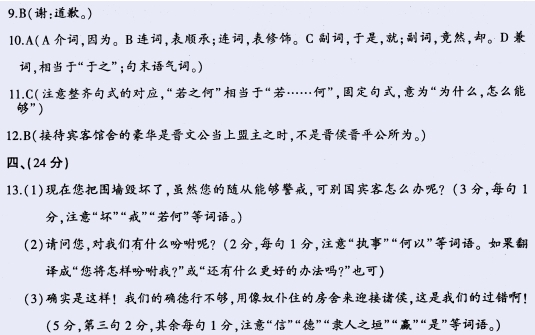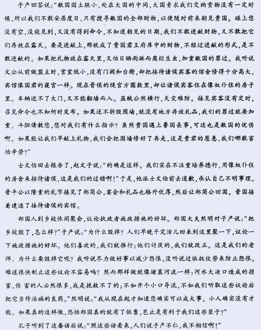 公①薨之月,子产相郑伯以如晋,晋侯②以我丧故,未之见也。子产使尽坏其馆之垣而纳车马焉。士文伯让之曰:“敞邑以政刑之不修,寇盗充斥,是以令吏人完客所馆,高其阚闳,厚其墙垣,以无忧客使。今吾子坏之,虽从者能戒,其若异客何?以敞邑之为盟主,缮完葺墙,以待宾客。若皆毁之,其何以共命?寡君使匄③请命。” 对曰:“以敝邑褊小,介于大国,诛求无时,是以不敢宁居,悉索敝赋,以来会时事。逢执事之不闲,而未得见,又不获闻命,未知见时,不敢输币,亦不敢暴露。其输之,则君之府实也,非荐陈之,不敢输也。其暴露之,则恐燥湿之不时而朽蠹,以重敝邑之罪。侨④闻文公之为盟主也,宫室卑庳,无观台榭,以崇大诸侯之馆,馆如公寝。今缇之宫数里,而诸侯舍于隶人。门不容车,而不可逾越。盗贼公行,而天疠不戒。宾见无时,命不可知。若又勿坏,是无所藏币,以重罪也。敢请执事,将何以命之?虽君之有鲁丧,亦敝邑之忧也。若获荐币,修垣而行,君之惠也,敢惮勤劳?” 文伯复命,赵文子曰:“信!我实不德.而以隶人之垣以赢诸侯,是吾罪也。”使士文伯谢不敏焉。晋侯见郑伯有加礼,厚其宴好而归之。乃筑诸侯之馆。 郑人游于乡校⑤,以论执政。然明谓子产曰:“毁乡校,何如?”子产曰:“何为?夫人朝夕退而游焉,以议执政之善否。其所善者吾则行之其所恶者吾则改之是吾师也若之何毁之我闻忠善以损怨不闻作威以防怨。岂不遽止?然犹防川:大决所犯,伤人必多,吾不克救也;不如小决使道,不如吾闻而药之也。”然明日:“蔑⑥也今而后知吾子之信可事也。小人实不才。若果行此,其郑国实赖之,岂唯二三臣?” 仲尼闻是语也,曰:“以是观之,人谓子产不仁,吾不信也。” 【注】①公:指鲁襄公。②晋侯:指晋平公。③匄:士文伯名。④侨:子产名。⑤乡校:古时乡间的公共场所,既是学校,又是乡人聚会议事的地方。⑥葭,然明的名。 9.对下列句子中加点的词的解释。不正确的一项是 A.不敢输币 B.使士文伯谢不敏焉 C.然犹防川 D.不如小决使道 10.下列各组句子中,加点词的意义和用法相同的一项是 A.晋侯以我丧故 B.若获荐币,修垣而行 C.乃筑诸侯之馆 D.夫人朝夕退而游焉 11.下列对文中画波浪线部分的断句,正确的一项是 A.其所善者/吾则行/之其所恶者/吾则改/之是吾师也/若之何毁之/我闻忠善以损怨/不闻作威以防怨 B.其所善者/吾则行力其所恶者/吾则改力是吾师也若力何毁力我闻忠善以损/怨不闻 C.其所善者/吾则行杉其所恶者/吾则改力是吾师也/若之何毁力我闻忠善以损怨/不闻作威以防怨 D.其所善者/吾则行之/其所恶者/吾则改之/是吾师也若之/何毁之/我闻忠善以损怨/不闻作威以防怨 12.下列对原文有关内容的理解与分析,表述不正确的一项是 A.子产辅佐郑伯到晋国去献贡物,因晋侯没有接见,子产派人拆毁了晋国客舍的围墙,因此受到了晋国大夫士文伯的责备。 B.子产以晋侯当上盟主前后接待宾客馆舍的豪华与寒酸形成对比,有力地批评了晋侯的傲慢做法,使得对方态度陡然转变。 C.子产以河流宜疏不宜堵作比,论述了乡校在百姓议政方面的重要作用,他认为保留乡校有利于倾听民意,解决一些政治问题。 D.本文通过子产坏晋馆垣和不毁乡校的故事,表现了其在外交上维护本国尊严的政治智慧以及在内政上重视舆情的政治眼光。 13.把文言文阅读材料中画横线的句子翻译成现代汉语。(10分) (1)今吾子坏之,虽从者能戒,其若异客何?(3分) (2)敢请执事,将何以命之?(2分) (3)信!我实不德,而以隶人之垣以赢诸侯,是吾罪也。(5分) 参考答案 9、B 10、A 11、C 12、B ![]() 参考译文 鲁襄公死去的那个月,子产辅佐郑简公到晋国去,晋平公因为鲁国有丧事的缘故,没有接见他们。子产派人把宾馆的围墙全部拆毁,把自己的车马放进去。晋国大夫士文伯责备子产说:“敝国由于政事和刑罚没有搞好,到处是盗贼,不知道对辱临敝国的诸侯属官怎么办,因此派了官员修缮来宾住的馆舍,馆门造得很高,围墙修得很厚,使宾客使者不会感到担心。现 在您拆毁了围墙,虽然您的随从能够戒备,那么对别国的宾客怎么办呢?由于敝国是诸侯的盟主,修建馆会围墙,是用来接待宾客。如果把围墙都拆了,怎么能满足宾客的要求呢?我们国君派我来请问你们拆墙的理由。”子产回答说:“敝国国土狭小,处在大国的中间,大国责求我们交纳贡物没有一定时候,所以我们不敢安居度日,只有搜寻敝国的全部财物,以便随时前来朝见贵国。碰上您没有空,没能见到,又没有得到命令,不知道朝见的日期。我们不敢进献财物,又不敢把它们存放在露天。 要是进献上,那就成了贵国君王府库中的财物,不经过进献的丁式,是不敢进献的。如果把礼物放在露天里,又怕日晒雨淋而腐烂生虫,加重敝国的罪过。我听说文公从前做盟主时,宫室低小,没有门阙和台榭,”却把接待宾客的馆舍修得十分高大,宾馆像国君的寝宫一样。仓库和马棚也修得很好,司空按时平整道路,泥水工匠按时粉刷馆舍房间;诸侯的宾客来到,甸人点起庭院中的火把,仆人巡视客舍,存放车马有地方,宾客的随从有代劳的人员,管理车辆的官员给车轴加油,打扫房间的,伺养牲口的,各自照看自己份内的事;各部门的属官要检查招待宾客的物品;文公从不让宾客们多等,也没有被延误了的事;与宾客同忧共乐,出了事随即巡查,有不懂的地方就指教,有所要就加以接济。宾客到来就好像回到家里一