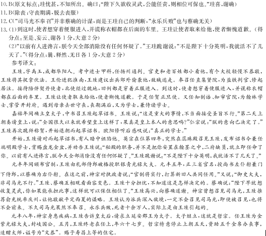 王珪,字禹玉,成都华阳人。举进士甲科,通判扬州。吏民皆少硅,有大校熳不谨,摔置之法。王伦犯淮南,珪议出郊掩击之,贼遁去。召直集贤院,为盐铁判官、修起居注。接伴契丹使,北使过魏,旧皆盛服入。至是,欲便服,妄云衣冠在后乘。珪命取授之,使者愧谢。遂为贺正旦使。进知制诰、知审官院,为翰林学士、知开封府。遭母忧,除丧,复为学士,兼待读学士。 嘉祐立皇子,中书召珪作诏,珪曰:“此大事也,非面受旨不可。”明日请对,曰:“海内望此举久矣,果出自圣意乎?”仁宗曰:“朕意决矣。”珪再拜贺,始退而草诏。欧阳修闻而叹曰:“真学士也。” 始,珪之请对而作诏也,有密谮之者。英宗在位之四年,忽召至蕊珠殿,传诏令兼端明殿学士,锡之盘龙金盆,谕之日:“秘殿之职,非直器卿予翰墨间,二府员缺,即出命矣。曩有谗口,朕今释然无疑。”珪谢曰:“非陛下至明,臣死无日矣。” 元丰官制行,由礼部侍郎超授银青光禄大夫。五年,正三省官名,拜尚书左仆射兼门下侍郎,以蔡确为右仆射。先是,神宗谓执政曰:“官制将行,欲新旧人两用之。”又曰:“御史大夫,非司马光不可。”珪、确相顾失色。珪忧甚不知所出确曰陛下久欲收灵武公能任责则相位可保也珪喜谢确帝尝欲召司马光,珪荐俞充帅庆,使上平西夏策。珪意以为既用兵深入,必不召光,虽召,将不至。已而光果不召。永乐之败,死者十余万人,实珪启之。 八年,帝有疾,珪白皇太后,请立延安郡王为太子。太子立,是为哲宗。进硅金紫光禄大夫,封岐国公。五月,卒于位,年六十七。特辍朝五日,赙金帛五千,赠太师,谥日文恭。赐寿昌甲第。 (节选自《宋史·王珪传》,有删改) 10.下列对文中画波浪线部分的断句,正确的一项是(3分) A.珪忧甚/不知所出/确日/陛下久欲收灵武公/能任责/则相位可保也/珪喜/谢确/ B.珪忧甚/不知所出/确日/陛下久欲收灵武/公能任责/则相位可保也/珪喜/谢确/ C.珪忧甚/不知所出确/日/陛下久欲收/灵武公能任责/则相位可保也/珪喜/谢确/ D.珪忧甚/不知所出/确日/陛下久欲收/灵武公能任责/则相位可保也/珪喜/谢确/ 11.下列对文中加点词语的相关内容的解说,不正确的一项是(3分) A.进士,中国古代科举制度中,会试考取后通过中央政府最后一级考试的人称为进士。 B.除丧,古代居丧期穿丧服。古时官员遇父母去世,须辞官守丧。期满后才可复职。 C.超授,升迁,亦指越等授官。“进知制诰”中的“进”在文中指“晋升’9‘‘提拔任用”。 D.卒,古代指大夫死亡。王珪为金紫光禄大夫,封岐国公。所以他的死被称为“卒”。 12.下列对原文有关内容的概括和分析,不正确的一项是(3分) A.王珪担任扬州通判时,很多官吏和百姓都小看他,有个大校对他态度十分轻慢,王珪将他捉拿伏法。 B.王珪做事坚持原则。嘉祐年间确立太子,中书召王珪起草诏书。王珪认为须当面接受圣旨。得到仁宗答复才起草。被欧阳修高度称赞。 C.王珪妒嫉司马光受宠。他担忧司马光受宠而威胁自己的相位,于是听从蔡确的计谋让司马光不奉召,造成永乐兵败,死者十余万人。 D.王珪拥立哲宗受到优待。神宗患病,王珪请求拥立哲宗。王珪被赏官封爵。死时,哲宗特意停止上朝,追赠太师,赐予上等住宅。 13.把文中画横线的句子翻译成现代汉语。(10分) (1)至是,欲便服,妄云衣冠在后乘。珪命取授之,使者愧谢。(5分) (2)“曩有谗口,朕今释然无疑。”珪谢曰:“非陛下至明,臣死无日矣。”(5分) 参考答案 10、B 11、B 12、C 13、(1)到这时,使者想穿着便服进入,并谎称衣帽都在后面的车里。王珪让使者取来给他,使者惭愧道歉。 (2)以前有人进谗言,朕今天全部消除都没有任何怀疑了。王珪跪谢说:“不是陛下十分英明,我就活不了几天了。 ![]()