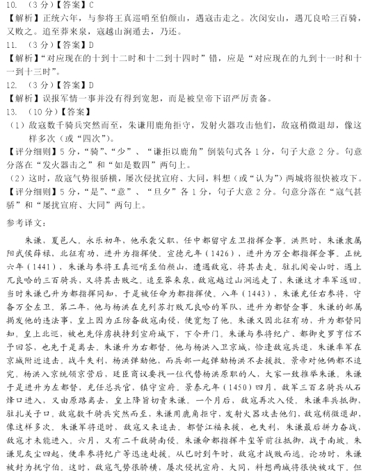 朱谦,夏邑人。永乐初,袭父职,为中都留守左卫指挥佥事。洪熙时,隶阳武侯薛禄,征北有功,进指挥使。宣德元年进万全都指挥佥事。正统六年与参将典王真巡哨至伯颜山遇寇击走之次闵安山遇兀良哈三百骑又败之追至莽来泉寇越山涧遁去乃还时谦已迁都指挥同知,乃以为都指挥使。八年充右参将,守备万全左卫。明年与杨洪破兀良哈兵于克列苏,进都督佥事。所部发其不法事,帝以方防秋,宥之。复以北征功,进都督同知。帝北狩①,也先拥至宣府城下,令开门。谦与参将纪广、都御史罗亨信不应,遂去。进右都督。与杨洪入卫,会寇已退,追袭之近畿。战失利,洪助之。兵部并助洪不救。景帝俱弗问。洪入总京营,廷议欲得如洪者代之,咸举谦。乃进左都督,充总兵官,镇守宣府。景泰元年四月,寇三百骑入石烽口,复由故道去,降敕切责。逾月,复入犯。谦率兵御之,次关子口。寇数千骑突至,谦拒以鹿角,发火器击之,寇少却,如是数四。谦军且退,寇复来追。都督江福援之,亦失利。谦卒力战,寇不得入。六月复有二千骑南侵。谦遣都指挥牛玺等往御,战南坡。谦见尘起,率参将纪广等驰援。自巳至午,寇败遁。论功,封抚宁伯。是时,寇气甚骄,屡扰宣府、大同,意二城且旦夕下。而谦守宣府,郭登守大同,数挫其众。也先知二人难犯,始一意归上皇。八月,上皇还。道宣府,谦率子永出见,厚犒其使者。既而谦谬报寇五千骑毁墙入。察之,则也先贡使也。诏切责之,谦惶恐谢。明年二月,卒于镇。谦在边久,善战。然勇而寡谋,故其名不若杨洪、石亨、郭登之著。成化中,谧武襄。 (节选自《明史·朱谦传》) 【注】①帝北狩:英宗北巡时被也先俘虏,英宗之弟登基称帝,遥尊英宗为上皇。 10.下列对文中画波浪线部分的断句,正确的一项是(3分) A.正统六年/与参习寻王真巡哨至伯颜山遇/寇击走之/次阂安山/遇兀良哈三百骑/又败之/追至莽来泉/寇越山涧遁去/乃还 B.正统六年/与参习寻王真巡哨至伯颜山/遇寇击走之/次阂安山/遇兀良哈三百骑/又败之/追至莽来泉/寇越山涧遁去乃还 C.正统六年/与参习寻王真巡哨至伯颜山/遇寇击走之/次阂安山/遇兀良哈三百骑/又败之/追至莽来泉/寇越山涧遁去/乃还 D.正统六年/与参习寻王真巡哨至伯颜山/遇寇击走之/次阂安山/遇兀良哈三百骑/又败之追至莽来泉/寇越山涧遁去/乃还 11.下列对文中加点词语的相关内容的解说,不正确的一项是(3分) A.“畿”指京城所管辖的地区,所以“近瓷”指京城附近,“京瓷”指国都及其附近的地方。 B.兵部是古代中央政府尚书省管辖下的六部之一,掌管军事,相当于现在的国防部。 C.汉时凡尊长或官长告诫子孙或僚属,皆称救,南北朝后专指皇帝诏书。“制”浩”也可指帝王的命令。 D.古人用地支纪时,“巳”和“午”是地支的第六位和第七位,对应现在的十到十二时和十二到十四时。 12.下列对原文有关内容的概括和分析,不正确的一项是(3分) A.朱谦是颇有作为的官家子弟,他虽然是通过承袭父亲的官职进入仕途的,但之后却是凭借他自己不断立下的战功步步晋升的。 B.朱谦对朝廷忠心耿耿,当英宗被挟持时,他没有中计打开城门,而当也先归还英宗时他率子出城拜见途经宣府的英宗,并重赏其使者。 C.朱谦勇猛善战,长时间驻守边防。他多次率领军队抵抗敌寇,奋力守城,最终让敌寇知道他是难以侵犯的,死后被赐溢号“武襄0 D.朱谦缺少谋略,为官生涯存在一些污点。他曾误报军情,习寻前来进贡的使者当作敌寇也曾被部下揭发做过不法之事,但都得到君王宽恕。 13.把文中画横线的句子翻译成现代汉语。(10分) (1)寇数千骑突至,谦拒以鹿角,发火器击之,寇少却,如是数四。 (2)是时,寇气甚骄,屡扰宣府、大同,意二城且旦夕下。 参考答案 10、C 11、D 12、D 13、(1)敌寇数千骑兵突然而至,朱谦以鹿角阻止敌军前进,又发火器攻击,敌寇稍微后退,就这样重复了四次。 (2)这时,敌寇气势十分嚣张,屡次骚乱宣府、大同,希望很快攻下二城。 ![]() 参考译文 朱谦,夏邑人。永乐初年,他承袭父职,为中都留守左卫指挥佥事。洪熙时,朱谦隶属阳武侯薛禄,北征有功,进升为指挥使。宣德元年(1426),进升为万全都指挥佥事。 正统六年(1441),朱谦与参将王真巡哨至伯颜山,遭遇敌寇,将其击走。驻扎闵安山时,遇上兀良哈的三百骑兵,又将其击败之。追至莽来泉,敌寇越过山涧逃走了,朱谦这才率军返回。当时朱谦已升为都指挥同知,于是被任命为都指挥使。 八年(1443),朱谦充任右参将,守备万全左卫。第二年,他与杨洪在克列苏打败兀良哈的军队,进升为都督佥事。朱谦的部属揭发他的违法事,皇上因为正需要防守的将领,便宽恕了他。朱谦又因北征有功,升为都督同知。 皇上北巡,也先拥着英宗来到宣府城下,下令开门。朱谦与参将纪广、都御史罗亨信不予回答,也先于是离去。朱谦升为右都督。他与杨洪入卫京城,恰逢敌寇兵退,朱谦率军在近畿追击。战斗失利,杨洪弹劾他,而兵部一起弹劾杨洪不去援救。景帝对他俩都不追究。杨洪入京统领京营后,廷臣商议要找一位代替杨洪原职的人,大家一致推举朱谦。朱谦于是进升为左都督,充任总兵官,镇守宣府。景泰元年(1450)四月,敌军三百名骑兵从石烽口进入,又由原路离去,皇上降旨切责朱谦。一个月后,敌寇再次入侵。朱谦率兵抵御,驻扎关子口。敌寇数千骑兵突至,朱谦以鹿角阻止敌军前进,又发火器攻击,敌寇稍微