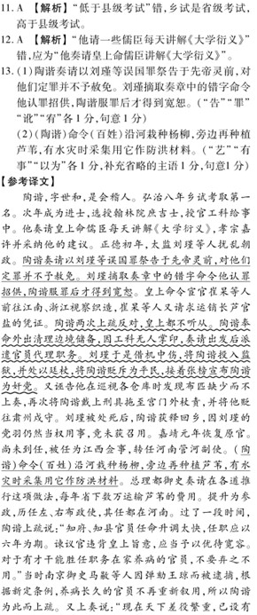 陶谐,字世和,会稽人。弘治八年乡试第一。明年成进士,选庶吉士,授工科给事中。请命儒臣日讲《大学衍义》,孝宗嘉纳之。正德改元,刘瑾等乱政。谐请以瑾等误国罪告先帝,罪之勿赦。瑾摘其讹字令对状,伏罪乃宥之。帝命中官崔杲等往江南、浙江织造,杲等复乞长芦盐引。谐再疏争皆不听谐当出理边储以工科掌印无人请俟行日遣官代署瑾遂中谐下诏狱廷杖斥为民旋榜为奸党又诬以巡视十库时缺布不奏,复械至阙下杖之,谪戍肃州。瑾诛,释还乡,其党犹用事,竟不获召。嘉靖元年复官。未至,除江西佥事,转河南管河副使。命沿河植柳,傍艺葭苇,有事采以为埽①。总理都御史请推行之诸道,岁省费钜万。迁参政,历左、右布政使,皆在河南。久之,疏言:“守令迁太骤,宜以六年为期。言官忤旨,当优容。养病官才力堪任者,毋终弃。”时南京御史马敭等劾王琼被逮,而新例养病久者率不复收叙,故谐以为言。又奏:“今天下差徭烦重。既有河夫、机兵、打手、富户、力士诸役,乃编审里甲,复征旷丁课及供亿诸费。乞皆罢免。”帝采纳之。 寻迁兵部右侍郎,总督两广军务。海寇陈邦瑞、许折桂等突入波罗庙,欲犯广州,为指挥李筜所蹙。邦瑞投水死,折桂还所执指挥二人,乞就抚。谐居折桂等东莞,编为总甲,使约束其党五百人为新民。兵部以降贼群聚,恐乘隙为变,令解散其党。琼山沙湾洞贼黎佛二等杀典史,谐复剿平。为总督三年,俘斩累万。九庙灾,自陈致仕归。卒,赠兵部尚书。隆庆初,谥庄敏。 (选自《明史·陶谐传》) 【注】埽(sào):把树枝、秫秸、石头等用绳子捆紧做成的圆柱形的东西,用以保护堤岸防水冲刷。 10.下列对文中画波浪线部分的断句,正确的一项是(3分) A.谐再疏/争皆不听/谐当出理边储/以工科掌印无人请/俟行日遣官代署/瑾遂中/谐下诏狱廷杖/斥为民/旋榜为奸党/ B.谐再疏/争皆不听/谐当出理边储/以工科掌印无人/请俟行日遣官代署/瑾遂中/谐下诏狱廷杖/斥为民/旋榜为奸党/ C.谐再疏争/皆不听谐/当出理边储/以工科掌印无人请/俟行日遣官代署/瑾遂中谐/下诏狱廷杖/斥为民/旋榜为奸党/ D.谐再疏争/皆不听/谐当出理边储/以工科掌印无人/请俟行日遣官代署/瑾遂中谐/下诏狱廷杖/斥为民/旋榜为奸党/ 11.下列对文中加点同语的相关内容的解说,不正确的一项是(3分) A.乡试是中国古代科举考试之一,低于县级考试,中试者为举人,第一名叫解元。 B.中官是古代专供皇帝、君主及其家族成员役使的官员,又称太监、宦官或阉人。 C.里甲是明代社会基层组织,里甲设里长,里长负责征收粮税、监督生产等事宜。 D.九庙是古时帝王的祖庙,本为七庙,王莽当政时又增加两庙,后历朝皆沿此制。 12.下列对原文有关内容的概括和分析,不正确的一项是(3分) A.陶谐初入仕途,注重宣讲经义。他于弘治八年参加乡试考中第一名,从此踏上仕途,于是他请一些儒臣每天讲解《大学衍义》,皇帝也非常支持。 B.陶谐揭露权贵,遭遇权佞打击。陶谐揭发刘瑾等权臣祸国乱政的罪责,以致遭到刘瑾的诽谤中伤,他先是被关进监狱受杖刑,后被贬滴戍守肃州。 C.陶谐关心民生,上书进谏皇帝。他认为国家徭役已很繁重了,在编制里甲户口时,应该免除额外征收外出壮丁的各种费用,皇帝采纳了他的建议。 D.陶谐招抚降寇,力保地方安宁。他总督两广军务时,将被李筜击败后投降的许折桂及其部众五百余人编为总甲,安置在东莞,使他们成为新居民。 13.把文中画横线的句子翻译成现代汉语。(10分) (1)谐请以瑾等误国罪告先帝,罪之勿赦。瑾摘其讹字令对状,伏罪乃宥之。(5分) (2)命沿河植柳,傍艺葭苇,有事采以为埽。(5分) 参考答案 10、D (谐再疏争,皆不听。谐当出理边储,以工科掌印无人,请俟行日遣官代署。瑾遂中谐,下诏狱廷杖,斥为民,旋榜为奸党。) 11、A 12、A ![]() 陶谐,字世和,会稽人。弘治八年乡试考取第一名。次年成为进士,选授翰林院庶吉士,授官工科给事中。奏请皇上命儒臣每日进讲《大学衍义》,孝宗嘉许并采纳他的建议。 正德初年,太监刘瑾等人扰乱朝政。陶谐奏请以误国罪告刘瑾等于先帝灵前,对他们定罪并不予赦免。刘瑾摘取奏章中的错字命令他认罪招供,陶谐服罪后方得宽恕。皇上命令宦官崔杲等人前往江南、浙江视察织造,王杲等人还请赏运销长芦官盐的凭照。陶谐两次上疏反对,皇上都不听从。陶谐奉命外出清理边境储备,因工科无人掌印,奏请出发后派遣官员代理职务。刘瑾遂借机中伤,矫皇上令将陶谐投入监狱,并处以廷杖,将陶谐贬斥为平民。接着张榜宣布陶谐为奸党。又诬告他在巡视各仓库时发现布匹缺少而不上奏,再次将陶谐戴上刑具拖至宫门外杖责,并将他贬往肃州戍守。刘瑾被处死后,陶谐获释回乡,因刘瑾的党羽仍然当权用事,竟未获召用。 嘉靖元年恢复原官。尚未到任,被任为江西佥事,转任河南管河副使。陶谐命令百姓沿河栽种杨柳,旁边再种植芦苇,有水灾时用作防洪材料。总理都御史奏请在各道推行这项做法,每年省下数万运输芦苇的费用。提升为参政,历任左、右布政使,其任都在河南。 过了一段时间,陶谐上疏说:“知府、知县官员任命升调太快,任职应以六年为期。谏议官违背皇上旨意,应当予以优待宽容。对于有才干能胜任职务在家养病的官员,不要弃之不用。”当时南京御史马敭等人因弹劾王琼而被逮捕,根据新定条例,养病长久的官员不再重新叙用