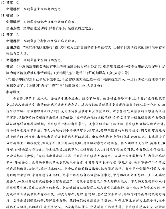 辛自修,字子吉,襄城人。嘉靖三十五年进士。除海宁知县。擢吏科给事中,奏言:“吏部铨注,遴才要矣,量地尤急。迩京府属吏去者十之五,岂畿辇下独多不肖哉?地艰而事猥也。请量地剧易以除官,量事繁简以注考。”吏部善其言,请令抚按举劾如自修议。历迁礼科都给事中。诚意伯刘世延不法,自修极论其奸。诏革任禁锢。未几,论夺尚书顾可学、徐可成,侍郎朱隆禧赠谥;以可成由黄冠,可学、隆禧俱以方药进也。以右佥都御史巡抚保定六府。奏减均徭里甲银六万两,增筑雄、任丘二县堤,以御滹沱水患。入历大理卿,兵部左、右侍郎,擢南京右都御史。御史沈汝梁者,巡视下江,用馈遗为名,尽括所部赎锾,自修劾奏之。帝方欲惩贪吏,乃命逮治汝梁,而召自修为左都御史。十五年大计京官政府欲庇私人去异己吏部尚书杨巍承意指惟谨自修患之先期上奏请勿以爱憎为喜怒排抑孤立之人帝善其言,而政府不悦。有贪竞者十余辈,皆政府所厚,自修欲去之。给事中陈与郊自度不免,遂言宪臣将以一眚弃人,一举空国。于是自修所欲斥者悉获免。已而御史张鸣冈等拾遗,首工部尚书何起鸣。起鸣故以督工与中官张诚厚,而雅不善自修,遂讦自修挟仇主使。御史高维崧、赵卿、张鸣冈、左之宜不平,劾起呜饰非诡辨。帝先入张诚言,颇疑自修。得疏益不悦。刑部主事王德新复疏争,帝下之诏狱,酷刑究主者。无所承,乃削其籍。自修不自安,亟引疾归。久之,起南京刑部尚书。复以工部尚书召。未上,卒。赠太子太保,谥肃敏。 (节选自《明史•辛自修传》,有删改) 10.下列对文中画波浪线部分的断句,正确的一项是(3分) A.十五年/大计京官政府/欲庇私人/去异己/吏部尚书杨巍承意指惟谨/自修患之/先期上奏/请勿以爱憎为喜怒/排抑孤立之人/ B.十五年/大计京官政府/欲庇私人/去异己/吏部尚书杨巍承意指惟谨/自修患之先期上奏/请勿以爱憎为喜怒/排抑孤立之人/ C.十五年/大计京官/政府欲庇私人/去异己/吏部尚书杨巍承意指惟谨/自修患之/先期上奏/请勿以爱憎为喜怒/排抑孤立之人/ D.十五年/大计京官/政府欲庇私人/去异己/吏部尚书杨巍承意指惟谨/自修患之先期上奏/请勿以爱憎为喜怒/排抑孤立之人/ 11.下列对文中加点词语的相关内容的解说,不正确的一项是(3分) A.吏科给事中,明代首设,具有劝谏和监察双重职能,辅助皇帝处理政务,稽查吏部事务。 B.里甲,明朝时期的社会基层组织,每一里为一百一十户,多推丁粮较多的十户为里长,其余百户分为十甲。 C.南京,明代两京之一,与北京一样拥有一套完整的中央机构,对明代政治、社会产生深远影响。 D.拾遗,文中指古代官职名,武则天时期始置,具有讽谏和举才的职能,对古代政治环境有很好的净化作用。 12.下列对原文有关内容的概括和分析,不正确的一项是(3分) A.辛自修为官尽责,献言献策。他认为要根据地方情况授予官职,考核官员要考虑到事情的繁简,吏部认为他的建议很有道理,就准许他照此施行。 B.辛自修心系百姓,防治水患。他担任右佥都御史辖治保定六府时,上奏减少了六万两的均徭和里甲役费;为防御滹沱河泛滥,增筑了堤防。 C.辛自修大义凛然,疾恶如仇。他极力揭露刘世延不守法行为,皇帝诏令将刘世延革职囚禁;他上奏弹劾沈汝梁搜刮钱财,最终使其被逮捕治罪。 D.辛自修不畏权贵,坚持己见。他曾不顾及当权者态度,上谏言陈述己见;有十多个为当权者看重的官员贪权争利,他想要解除这些人职务。 13.把文中画横线的句子翻译成现代汉语。(10分) (1)迩京府属吏去者十之五,岂畿辇下独多不肖哉?地艰而事猥也。 (2)给事中陈与郊自度不免,遂言宪臣将以一眚弃人,一举空国。 参考答案 10、C 11、D 12、A ![]() 病回乡。此后很久,才起用他任南京刑部尚书,又召他担任工部尚书,他没有上任就去世了。赠封为太子太保,谥号肃敬。