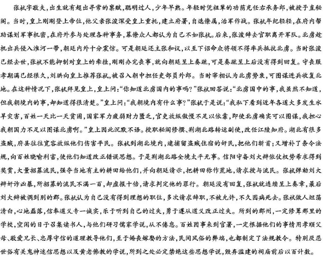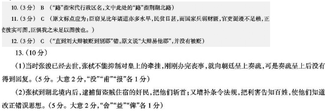 张栻字敬夫,生有异质,颖悟夙成。少以荫补右承务郎,除直秘阁。是时,上新即位,其父张浚受重寄,开府治戎。而拭以藐然少年,内赞密谋,外参庶务,幕府诸人皆自以为不及。已而,浚辞位去。虏乘隙纵兵入淮甸,中外大震。然庙堂犹主和议,至敕诸将无得以兵向虏。时浚已没,栻不胜君亲之念,甫襄事,即拜疏,疏入不报。服除久之,刘珙荐于上,召为吏部员外郎。时宰相谓虏衰可图。于是栻见上,上曰:“卿知虏中事乎?”栻对曰:“虏中之事,臣虽不知,然境内之事,则知之详矣。”上曰:“何事?”栻遂言曰:“臣窃见比年诸道亦多水旱民贫日甚而国家兵弱财匮官吏诞谩不足赖正使彼实可图臣惧我之未足以图彼也。”上为默然。除秘阁修撰、荆湖北路转运副使,改知江陵府。湖北尤多盗,而府县往往纵释以病良民。时入境,捕奸民之舍盗者,斩之;又益为教条,喻以利害,俾知革心。于是一路肃清。信阳守备刘大辩怙势希赏,广招流民,而夺见户熟田以与之。请于朝,以熟为荒,乞授流民。栻劾大辩诈谖凶虐,所招流民不满百数,而虚奏十倍,请论其罪。不报,章累上,大辩易他郡。栻自以不得其职,数求去不得,寻以病卒。栻为人坦荡明白,表里洞然,信道笃,乐于闻过,勇于徙义。所至郡,必葺其学校,暇日召诸生与之讲学不倦。民以事至廷中者,必随事教以孝弟忠信,至于昏丧之法,风俗之弊,且为条教。尤恶世俗鬼神老佛之说,所至必屏绝之,毁淫祠前后百数。 (摘自《杨万里集笺校·张左司传》,有删节) 10.对下列句子中加点的词的解释,不正确的一项是(3分) A.少以荫补右承务郎 荫:荫庇 B.栻劾大辩诈谖凶虐 谖:欺骗 C.于是一路肃清 路:线路 D.毁淫祠前后百数 淫:过多 11.下列对文中画波浪线部分的断句,正确的一项是(3分) A.臣窃见比年诸道/亦多水旱/民贫日甚而国家兵弱财匮/官吏诞谩不足赖/正使彼实可图/臣惧我之未足以图彼也 B.臣窃见比年诸道亦多水旱/民贫日甚/而国家兵弱财匮/官吏诞谩不足赖/正使彼实可图/臣惧我之/未足以图彼也 C.臣窃见比年诸道亦多水旱/民贫日甚/而国家兵弱财匮/官吏诞谩不足赖/正使彼实可图/臣惧我之未足以图彼也 D.臣窃见比年诸道亦多水旱/民贫日甚/而国家兵弱财匮/官吏诞谩/不足赖正使/彼实可图/臣惧我之未足以图彼也 12.下列对原文有关内容的概括和分析,不正确的一项是(3分) A.张栻少年早熟,智慧谋略过人。他刚踏人仕途就展露锋芒,在父亲张浚幕府中帮助谋划军机,处理外务,年纪轻轻就令幕僚自叹不如。 B.张栻嫉恶如仇,敢于弹劾权贵。他连续上书检举揭发信阳守备刘大辩强夺有主耕田、虚报流民数量的欺诈行为,直到刘大辩被贬到别郡。 C.张栻遇事冷静,善于把握大局。在宰相认为北虏势衰可图时,他向皇上陈言,指出国内各地灾害不断,国力不足,不应该发动战事。 D.张栻崇尚道义,重视风俗教化。他到各地任职时,一定修葺学校,用孝悌忠信教导百姓,并制定有关法规条令,易风移俗,革除弊端。 13.把文中画横线的句子翻译成现代汉语。(10分) (1)时浚已没,拭不胜君亲之念,甫襄事,即拜疏,疏入不报。 (2)栻入境,捕奸民之舍盗者,斩之;又益为教条,喻以利害,俾知革心。 参考答案 10、B 11、C 12、C ![]() 参考译文