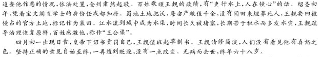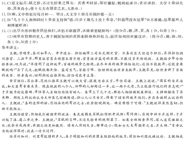 王觌,字明叟,泰州如皋人。第进士。为编修三司令式删定官。不乐久居职,求润州推官。二浙旱,郡遣吏视苗伤,承监司风旨,不敢多除税。觌受檄覆按,叹曰:“旱势如是,民食已绝,倒廪赡之,犹惧不克济,尚可责以赋邪?”行数日,尽除之。监司怒,捃摭[注]百出。会朝廷遣使振贷,觌请见,为言民间利病。使者喜,归荐之,除司农寺主簿。 哲宗立,吕公著、范纯仁荐其可大任,擢右正言,进司谏。上疏言:“国家安危治乱,系于大臣。今执政八人,而奸邪居半,使一二元老,何以行其志哉?”因极论蔡确、章悖等朋邪害正。章数十上,相继斥去。又劾窜吕惠卿。朝论以大奸既黜,虑人情不安,将下诏慰释之,且戒止言者。觌言:“诚出于此,恐海内有识之士,得以轻议朝廷。诚为陛下惜之。”觌言虽切,然不能止也。 觌在言路,欲深破朋党之说。朱光庭讦苏轼试馆职策问,吕陶辩其不然,遂起洛、蜀二党之说。觌言:“轼之辞不过失轻重之体尔若悉考同异深究嫌疑则两岐遂分党论滋炽夫学士命词失指其事尚小使士大夫有朋党之名大患也。”帝深然之,置不问。 知苏州。州有狡吏,善刺守将意以挠权,前守用是得讥议。觌穷其奸状,置于法,一郡肃然。民歌咏其政,有“吏行水上,人在镜心”之语。绍圣初,以宝文阁直学士知成都府。蜀地膏腴,亩千金,无闲田以葬,觌索侵耕官地,表为墓田。江水贯城中为渠,岁久湮塞,积苦霖潦而多水灾,觌疏治复故,民德之,号“王公渠”。 日食四月朔,帝下诏责躬,觌当制。觌清修简澹,人莫见其喜愠。持正论始终,再罹谴逐,不少变。无疾而卒,年六十八。 (选自《宋史·王觌传》,有删改) 【注】捃摭(jùn zhí):指搜罗材料以打击别人。 10.下列对文中画波浪线部分的断句,正确的一项是(3分) A.轼之辞不过失/轻重之体尔/若悉考同异深究/嫌疑则两岐/遂分党论滋炽/夫学士命词失指/其事尚小/使士大夫有朋党之名/大患也 B.轼之辞不过失/轻重之体尔/若悉考同异/深究嫌疑/则两岐遂分党论/滋炽夫学士命词失指/其事尚小/使士大夫有朋党之名/大患也 C.轼之辞/不过失轻重之体尔/若悉考同异/深究嫌疑/则两岐遂分/党论滋炽/夫学士命词失指/其事尚小/使士大夫有朋党之名/大患也 D.轼之辞/不过失轻重之体尔/若悉考同异深究/嫌疑则两岐/遂分党论滋炽/夫学士命词/失指其事/尚小/使士大夫有朋党之名/大患也 11.下列对文中加点词语的相关内容的解说,不正确的一项是(3分) A.檄,文中指檄文。檄文,古代官方用以征召、晓谕、声讨的文书。 B.陛下,指宫殿中立有护卫的台阶下。因群臣不可直呼帝王,于是借用为对帝王的尊称。 C.言路,文中指谏官。谏官是对君主的过失直言规劝并使其改正的官吏。 D.朔,文中指农历每月十五。朔日,天文学上指月亮圆的那一天。 12.下列对原文有关内容的概括和分析,不正确的一项是(3分) A.王觌体恤民情,实事求是。二浙闹旱灾,有人迎合上司不敢过多减税,他去后免除全部赋税,得罪上司而被刁难,他向朝廷使者报告实情。 B.王觌忠于职守,敢于向权臣开刀。他上奏疏认为,主政的权臣中超过一半是奸臣,这样不行。几十个人和他同时上奏章支持他,但最终没有结果。 C.王觌兴利除弊,造福人民。他惩处苏州恶人获得尊敬,百姓歌颂他的政绩;他把要回的官府土地设为墓地,方便群众;他整治水利,百姓感激。 D.王觌敢于直言,坚持正确意见。有人揭发苏轼的问题,兴起朋党之争,他忧虑这种做法,皇帝支持他;他因坚持己见而屡遭贬谪却不后悔。 13.把文中画横线的句子翻译成现代汉语。(10分) (1)倒廪赡之,犹惧不克济,尚可责以赋邪?(5分) (2)州有狡吏,善刺守将意以挠权,前守用是得讥议。(5分) 参考答案 10、C 11、D 12、B 13、(1)出尽仓库的粮食供给给他们,还怕不能救济,还能索要赋税吗? (2)苏州有狡猾的吏人,善于刺探知州的意图来阻挠他的权力,前任知州因此被议论。 ![]()