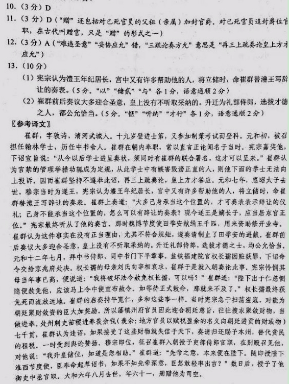 崔群,字敦诗,清河武城人。十九登进士第,又制策登科。元和初,召为翰林学士,历中书舍人。群在内职,常以谠言正论闻于时。宪宗嘉赏,降宣旨云:“自今后学士进状,并取崔群连署,然后进来。”群以禁密之司,动为故事,自尔学士或恶直丑正,则其下学士无由上言。群坚不奉诏,三疏论奏方允。元和七年,惠昭太子薨,穆宗时为遂王,宪宗以澧王居长,又多内助,将建储贰,命群与澧王作让表。群上言曰:“大凡己合当之,则有陈让之仪;己不合当,因何遽有让表?今遂王嫡长,所宜正位青宫。”竟从其奏。时魏博节度使田季安进绢五千匹,充助修开业寺。群以为事实无名,体尤不可,请止其所进。群前后所论多惬旨,无不听纳。迁礼部侍郎,选拔才行,咸为公当。十二年七月,拜中书侍郎、同中书门下平章事。盐铁福建院官权长孺坐赃,诏付京兆府决杀。长孺母刘氏求哀于宰相,群因入对言之。宪宗愍其母耄年,乃曰:“朕将屈法赦长孺何如?”群曰:“陛下仁恻即赦之,当速令中使宣谕。如待正敕,即无及也。”长孺竟得免死长流。群之启奏平恕,多此类也。时宪宗急于荡寇,颇奖聚敛之臣。故藩府由是希旨,往往捃拾,目为进奉。处州刺史苗稷进羡余钱七千贯,群议以为违诏,受之则失信于天下,请却赐本州,代贫下租税。时论美之。穆宗即位,征拜吏部侍郎,召见别殿,谓群曰:“我升储位,知卿为羽翼。”群曰先帝之意元在陛下顷者授陛下淮西节度使臣奉命草制若不知先帝深旨臣岂敢轻言数日,拜御史中丞。太和六年八月卒,年六十一,册赠司空。 (节选自《旧唐书·列传第一百零九·崔群传》,有删改) 10.下列对文中画波浪线部分的断句,正确的一项是(3分) A.先帝之意/元在陛下/顷者授陛下/淮西节度使臣奉命草制/若不知先帝/深旨臣岂敢轻言/ B.先帝之意/元在陛下/顷者/授陛下淮西节度使臣/奉命草制/若不知先帝/深旨臣岂敢轻言/ C.先帝之意/元在陛下/顷者授陛下/淮西节度使臣奉命草制/若不知先帝深旨/臣岂敢轻言/ D.先帝之意/元在陛下/顷者/授陛下淮西节度使/臣奉命草制/若不知先帝深旨/臣岂敢轻言/ 11.下列对文中加点词语的相关内容的解说,不正确的一项是(3分) A.制策,皇帝有事书之于策以问臣下,称为“制策”。后为科举考试所采用,与进士、明经、词科、任子、府史杂流等同为国家取士的科目。 B.连署,在文中的意思是“连名”“联合署名”。古代为证明已签署的文件的可靠性而由其他人连同的签字。“连署”还有一个意思是“同一官署”。 C.青宫,太子居于东宫,东方属木,于色为青,故称太子所居为青宫。“青宫”与“东宫”一样可以借指太子。 D.赠,是指古代皇帝为已死的官员进行追封爵位官职的制度。如文中的“司空”即为赠官。这既是对死者的尊敬,也能光耀死者门楣。 12.下列对原文有关内容的概括和分析,不正确的一项是(3分) A.崔群正直敢言,却难违圣意。宪宗要求学士进奏,要有崔群的署名才能呈上,崔群认为这容易成为定例,会阻碍下面学士的言路,坚决不奉诏,但最终还是妥协应允了。 B.崔群行事得体,不以功自居。当初在建储之事上崔群的建言既符合情理又有利于遂王,遂王登基后,向他表达感谢之情,他表示功不在己,但依然得到晋升。 C.崔群坚持原则,能“守土尽责”。田季安献绢五千匹助修开业寺,他认为于理不合,奏请阻止;苗稷进羡余钱七千贯,他认为这违反诏令,请求退还以代贫民的租税。 D.崔群宽厚仁慈,法外也容情。权长孺获死罪,其母向宰相悲哀求情,崔群奏请宪宗,宪宗同情权母老迈,欲赦免权长孺,崔群怕夜长梦多,建议宪宗及时颁布赦令。 13.把文中画横线的句子翻译成现代汉语。(10分) (1)宪宗以澧王居长,又多内助,将建储贰,命群与澧王作让表。 (2)群前后所论多惬旨,无不听纳。迁礼部侍郎,选拔才行,咸为公当。 参考答案 10、D 11、D 12、A