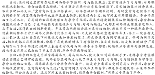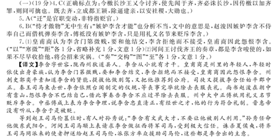 李含,字世容,陇西狄道人也。少有才干。皇甫商州里年少,少恃豪族,以含门寒微,欲与结交,含距而不纳,商恨焉。州刺史郭奕素闻其贤,擢含为别驾,荐之公府。司徒迁含领始平中正。秦王柬薨,舍依台杖,葬讫除丧。尚书赵浚有内宠,疾含不事己,遂奏含不应除丧。本州大中正傅祗以名义贬含。中丞傅成上表理台,言含忠公清正,才经世务,其行合制。帝不从,含遂被贬。 及赵王伦篡位,或谓孙秀曰:“李含有文武大才,无以资人。”秀以为东武阳令。河间王颗袁请含为征西司马,甚见信任。颙诛夏侯奭,送齐王囧使与赵王伦,遣张方率众赴伦,皆含谋也。 初,梁州刺史皇甫商为赵王伦所任,伦败,去职诣颙,颙慰抚之甚厚。含谏禺颙曰:“商,伦之信臣,惧罪至此,不宜教与相见。”商知而恨之。后含被征为翊军棱尉。时商参齐王囧军事,而夏侯夷兄在囧府,称夷立义,被河间王颙枉害。含乃心不自安。囧右司马赵骧又与含有隙,囧将阅武,含惧骧因兵讨之,乃单马出奔于颙,说颙曰:“成都王颖至亲,有大功,甚得众心。齐王囧越亲而专执成权,朝廷侧目。今檄长沙王义令讨齐使先闻于齐齐必诛长沙固传檄以加齐罪则囧可擒也既去齐立成都王颖除逼建亲以安社稷大勋也。”颙从之,遂袁请讨囧,拜含为都督,统张方等率诸军以向洛阳。而长沙王义诛囧,舍等旋师。 初,含之本谋欲并去乂、囧,使权归于颙,含因得肆其宿志。既长沙胜齐,颙、颖犹各守藩,志望未允。颙表舍为河南尹。时皇甫商复被乂任遇,含疾商滋甚。商说乂曰:“河间之奏,皆李舍所交构也,若不早图,祸将至矣。且河间前举,由含之谋。”乂乃杀含。 (节选自《晋书》列传三十) 【注】西晋“八王之乱”,八王,汝南王司马亮、楚王司马玮、赵王司马伦、齐王司马囧、河间王司马颙、成都王司马颖、长沙王司马乂(yì)东海王司马越。 4.下列对文中画波浪线部分的断句,正确的一项是( ) A.今檄长沙王乂令讨齐/使先闻于齐/齐必诛长沙/因传檄“加齐/罪则囧可擒也/既去齐/立成都王颖/除逼建亲/以安社稷/大勋也/ B.今檄长沙王乂令/讨齐使先闻于齐/齐必诛长沙因传檄/以加齐罪/则囧可擒也/既去齐/立成都王颖除/逼建亲/以安社稷/大勋也/ C.今檄长沙王乂令讨齐/使先闻于齐/齐必诛长沙/因传檄以加齐罪/则囧可擒也/既去齐/立成都王颖/除逼建亲/以安社稷/大勋也/ D.今檄长沙王乂令/讨齐使先闻于齐/齐必诛长沙/因传檄以加齐/罪则囧可擒也/既去齐/立成都王颖/除逼建亲/以安社稷/大勋也/ 5下列对文中加点词语的相关内容的解说,不正确的一项是( ) A.“擢”“迁”“征”都与官职升降有关,“擢”是提拔,“迁”是贬官,“征”是征召做官。 B.“薨”指诸侯或高官去世,不同身份的人去世称呼不同,天子为“崩”,大夫为“卒”。 C.“除丧”指由着丧服变为吉服,古代父母或君王去世后,子女或属下要着丧服一定期限。 D.“表”指写给皇帝的奏章,奏章是臣属向帝王进言陈事的文书,分“奏”“疏”“表”等。 6.下列对原文有关内容的概括和分析,不正确的一项是( ) A.李含很有才干,颇受赏识。州刺史郭爽平索知李含贤能,提拔他做别驾,把他推荐到公府;孙秀听说他才能a超群,任命他做东武阳令。 B.李含恃才傲物,遭人嫉妒。尚书赵浚和大中正傅祗嫉妒李含才能,抓住李含在为秦王除丧服时的做法,用礼义名节来贬斥李含。 C.李含与皇甫商一直不合。李含少时不愿与皇甫商结交;皇甫商投奔司马颙,李含劝谏司马颞远离皇甫商,皇甫商知后怀恨在心。 D.李含有一定的私心。李含为司马颙谋划除掉司马乂、司马囧二人,使大权回到司马颙手里,有着实现自己旧有愿望的目的。 7把文中画横线的句子翻译成现代汉语。 (1)以含门寒微,欲与结交,含距而不纳,商恨焉。 (2)河间之奏,皆李含所交构也,若不早图,祸将至矣。 参考答案 4、C 5、A(“迁”是官职变动,非特指贬官) 6、B(“恃才傲物”无中生有;“嫉妒李含才能”也分析不当) ![]()