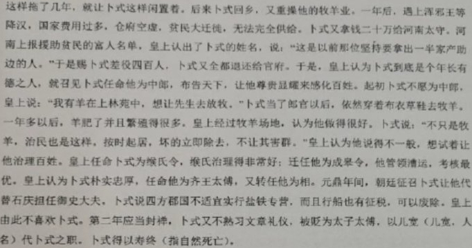 卜式,河南人也。以田畜为事。有少弟,弟壮,式脱身出,独取畜羊百余,田宅财物尽与弟。式入山牧,十余年,羊致千余头。而弟尽破其产,式辄复分与弟者数矣。 时汉方事匈奴,式上书,愿输家财半助边。上使使问式:“欲为官乎?”式曰:“自小牧羊,不习仕宦,不愿也。”使者曰:“家岂有冤,欲言事乎?”式曰:“臣生与人亡所争,邑人贫者贷之,不善者教之,所居,人皆从式,式何故见冤!”使者曰:“苟,子何欲?”式曰:“天子诛匈奴,有财者宜输之,如此而匈奴可灭也。”使者以闻。以语丞相弘。弘曰:“此非人情。不轨之臣不可以为化而乱法,愿陛下勿许。”上不报。数岁乃置式。式归,复田牧。岁余,会浑邪等降,县官费众,仓府空,贫民大徙,皆卯给县官,无以尽瞻。式复持钱二十万与河南太守,以给徙民,河南上富人助贫民者,上识式姓名,曰:“是固前欲输其家财半助边。”乃赐式外徭四百人,式又尽复与官。上于是以式终长者,乃召拜式为中郎,布告天下,尊显以风百姓。初式不愿为郎,上曰:“吾有羊在上林中,欲令子牧之。”式既为郎,布衣草履而牧羊。岁余羊肥息上过其羊所善之式曰非独羊也治民亦犹是矣以时起居恶者辄去毋令败群上奇其言欲试使治民。拜式缑氏令,缑氏便之。迁成皋令,将漕最。上以式朴忠,拜为齐王太傅,转为相。元鼎中,征式代石庆为御史大夫。式言郡国不便盐铁而船有算,可罢。上由是不说式。明年当封禅,式又不习文章,贬秩为太子太傅,以儿宽代之,式以寿终。 (节选自《汉书·公孙弘卜式儿宽传》) 10.下列对文中画波浪线部分的断句,正确的一项是(3分) A.岁余/羊肥息/上过其羊所/善之/式曰/非独羊也/治民亦犹是矣/以时起/居恶者辄去/毋令败群/上奇其言/欲试使治民/ B.岁余/羊肥息/上过其羊所/善之/式曰/非独羊也/治民亦犹是矣/以时起居/恶者辄去/毋令败群/上奇其言/欲试使治民/ C.岁余/羊肥息/上过其羊所/善之/式曰/非独羊/也治民/亦犹是矣/以时起居/恶者辄去/毋令败群/上奇其言/欲试使治民/ D.岁余/羊肥息/上过其羊所/善之/式曰/非独羊/也治民/亦犹是矣/以时起/居恶者辄去/毋令败群/上奇其言/欲试使治民/ 11.下列对文中加点词语的相关内容的解说,不正确的一项是(3分)() A.县宫,西汉用以称政府、皇帝或朝廷。而一县长官,则称为县令或县长,不称县官。 B.长者,可指豪侠、年长者.也用作对男子的尊称,文中指年岁大而有德行的人。 C.御史大夫,官职名,西汉时居副丞相之位以协助丞相综理大政,偏重于执法或纠察。 D.封禅,是指中国古代帝王在太平盛世或天降样瑞之时的封赏、礼佛的大型典礼。 12.下列对原文有关内容的槻括和分析,不正确的一项是(3分)() A.卜式致富有方,性情敦厚。弟弟长大后,卜式从家中分出居住,只取了一百多只羊,田宅财物全给了弟弟,弟弟倾家荡产,卜式又多次分给弟弟财产。 B.卜式为国分忧,毁家纾难。汉匈交战时,卜式捐出了一半家财援助汉:浑邪王等降汉,国家府库出现亏空,他又拿出二十万钱给河南太守以帮助贫民。 C.卜式牧羊有方,治国有识。卜式担任中郎以后,在上林苑牧羊,成效明显;他对治民的识见得到皇帝肯定,先后被任命为缑氏令、成皋令,政绩显著。 D.卜式竭忠尽诚,直言遭贬。元鼎年间,卜式为御史大夫后,说四方郡国不适宜实行盐铁专营,而且行船也有征税,可以废除,皇上因此而不喜欢卜式。 13.把文中画横线的句子翻译成现代汉语。(10分) (1)臣生与人亡所争,邑人贫者贷之,不善者教之,所居,人皆从式,式何故见冤! (2)河南上富人助贫民者,上识式姓名,曰:“是固前欲输其家半财助边。 参考答案 10.B(岁余,羊肥息。上过其羊所,善之。式曰:“非独羊也,治民亦犹是矣。以时起居,恶者辄去,毋令败群。”上奇其言,欲试使治民。) 11.D(“礼佛的大型典礼”错,祭祀天地的大型典礼) 12.B(“卜式捐出了一半家财援助汉”不准确,原文“愿输家财半助边”,并无结果) 13、(1)我生来与世无争,对贫困的乡人就借钱给他,对不善的人就教导他,平时人们都依从我,我怎么会被冤屈呢! (2)河南上报援助贫民的富人名单,皇上认出了卜式的姓名,说:“这是以前那位坚持要拿出一半家产助边的人。” 参考译文 卜式以耕田畜牧为业。有一个年幼的弟弟,等到弟弟长大成人,卜式就从家里搬出来,只要了家中畜养的一百多头羊,田宅房屋等全都留给了弟弟。卜式进山牧羊,十多年,羊达到一千多头,买了田地宅舍。而他的弟弟却尽破他的家产,卜式就又多次把自己的家产分给弟弟。 当时汉朝正在从事征伐匈奴的战争,卜式上书,愿意捐献一半家产资助边防。皇上派使者问卜式:“你是想做官吗?”卜式说:“我从小放羊,不熟习做官的事,不想做官。”使者问道:“莫非是家中有冤屈,想要申诉冤情?”卜式说:“我生来与人无争,同乡的人中贫穷的,我救济他;品行不好的,我劝导他;我所住的地方,人们都听从我卜式,我怎么会被人冤屈!皇上讨伐匈奴,我认为贤能的人应该效死以保其节义,有钱财的人应该捐献钱财,这样,匈奴就可以消灭了。”使者把他的话报告给了皇上。皇上把卜式的话告诉丞相公孙弘。公孙弘说:“这不是人之常情。这种不守法度的人,不可以作为教化的榜样而扰乱正常的法规,希望陛下不要答应他的请求。”于是皇上没有回复,这样拖了几年,就让卜式这样闲置着。 ![]() 后来卜式回家后,依旧耕田放牧。过了一年多,恰逢匈奴浑邪王等人投降,