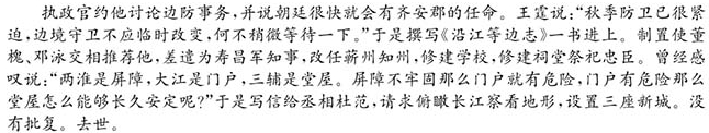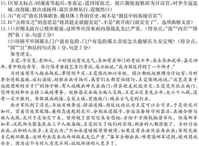 王霆,字定叟,东阳人。霆少有奇气,试有司不偶,去就武举,嘉定四年,中绝伦异等。乔行简考艺别头,喜曰:“吾为朝廷得一帅才矣。” 时潘甫等起兵事甫定霆因绥抚之镇江都统赵胜辟为计议官时李全寇盐城攻海陵胜出戍扬州属官多惮从行霆慨然曰:“此岂臣子辞难之日!”至扬子桥,人言贼兵昨日在南门,去将安之,霆竟至南门,以帅宪之命董三城事。胜次第出城接战,霆必身先士卒,大小十八战,无一不利。夺贼壕,筑土城,焚城门,贼气为慑。 北兵至浮光,其民奔遁,相属于道,朝论以为霆可守之,乃知光州。冒雪夜行,倍道疾驰至州,分遣间探,整饬战守之具,大战于谢令桥,光人遂安。督府魏了翁以书来慰安之,以缗钱十万劳其军。知高邮军,流民邦杰聚众三千人为盗,霆剿其渠魁,余党悉散。时议出师,和者甚多,霆以为:“莫若遣间探觇敌情,如不得已然后行之;否则无故自荡其根本,是外兵未至而内兵先惨烈也。”诸军毕行,惟高邮迟之,境内赖以安全。由是与时迕,而谗者益众。 执政期论边事,且谓朝廷即有齐安之命。霆曰:“秋防已急,边守不宜临时更易,盍少需之。”乃撰《沿江等边志》一编上之。制置使董槐、邓泳交荐之,差知寿昌军,改蕲州,建学舍,祠忠臣。尝叹曰:“两淮藩篱也,大江门户也,三辅堂奥也。藩篱不固则门户且危,门户既危则堂奥岂能久安乎?”于是贻书丞相杜范,乞瞰江审察形势,置三新城。不报。卒。 (节选自《宋史·王霆传》,有删改) 10.下列对文中画波浪线部分的断句,正确的一项是(3分) A.时潘甫等起兵事/甫定/霆因绥抚之镇江/都统赵胜辟为计议官/时李全寇盐城/攻海陵/胜出戍扬州/属官多惮从行/霆慨然曰 B.时潘甫等起兵/事甫定/霆因绥抚之镇江/都统赵胜辟为计议官时/李全寇盐城/攻海陵/胜出戍扬州属/官多惮从行/霆慨然曰 C.时潘甫等起兵/事甫定/霆因绥抚之/镇江都统赵胜辟为计议官时/李全寇盐城/攻海陵/胜出戍/扬州属官多惮从行/我慨然曰 D.时潘甫等起兵/事甫定/霆因绥抚之/镇江都统赵胜辟为计议官/时李全寇盐城/攻海陵/胜出戍扬州/属官多惮从行/霆慨然曰 11.下列对文中加点词语的相关内容的解说,不正确的一项是((3分) A.古代朝廷中分职设官,各有专司,所以可用“有司”来指称朝廷中的各级官员。 B.古代科举分为文举和武举,文举选拔经国治世的文官。武举主要选拔军事人才。 C.缗钱,古代用绳子串起来的钱。缗,串钱的绳子,此处为单位,一千文为一纸. D.志,有多种含义,可指一种文学体裁。表示记载或者记载的文字,文中指体裁。 12.下列对原文有关内容的概括和分析,不正确的一项是(3分) A.王霆少有大志,才干非凡。王霆小时候志向远大,后来参加武举,考中绝伦异等.主考官乔行简认为王霆有帅才。 B.工霆大义凛然,作战勇敢。李全叛乱时,部下告诉王霆离开南门就安全了,王霆奔赴南门,身先士卒,战无不胜。 C.王霆出兵谨慎,别具见识。邦杰聚众为盗,朝中都主张出兵,王霆认为应先察明情况,由于意见不同,遭人谗言。 D.王霆熟谙边事,著书进献。执政官约王霆讨论边防事务,王霆认为秋防已急,边境守卫不应临时改变,并撰书进上。 13.把文中画横线的句子翻译成现代汉语。(10分) (1)否则无故自荡其根本.是外兵未至而内兵先惨烈也。(5分) (2)藩篱不固则门户且危。门户既危则堂奥岂能久安乎?(5分) 参考答案 10、D 11、A 12、B 13、(1)否则无故败坏根基,这样外兵没来而内部战乱先已严重。 (2)屏障不牢固那么门户就有危险,门户有危险那么堂屋怎么能够长久安定呢? ![]()