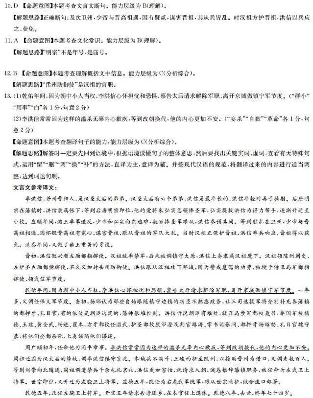 李洪信,并州晋阳人,汉圣太后弟也。后弟六人,洪信居长,少善骑射。后唐明宗在藩时,隶帐下,及即位,爱将朱弘实总领捧圣军,弘实擢洪信为爪牙,渐迁小校。应顺中,潞王举兵,少帝弘实而东奔,捧圣军数百从行,洪信预焉。及次卫州少帝与晋高祖遇因有疑贰谋害晋祖其从兵皆乱时汉祖方护晋祖洪信以兵应之获免。清泰中,又为雍王重美牙校。 晋初,为兴顺左厢都指挥使。汉祖统禁军,迁镇太原,奏隶麾下。汉祖领陈州刺史、左护圣左厢都指挥使,俄加岳州防御使。从汉祖降邺,以警扈之劳,授侍卫马军都指挥使、领武信军节度。 乾佑中,以群小用事,心怀忧惧,白太后求解军职,出为镇宁军节度。岁余,迁保义军节度。初,杨邪以元从功臣为方镇者不谙政务,令三司择军将分补诸镇都押牙、孔目官,或恃以朝选,藩帅难制。洪信闻内难,即召马步军都校聂召,奉国军校杨德、王建、黄全武、杨进、翟本,右牙都校任温武,护圣都校康审澄及判官路涛、掌书记张洞、都押牙杨昭勍、孔目官魏守恭,悉杀之,诬奏谋逆。 周广顺初,加同平章事。洪信常以此妄杀自歉,及革命,内不自安。周祖犹以汉太后之故,移镇京兆。本城兵不满千,王峻西征至陕州,以援晋州为辞,又取去数百人。及刘崇北遁,遣禁兵千余屯京兆,洪信益惧,即请入朝,恳辞藩镇,拜左武卫上将军。世宗即位,迁左骁卫上将军。显德五年,改右龙武军统军,从世宗北征,为合流口部署。 乾德五年,改左骁卫上将军。开宝五年请老,以本官致仕。八年,卒,年七十四。 (节选自《宋史·李洪信传》) 10.下列对文中画浪线部分的断句,正确的一项是(3分) A.及次卫州/少帝与晋高祖遇/因有疑贰谋害/晋祖其从兵皆乱/时汉祖方护晋祖/洪信以兵应之/获免/ B.及次/卫州少帝与晋高祖遇/因有疑/贰谋害晋祖/其从兵皆乱/时汉祖方护晋祖/洪信以兵应之/获免/ C.及次/卫州少帝与晋高祖遇/因有疑贰/谋害晋祖/其从兵皆乱/时汉祖方护晋祖/洪信以兵应之/获免/ D.及次卫州/少帝与晋高祖遇/因有疑贰/谋害晋祖/其从兵皆乱/时汉祖方护晋祖/洪信以兵应之/获免/ 11.下列对文中加点词语的相关内容的解说,不正确的一项是(3分) A.年号是我国历代封建王朝用来纪年的一种名号。文中的清泰、明宗、乾德、开宝等都是年号。 B.在古代,爪牙是得力帮手的意思。现多比喻为坏人效力的人,他们的党羽,帮凶,是贬义词。 C.禁军是封建时代直辖属于帝王,担任护卫帝王或皇宫、首都警备任务的军队。 D.致仕指交还官职,即退休。古人还常用致事、致政、休致等名称表示官员辞职归家。 12.下列对原文有关内容的概括和分析,不正确的一项是(3分) A.李洪信出身皇戚,早年从军。李洪信是汉圣太后的弟弟,后被朱弘实提拔,逐渐升迁至小校。少帝东奔时,洪信参与了护卫行动。 B.李洪信屡立战功,受到封赏。晋初时,李洪信因立战功,先后被授予兴顺左厢都指挥使、岳州防御使、侍卫马军都指挥使、领武信军节度等官职。 C.李洪信担忧时事,为朝解忧。由于藩帅难以控制,李洪信将聂召、杨德、王建、黄全武、任温武、杨昭勍、魏守恭等人全都杀死。 D.李洪信受到猜忌,惶惶不安。周朝建立后,周祖因为李洪信是汉太后弟弟的缘故,让他镇守京兆,后又不断削弱他的武装力量,洪信忧惧,恳请辞藩镇,入朝为官。 13.把文中画横线的句子翻译成现代汉语。(10分) (1)乾佑中,以群小用事,心怀忧惧,白太后求解军职,出为镇宁军节度。 (2)洪信常以此妄杀自歉,及革命,内不自安。 参考答案 10、D 及次卫州,少帝与晋高祖遇,因有疑贰,谋害晋祖,其从兵皆乱。时汉祖方护晋祖,洪信以兵应之,获免。 11、A “明宗”不是年号,是庙号 12、B 岳州防御使是汉祖的官职 13、(1)乾佑年间,因为朝中小人当权,李洪信心怀担忧和恐惧,禀告太后请求解除军职,离开京城做镇宁军节度 李洪信常常因为这样的滥杀无辜内心愧疚,等到改朝换代,他的内心更加不安。