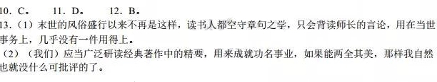 | 人生小幼,精神专利,长成已后,思虑散逸,固须早教,勿失机也。吾七岁时,诵《灵光殿赋》,至於今日,十年一理,犹不遗忘。二十以外,所诵经书,一月废置,便至荒芜矣。然人有坎禀,失于盛年,犹当晚学,不可自弃。孔子曰:“五十以学《易》,可以无大过矣。”魏武、袁遗,老而弥笃;此皆少学而至老不倦也。曾子十七乃学,名闻天下;荀卿五十始来游学,犹为硕儒;公孙弘四十余方读《春秋》,以此遂登丞相;朱云亦四十始学《易》、《论语》,皇甫谧二十始受《孝经》、《论语》,皆终成大儒:此并早迷而晚寤也。世人婚冠未学,便称迟暮,因循面墙,亦为愚耳。幼而学者,如日出之光;老而学者,如秉烛夜行,犹贤乎瞑目而无见者也。学之兴废,随世轻重。汉时贤俊,皆以一经弘圣人之道,上明天时,下该人事,用此致卿相者多矣。末俗已来不复尔,空守章句,但诵师言,施之世务,殆无一可。故士大夫子弟,皆以博涉为贵,不肯专儒。梁朝皇孙以下总丱之年必先入学观其志尚出身已后便从文吏略无卒业者冠冕,而为上者,则有何胤、刘献、明山宾、周舍、朱异、周弘正、贺琛、贺革、萧子政、刘绥等,兼通文史,不徒讲说也。洛阳亦闻崔浩、张伟、刘芳,邺下又见邢子才:此四儒者,虽好经术,亦以才博擅名。如此诸贤,故为上品。以外率多田野闲人,音辞鄙陋,风操蚩拙,相与专固,无所堪能。问一言辄酬数百,责其指归,或无要会。邺下谚云:“博士买驴,书卷三纸,未有‘驴’字。”使汝以此为师,令人气塞。孔子曰:“学也,禄在其中矣。”今勤无益之事,恐非业也。夫圣人之书,所以设教,但明练经文,粗通注义,常使言行有得,亦足为人;何必“仲尼居”即须两纸疏义,燕寝讲堂,亦复何在?以此得胜,宁有益乎?光阴可惜,譬诸逝水。当博览机要,以济功业,必能兼美,吾无间焉。 (节选自《颜氏家训·勉学》) 【注】面墙:喻不学而识见浅薄。总丱(guàn):即总角。燕寝讲堂:燕寝,闲居之处;讲堂,讲习之所。 10.下列对文中画波浪线部分的断句,正确的一项是( )(3分) A.梁朝皇孙/以下总丱之年/必先入学/观其志尚出身/已后便/从文吏/略无卒业者/ B.梁朝皇孙以下/总丱之年/必先入学/观其志尚出身/已后/便从文吏略/无卒业者/ C.梁朝皇孙以下/总丱之年/必先入学/观其志尚/出身已后/便从文吏/略无卒业者/ D.梁朝皇孙/以下总丱之年/必先入学/观其志尚/出身已后便/从文吏略/无卒业者/ 11.下列对文中加点词语的相关内容的解说,不正确的一项是( )(3分) A.婚冠:婚礼和冠礼。古代男子20岁行冠礼后即可成婚,并享受成人待遇,这里指婚冠的年龄,喻年少。 B.冠冕:古代帝王、官员所带的帽子,与成语“冠冕堂皇”中“冠冕”意思相同,文中用做仕宦的代称。 C.博士:古代指通晓古今、能言善辩之人。此词亦为古代学官名,旧时还指从事某些服务行业者,如茶博士、酒博士。 D.经文:古代主要指佛教等宗教典籍中的文字,下句的“注”是对经的注释,类似还有“笺”“疏”等。 12.下列对原文有关内容的概括和分析,不正确的一项是( )(3分) A.作者认为学习应该从小抓起,效果更好。不过错过了青春年华也不要自暴自弃,老来学习亦可有所收获。 B.作者认为光阴若流水般易逝,所以在“仲尼居”是内室还是厅堂这样的问题上纠结,纯属浪费时间。 C.学习风气的兴盛或衰败,随世道变迁而变化。作者在文章中运用了对比的手法来证明这一观点。 D.作者擅长运用举例论证,所举例子丰富而有针对性,使文章说理很有气势的同时,也增强了文章的说服力。 13.把文中画线的句子翻译成现代汉语。(10分) (1)末俗已来不复尔,空守章句,但诵师言,施之世务,殆无一可。(5分) (2)当博览机要,以济功业,必能兼美,吾无间焉。(5分) 10、C 11、D 12、B ![]()