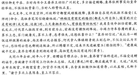 袁昂,字千里,陈郡阳夏人。父抃,冠军将军、雍州刺史,泰始初,举兵奉晋安王子勋,事败诛死。昂时年五岁,乳媪携抱匿于庐山,会赦得出,犹徙晋安。至元徽中听还时年十五初抃败传首京师藏于武库至是始还之。昂号恸呕血,绝而复苏,更期服,庐于墓次。从兄彖尝抚视抑譬,后与彖同见从叔司徒粲,粲谓彖曰:“其幼孤而能至此,故知名器自有所在。” 齐初,起家冠军安成王行参军,迁太子舍人、王俭镇军府功曹史。俭时为京尹,经于后堂独引见昂,指北堂谓昂曰:“卿必居此。”累迁秘书丞、黄门侍郎。丁内忧,哀毁过礼。服未除,而从兄彖卒。昂幼孤,为彖所养,乃制期服。服阕,除右军邵陵王长史,俄迁御史中丞。时尚书令王晏弟诩为广州,多纳赇货,昂依事劾奏,不惮权豪,当时号为正直。 永元末,义师至京师,牧守皆望风降款,昂独拒境不受命。高祖手书喻曰:“夫祸福无门,兴亡有数,天之所弃,人孰能匡?吾荷任前驱,拨乱反正,伐罪吊民,至止以来,前无横阵。今竭力昏主,未足为忠,家门屠灭,非所谓孝,忠孝俱尽,将欲何依?”昂答曰:“窃以一餐微施,尚复投殒,况食人之禄,而顿忘一旦。非惟物议不可,亦恐明公鄙之,所以踌躇,未遑荐璧。”建康城平,昂束身诣阙,高祖宥之不问也。 大同六年,薨,时年八十。册谥曰穆正公。初,昂临终遗疏,不受赠谥。敕诸子不得言上行状及立志铭,凡有所须,悉皆停省。复曰:“吾释褐从仕,不期富贵,但官序不失等伦,衣食粗知荣辱,以此阖棺,无惭乡里。”诸子累表陈奏,诏不许。 (选自《梁书·卷三十一》,有删改) 10.下列对文中画波浪线部分的断句,正确的一项是( )(3分) A.至元徽中听还/时年十五/初/抃败/传首京师/藏于武库/至是始还之 B.至元徽中/听还时/年十五/初抃败/传首京师/藏于武库/至是始还之 C.至元徽中/听还时年十五/初抃败/传首京师/藏于武库/至是/始还之 D.至元徽中/听还时/年十五/初/抃败传首/京师藏于武库/至是始还之 11.下列对文中加点词语的相关内容的解说,不正确的一项是( )(3分) A.舍人,古代官职名,“太子舍人”指太子的属官,与“缪贤舍人”中的“舍人”意思相同。 B.丁内忧,古代指遭遇母亲丧事;遭遇父亲丧事则称“丁外忧”。 C.牧守,指郡和州的长官。古时郡的长官称守,州的长官称牧。 D.明公,在古代是对位尊者的称呼,文中袁昂称高祖为明公,表达自己对高祖的尊敬。 12.下列对原文有关内容的概括和分析,不正确的一项是( )(3分) A.袁昂幼年丧父,飘零他乡。他五岁时父亲因拥立晋安王事败被杀,他跟随乳母藏匿于庐山,后遇到朝廷大赦,才迁往晋安。 B.袁昂不畏权势,为官正直。他担任御史中丞时,尚书令王晏的弟弟王诩任广州刺史,多方接受贿赂,袁昂向皇帝检举了他。 C.袁昂身处乱世,节操忠贞。在义师横扫京师、其他官员望风投降时,他据守一方,绝不拱手称臣,但最终还是得到高祖宽宥。 D.袁昂看重名节。他临终曾留下奏疏,表示不接受朝廷赠谥;还告诫后人,他死后丧事从简。但朝廷最终仍册赠他“穆正公”。 13.把文中画横线的句子翻译成现代汉语。(10分) (1)昂号恸呕血,绝而复苏,更期服,庐于墓次。(5分) (2)夫祸福无门,兴亡有数,天之所弃,人孰能匡?(5分) 参考答案 10、A 11、A 12、C ![]() (2)祸福没有固定的路径(都是人所自取),国家的兴亡是有规律的,上天要抛弃的人,有谁能帮助他呢? 参考译文 ![]()