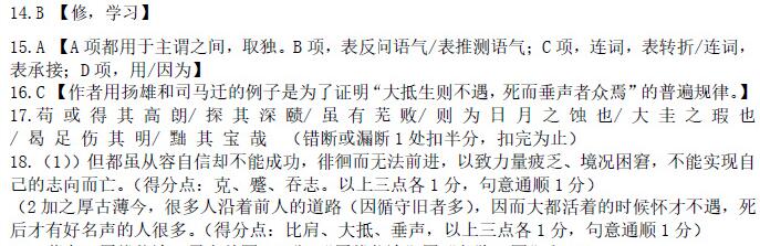 与友人论为文书 柳宗元 古今号文章为难,足下知其所以难乎?非谓比兴之不足,恢拓之不远,钻砺之不工,颇颣①之不除也。得之为难,知之愈难耳。 苟或得其高朗探其深赜虽有芜败则为日月之蚀也大圭之瑕也曷足伤其明黜其宝哉?且自孔氏以来,兹道大阐。家修人励,刓精②竭虑者,几千年矣。其间耗费简札,役用心神者,其可数乎?登文章之篆,波及后代,越不过数十人耳!其余谁不欲争裂绮绣,互攀日月,高视于万物之中,雄峙于百代之下乎?率皆纵臾③而不克,踯躅而不进,力蹙势穷,吞志而没。故曰得之为难。 嗟乎!道之显晦,幸不幸系焉;谈之辩讷,升降系焉;鉴之颇正,好恶系焉;交之广狭,屈伸系焉。则彼卓然自得以奋其间者,合乎否乎?是未可知也。而又荣古虐今者,比肩叠迹,大抵生则不遇,死而垂声者众焉。扬雄没而《法言》大兴,马迁生而《史记》未振。彼之二才,且犹若是,况乎未甚闻著者哉!固有文不传于后祀,声遂绝于天下者矣。故曰知之愈难。 而为文之士亦多渔猎前作,戕贼文史,抉其意,抽其华,置齿牙间,遇事蜂起,金声玉耀,诳聋瞽之人,徼一时之声。虽终沦弃,而其夺朱乱雅,为害已甚。是其所以难也。 间闻足下欲观仆文章,退发囊笥,编其芜秽,心悸气动,交于胸中,未知孰胜,故久滞而不往也。今往仆所著赋、颂、碑、碣、文、记、议、论、书、序之文,凡四十八篇,合为一通,想令治书苍头④吟讽之也。击辕拊缶,必有所择,顾鉴视其何如耳,还以一字示褒贬焉。 【注】①颣(lèi):毛病、缺点②刓(wán)精:削损精力。③纵臾:从容、自信的样子。④治书苍头:管理书籍的奴仆。 14.对下列句子中加点词语的理解,不正确的一项是(3分) A.古今号文章难 号:宣称 B.家修人励 修:修养 C.戕贼文史 戕贼:损害 D.徼一时之声 徼:获取 15.下面各组句子中,加点词的意义与用法相同的一项是(3分) A.比兴之不足 即患秦兵之来 B.其可数乎 其皆出于此乎 C.久滞而不往也 或百步而后止 D.还以一字示褒贬焉 卒以吾郡之发愤一击 16.下列对原文有关内容的概括与赏析,不正确的一项是(3分) A.文章以一设问领起,发人深思。对于“古今号文章为难”的原因,回答因人而异,作者撇开人们常见的难点不谈,提出“得之为难,知之愈难”的观点。 B.文章第二段中,作者认为“为文之士”容易为细疵微瑕所挫和因为成功的几率太小而心灰意冷、中途放弃是“得之为难”的两个原因。 C.文章第三段从正面分析“知之愈难”的原因,作者用扬雄和司马迁两个例子证明“为文之士”的成功要具备际遇好、官位高、交际广的条件。 D.文章第四段从反面论证“知之愈难”的道理,少数“为文之士”剽窃他人作品,断章取义,欺骗大众,造成了恶劣的社会影响,使得真正的高明之作不被人认可。 17.用“/”给文中加波浪线的部分断句。(3分) 苟或得其高朗探其深赜虽有芜败则为日月之蚀也大圭之瑕也曷足伤其明黜其宝哉 18.把文中划线的句子翻译成现代汉语。(8分) (1)率皆纵臾而不克,踯躅而不进,力蹙势穷,吞志而没。(4分) (2)而又荣古虐今者,比肩叠迹,大抵生则不遇,死而垂声者众焉。(4分) 参考答案 14、B 15、A 16、C ![]() 【参考译文】 古往今来,人们都认为写文章是一件难事,您知道难在什么地方吗?不是说作者在文章中比兴手法运用不充分,意境拓展不深远,钻研精神不到位,偏颇毛病不改正;而是说获得真知灼见不易,这种见解为别人正确理解就更难了。 如果有了真知灼见,探索、论证它精深的道理时,虽有毛病,也只是如日月亏缺,白璧微瑕而已,怎么会损害见解的高明,降低文章的价值呢?自孔子以来,文道得以阐扬,家家学习,人人互勉,殚精竭虑已近千年。其间致力于写作的人难道数得清吗?能登典入籍,影响后代的文人却不过几十人啊!其余的人谁不想以华美的文章与日月同辉,傲视万物,称雄百代之后呢?但都只有雄心却不能成功,徘徊而无法前进,以致于筋疲力尽,抱憾而亡。所以说欲得真知灼见是一件难事。 唉,文道的显隐与人的遭际紧密相连,论辩的巧拙与人的官位高低相应,评价作品的得失与人的主观情感相系,交际的广狭又与名气大小相关,那么一个人的真知灼见在文坛上得以张扬,是否合乎条件?这是不可知的。加之厚古薄今,因循守旧者多,因而有卓见者多半怀才不遇,死后方可留下好名声。杨雄死后,《法言》得以流传;司马迁在世时,《史记》却不为人知。他们二人才学精深,尚且如此,何况不怎么为人所知的文人呢?因此,文章没有流传于后世,声名已在当世隐没。所以说见解为别人正确理解更难。 当今作者多剽窃前人作品,曲解文史经典,断章取义,抽取前人文章的精华,哗众取宠,一有机会,便以华而不实的文章欺骗耳聋眼瞎之人,以得一时的声誉。虽然最终会被人唾弃,但这些以假乱真的文章为害极大,这也是那些真知灼见为别人理解更难的原因。