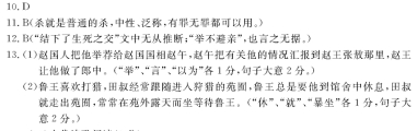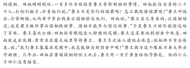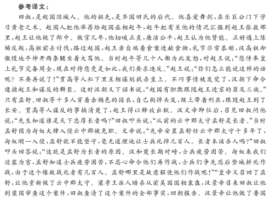 田叔者,赵陉城人也。其先,齐田氏苗裔也。叔喜剑,学黄老术于乐巨公所。赵人举之赵相赵午,午言之赵王张敖所,赵王以为郎中。教岁,切直廉平,赵王贤之。会陈豨反高祖往诛之过赵赵王自持案进食礼恭甚高祖箕踞骂之是时赵午等数十人皆怒谓张王[注]曰“王事上礼备矣,今遇王如是,臣等请为乱。”赵王曰:“公等奈何言若是!毋复出口矣!”贯高等私相与谋弑上。会事发觉,汉下诏捕赵王及群臣反者。是时汉下诏书:“赵有敢随王者罪三族。”唯孟舒、田叔等十余人赭衣自髡钳,随王至长安。贯高事明白,赵王得出。孝文帝既立,召叔问之曰:“公知天下长者乎?”叔顿首曰:“故云中守孟舒,长者也。”是时孟舒也。坐虏大入云中,免。上曰:“先帝置孟舒云中十余年矣,虏曾一入,孟舒不能坚守,毋敌士卒战死者教百人。长者固杀人乎?”叔叩头曰:“是乃孟舒所以为长者也。 汉与楚相距,士卒罢敝。匈奴为边害,孟舒知士卒罢敞,不忍出言、士争临城死敌,以故死者教百人。孟舒岂故驱战之哉!”复召孟舒以为云中守。梁孝王使人杀故吴相袁盎,景帝召叔常梁,具得其事,还报。景帝以为鲁相。相初到,民讼王取其财物百余人。叔取其渠率二十人笞,怒之曰:“王非若主邪?何自敢言若主!”鲁王闻之大惭,发中府钱,使相偿之。相曰:“王自夺为之,使相偿之,是王为恶而相为善也。相毋与偿之。”于是王乃尽偿之。鲁王好猎,相常从入苑中,王辄休相就馆舍,相出,常暴坐待王苑外。王数使人请相休,终不休,曰:“我王暴露苑中,我独何为就舍!”王以故不大出游。数年以官卒,鲁以百金祠,少子仁不受。 (节选自《史记.田叔列传》) [注]此处“张王”即赵王。 10.下列对文中画波浪线部分的断句,正确的一项是(3分) A.会陈豨反高祖/往诛之/过赵/赵王自持案进食礼/恭甚/高祖箕踞骂之/是时赵午等数十人皆怒/谓张王曰/ B.会陈豨反/高祖往诛之/过赵/赵王自持案进)食礼恭甚/高祖箕踞骂之/是时赵午等数十人皆怒/谓张王曰/ C.会陈豨反高祖/往诛之/过赵/赵王自持案进食/礼恭甚/高祖箕踞骂之/是时赵午等周数十人皆怒/谓张王曰/ D.会陈豨反/高祖往诛之/过赵/赵王自持案进食/礼恭甚/高祖箕踞骂之/是时赵午等数十人皆怒/谓张王曰/ 11.下列对文中加点词语的相关内容的解说,不正确的一项是(3分)。 A.苗裔中的“苗”取植物初生、禾谷结实之意,“苗裔”后就引申为世代较远的子孙。 B.“弑”在我国古代指子杀父,臣杀君,“诛”和“杀”则主要用于杀有罪,杀不仁者。 C.古人认为身体发肤受之父母,不敢毁也,是为孝;故剃光头发的髡利是一种羞辱。 D.“顿首”行礼时,头碰地即起头触地面时间短暂,“叩头"是它的俗称。 12.下列对原文有关内容的概括和分析.不正确的一项是(3分) A.田叔忠心事主,冒死辨冤。赵王没有参与谋反,但高祖并不清楚,抓了包括赵王在内的众人;田叔自愿随王进京分罪共罚;也有为王做证之意。 B.田叔秉公直言,举不避亲。他与孟舒曾经共同忠诚于赵王;结下了生死之交;后来经由他的举荐和极力辩污正名,孟舒得以官复原职。 C.田叔以退为进,为民做主。鲁王搜刮百姓,民怨沸腾;田叔设计,故意惩戒百姓,以周唤醒鲁王的道德良知;最终的确达到了让鲁王还钱的目的。 D.田叔考虑周全,用心良苦。田叔作为鲁国的国相,在规劝鲁王时煞费苦心,他的儿次行事看似不给鲁王面子,可实际上都是在维护鲁王的形象。 13. 把文中画横线的句子翻译成现代汉语。 (10分) (1)赵人举之赵相赵午,午言之赵王张敖所,赵王以为郎中。 (2)鲁王好猎,相常从入苑中,王辄休相就馆舍,相出,常暴坐待王苑外。 参考答案 ![]() ![]()