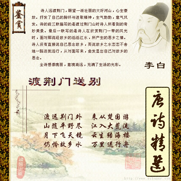《渡荆门送别》是唐代伟大诗人李白青年时期在出蜀漫游的途中写下的一首五言律诗。此诗由写远游点题始,继写沿途见闻和观感,后以思念作结,全诗意境高远,风格雄健,形象奇伟,想象瑰丽,以其卓越的绘景取胜,景象雄浑壮阔,表现了作者少年远游、倜傥不群的个性及如今浓浓的思乡之情。