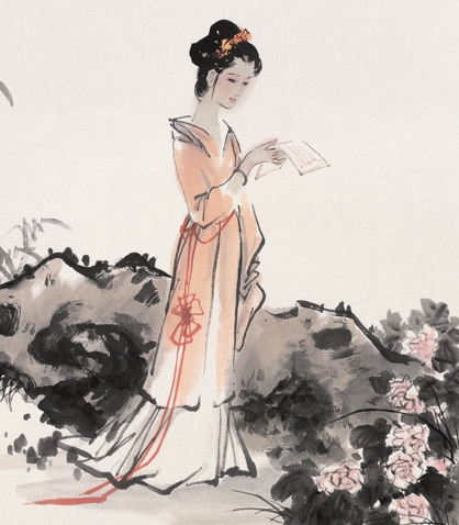 出自李白《长干行二首》之一 妾发初覆额,折花门前剧。 郎骑竹马来,绕床弄青梅。 同居长干里,两小无嫌猜, 十四为君妇,羞颜未尝开。 低头向暗壁,千唤不一回。 十五始展眉,愿同尘与灰。 常存抱柱信,岂上望夫台。 十六君远行,瞿塘滟滪堆。 五月不可触,猿声天上哀。 门前迟行迹,一一生绿苔。 苔深不能扫,落叶秋风早。 八月蝴蝶黄,双飞西园草。 感此伤妾心,坐愁红颜老。 早晚下三巴,预将书报家。 相迎不道远,直至长风沙。 注 ①抱柱信:《庄子·盗跖》:传说“尾生与女子期于梁下(桥梁下),女子不来,水至不去,抱梁柱而死”。后因用作坚守信约的典故。 ②望夫台:在忠州(今重庆市忠县)南数十里。相传古代有人久出不归,他的妻子在此台上眺望,故名。别处又有望夫山、望夫台、望夫石等,传说内容大致相似。 参考译文 我的头发刚刚盖过额头,便同你一起在门前做折花的游戏。你骑着竹马过来,我们一起绕着井栏,互掷青梅为戏。我们同在长干里居住,两个人从小都没什么猜忌。十四岁时嫁给你作妻子,害羞得没有露出过笑脸。低着头对着墙壁的暗处,一再呼唤也不敢回头。十五岁才舒展眉头,愿意永远和你在一起。常抱着至死不渝的信念,怎么能想到会走上望夫台?十六岁时你离家远行,要去瞿塘峡滟滪堆。五月水涨时,滟滪堆不可相触,两岸猿猴的啼叫声传到天上。门前是你离家时徘徊的足迹,渐渐地长满了绿苔。绿苔太厚,不好清扫,树叶飘落,秋天早早来到。八月里,黄色的蝴碟飞舞,双双飞到西园草地上。看到这种情景我很伤心,因而忧愁容颜衰老。无论什么时候你想下三巴回家,请预先把家书捎给我。迎接你不怕道路遥远,一直走到长风沙。 ![]() 赏析 《长干行二首》是唐代诗人李白的组诗作品。这两首爱情叙事诗以商妇独白自述的手法,反映古代商人妻子的生活与情感。第一首诗描绘了商妇各个生活阶段的各个生活侧面,展现了一幅幅鲜明生动的画面,塑造出了一个对理想生活执着追求和热切向往的商贾思妇的艺术形象; 第一首诗对商妇的各个生活阶段,通过生动具体的生活侧面的描绘,在读者面前展开了一幅幅鲜明生动的画面。诗人通过运用形象,进行典型的概括,开头的六句,婉若一组民间孩童嬉戏的风情画卷。“十四为君妇”以下八句,又通过心里描写生动细腻地描绘了小新娘出嫁后的新婚生活。在接下来的诗句中,更以浓重的笔墨描写闺中少妇的离别愁绪,诗情到此形成了鲜明转折。“门前迟行迹”以下八句,通过节气变化和不同景物的描写,将一个思念远行丈夫的少妇形象,鲜明地跃然于纸上。最后两句则透露了李白特有的浪漫主义色彩。这阕诗的不少细节描写是很突出而富于艺术效果的。如“妾发初覆额”以下几句,写男女儿童天真无邪的游戏动作,活泼可爱。“青梅竹马”成为至今仍在使用的成语。又如“低头向暗壁,千唤不一回”,写女子初结婚时的羞怯,非常细腻真切。诗人注意到表现女子不同阶段心理状态的变化,而没有作简单化的处理。再如“门前迟行迹,一一生绿苔”,“八月胡蝶黄,双飞西园草”,通过具体的景物描写,展示了思妇内心世界深邃的感情活动,深刻动人。 原诗是一首以商妇的爱情和离别为题材的乐府诗,以女子自述的口吻,抒发了对远出经商的丈夫的怀念。
