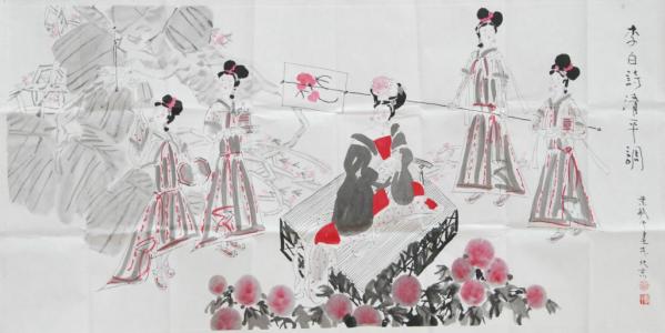 《清平调》 云想衣裳花想容,春风拂槛露华浓。 若非群玉山头见,会向瑶台月下逢。 ![]() 注释: 清平调:一种歌的曲调。 华:通花。 群玉山:神话中的仙山,传说是西王母住的地方。 槛:栏杆。 瑶台:传说中仙子住的地方。 翻译: 彩云像她的衣裳花儿像面容,春风吹拂着栏杆露珠闪闪明。 若不是在群玉山头见到了她,也会在瑶台的月光下来相逢。 译文2: 见到云就使人想到她的衣裳,见到花使人想到她的容貌,春风吹拂着栏杆,在露水滋润下花朵更为浓艳。这样的美女如果不是在神仙居住的群玉山见到的话,也是在瑶池的月光下曾经见过的。 译文3: 杨贵妃的容貌服饰是如此美艳,竟连白云也想来做她的舞衣,牡丹也想做它的粉脸。春风骀荡,轻拂栏杆,牡丹花上沾满了晶莹的露珠,越发显得红艳润泽,而这娇美无比的牡丹花仿佛就是杨贵妃的化身,也只是在西王母的居处瑶台才能见到你。 赏析: 这首诗是李白在长安为翰林时所作。有一次,唐明皇(即唐玄宗)与杨贵妃在沉香亭观赏牡丹,因命李白作新乐章,李白奉旨作了这三章。 第一首以牡丹比贵妃,歌咏她的美艳。“云想衣裳花想容”一句,将贵妃的衣服比作云霞,将容貌比作花朵,将杨贵妃的美丽形象地描绘了出来。其中“云想衣裳”既可以理解为看见云而想到衣裳,又可以理解为把衣裳想象为云;“花想容”既可以理解为看见花而想到杨贵妃的美丽容貌,又可以理解为把杨贵妃的容貌想象为花。寥寥七个字,却将人美、花美、景美巧妙地融合在了一起。“春风拂槛露华浓”一句用“露华浓”来形容花容,充实上句,同时将君王的恩泽比作雨露,表现人与花皆受宠幸。下面,诗人开始调动丰富的想象力,飞升至西王母住的群玉山瑶台。诗人故意用“若非”和“会向”两个词来表示一种选择的意味,但表达的却是非常肯定的意思:美丽的花色、美丽的容貌都如此超凡脱俗,看来也只能在仙境中才能见到吧!这两句中,诗人多处用了比喻。虽然云、花、露、玉山、瑶台、月色等字眼比较朴素,却不露痕迹地赞颂了杨贵妃如牡丹一样美丽的容貌。 其 一 云想衣裳花想容,春风拂槛露华浓。 彩云像她的衣裳花儿像面容,春风吹拂着栏杆露珠闪闪明。 若非群玉山头见,会向瑶台月下逢。 若不是在群玉山头见到了她,也会在瑶台的月光下来相逢。 其 二 一枝红艳露凝香,云雨巫山枉断肠。 像枝红牡丹沐浴雨露散芳香,有杨妃不再思慕神女空自伤。 借问汉宫谁得似,可怜飞燕倚新妆。 请问汉宫佳丽谁能和她媲美,可怜赵飞燕也要靠精心梳妆。 其 三 名花倾国两相欢,长得君王带笑看。 名花伴着绝色美人令人心欢,赢得君王满面带笑不停地看。 解释春风无限恨,沉香亭北倚阑干。 春风中消解了君王无限怅恨,在沉香亭北共同倚靠着栏杆。