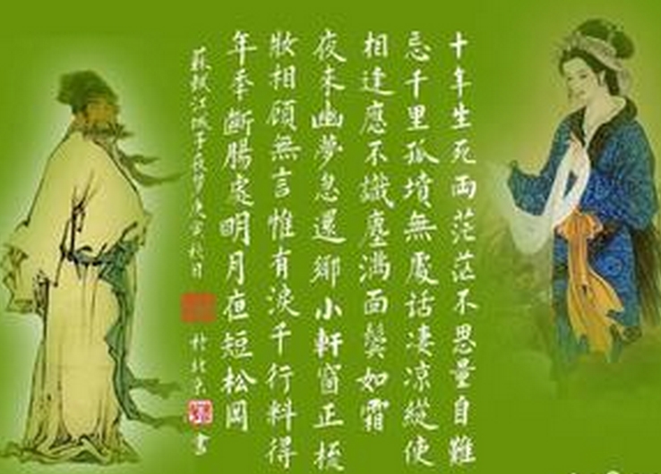 “相顾无言,惟有泪千行”的意思:两人互相望着,千言万语不知从何说起,只有相对无言泪落千行。 作者以这样一个常见而难忘的场景表达了爱侣在自己心目中的永恒的印象。夫妻相见,没有出现久别重逢、卿卿我我的亲昵,而是“相顾无言,唯有泪千行!”这正是东坡笔力奇崛之处,妙绝千古。正唯“无言”,方显沉痛;正唯“无言”,才胜过了万语千言;正唯无言,才使这个梦境令人感到无限凄凉。 出自宋代大文学家苏轼《江城子·乙卯正月二十日夜记梦》 江城子·乙卯正月二十日夜记梦 十年生死两茫茫,不思量⑷,自难忘。千里孤坟,无处话凄凉。纵使相逢应不识,尘满面,鬓如霜。 夜来幽梦忽还乡,小轩窗⑼,正梳妆。相顾无言,惟有泪千行。料得年年肠断处,明月夜,短松冈。 注释 ⑴江城子:词牌名。 ⑵乙卯(mǎo):公元1075年,即北宋熙宁八年。 ⑶十年:指结发妻子王弗去世已十年。 ⑷思量:想念。“量”按格律应念平声liang。 ⑸千里:王弗葬地四川眉山与苏轼任所山东密州,相隔遥远,故称“千里”。孤坟:孟启《本事诗·徵异第五》载张姓妻孔氏赠夫诗:“欲知肠断处,明月照孤坟。”其妻王氏之墓。 ⑹纵使:即使。 ⑺尘满面,鬓如霜:形容饱经沧桑,面容憔悴。 (8)幽梦:梦境隐约,故云幽梦。 (9)小轩窗:指小室的窗前,小轩:有窗槛的小屋。 (10)顾:看。 (11)料得:料想,想来。肠断处:一作“断肠处”。 (12)明月夜,短松冈:苏轼葬妻之地,短松:矮松。 (13)十年生死两茫茫:十年来,生死双方隔绝,什么都不知道了。 (14)千里孤坟:作者妻子的坟墓。 (15)肠断:一做断肠。 参考译文 两人一生一死,隔绝十年,相互思念却很茫然,无法相见。不想让自己去思念,自己却难以忘怀。妻子的孤坟远在千里,没有地方跟她诉说心中的凄凉悲伤。即使相逢也应该不会认识,因为我四处奔波,灰尘满面,鬓发如霜。 晚上忽然在隐约的梦境中回到了家乡,只见妻子正在小窗前对镜梳妆。两人互相望着,千言万语不知从何说起,只有相对无言泪落千行。料想那明月照耀着、长着小松树的坟山,就是与妻子思念年年痛欲断肠的地方。 ![]() 赏析: 《江城子·乙卯正月二十日夜记梦》是宋代大文学家苏轼为悼念原配妻子王弗而写的一首悼亡词,表现了绵绵不尽的哀伤和思念。此词情意缠绵,字字血泪。上阙写词人对亡妻的深沉的思念,写实;下阙记述梦境,抒写了词人对亡妻执着不舍的深情,写虚。上阙记实,下阙记梦,虚实结合,衬托出对亡妻的思念,加深全词的悲伤基调。词中采用白描手法,出语如话家常,却字字从肺腑镂出,自然而又深刻,平淡中寄寓着真淳。全词思致委婉,境界层出,情调凄凉哀婉,为脍炙人口的名作。 苏东坡十九岁时,与年方十六的王弗结婚。王弗年轻美貌,且侍亲甚孝,二人恩爱情深。可惜天命无常,王弗二十七岁就去世了。这对东坡是绝大的打击,其心中的沉痛,精神上的痛苦,是不言而喻的。苏轼在《亡妻王氏墓志铭》里说:“治平二年(1065)五月丁亥,赵郡苏轼之妻王氏(名弗),卒于京师。六月甲午,殡于京城之西。其明年六月壬午,葬于眉之东北彭山县安镇乡可龙里先君、先夫人墓之西北八步。”于平静语气下,寓绝大沉痛。公元1075年(熙宁八年),东坡来到密州,这一年正月二十日,他梦见爱妻王氏,便写下了这首“有声当彻天,有泪当彻泉 ”(陈师道语)且传诵千古的悼亡词。 题中“乙卯”年指的是公元1075年(宋神宗熙宁八年),其时苏东坡任密州(今山东诸城)知州,年已四十。这首“记梦”词,实际上除了下片五句记叙梦境,其他都是抒情文字。开头三句,排空而下,真情直语,感人至深。“十年生死两茫茫”生死相隔,死者对人世是茫然无知了,而活着的人对逝者,也是同样的。恩爱夫妻,撒手永诀,时间倏忽,转瞬十年。“不思量,自难忘”,人虽云亡,而过去美好的情景“自难忘”怀。王弗逝世转瞬十年了,想当初年方十六的王弗嫁给了十九岁的苏东坡,少年夫妻情深意重自不必说,更难得她蕙质兰心,明事理。这十年间,东坡因反对王安石的新法,颇受压制,心境悲愤;到密州后,又逢凶年,忙于处理政务,生活困苦到食杞菊以维持的地步,而且继室王润之(或许正是出于对爱妻王弗的深切思念,东坡续娶了王弗的堂妹王润之,据说此女颇有其堂姐风韵)及儿子均在身旁,故不能年年月月,朝朝暮暮都把逝世的妻子老挂在心间。不是经常想念,但绝不是已经忘却。这种深深地埋在心底的感情,是难以消除的。因为作者时至中年,那种共担忧患的夫妻感情,久而弥笃,是一时一刻都不能消除的。作者将“不思量”与“自难忘”并举,利用这两组看似矛盾的心态之间的张力,真实而深刻地揭示自己内心的情感。十年忌辰,触动人心的日子里,他不能“不思量”那聪慧明理的贤内助。往事蓦然来到心间,久蓄的情感潜流,忽如闸门大开,奔腾澎湃难以遏止。于是乎有梦,是真实而又自然的。“千里孤坟,无处话凄凉”。想到爱妻华年早逝,感慨万千,远隔千里,无处可以话凄凉,话说得极为沉痛。其实即便坟墓近在身边,隔着生死,也是不能话凄凉的。这是抹煞了生死界线的痴语、情语,极大程度上表达了作者孤独寂寞、凄凉无助而又急于向人诉说的情感,格外感人。接着,“纵使相逢应不识,尘满面,鬓如霜。”这三个长短句,又把现实与梦幻混同了起来,把死别后的个人种种忧愤,包括在容颜的苍老,形体的衰败之中,这时他才四十岁,已经“鬓如霜”