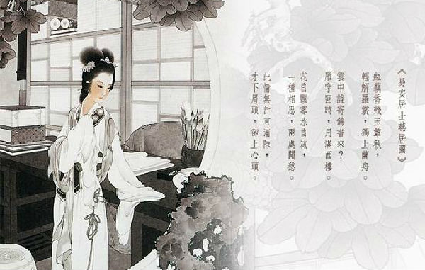 雁字回时,月满西楼。 [译文] 雁群排成整齐的队伍飞回来的时候,月亮正满照着西楼。 [出自] 李清照 《一剪梅》 红藕香残玉簟秋。轻解罗裳,独上兰舟。云中谁寄锦书来?雁字回时,月满西楼。 花自飘零水自流。一种相思,两处闲愁。此情无计可消除,才下眉头,却上心头。 注释 “裳”,古音cháng,古人穿的下衣。也泛指衣服。 玉簟:音diàn ,光华如玉的精美竹席。 雁字:指雁群飞时排成“一”或“人”形。相传雁能传书。 译文1: 红藕香残,鲜艳的荷花凋谢了,从竹席上感到深深的凉意,轻轻提起薄纱罗裙,独自划着一叶兰舟。天空中雁群排成队形飞回来,(有没有)传回谁的家书?鸿雁飞回的时候,(转眼间)已是夜晚,如洗的月光倾泻在西楼,(我这在这盼望着)。 花,自在地飘零,水,自在地飘流,一种离别的相思,你与我,牵动起两处的闲愁。啊,无法排除的是——这相思,这离愁,刚从微蹙的眉间消失,又隐隐缠绕上了心头。 译文2: 荷已残,香已消,冷滑如玉的竹席,透出深深的凉秋,轻轻脱换下薄纱罗裙,独自泛一叶兰舟。仰头凝望远天,那白云舒卷处,谁会将锦书寄有?正是雁群排成“人”字,一行行南归时候,月光皎洁浸人,洒满这西边独倚的亭楼。 花,自在地飘零,水,自在地漂流,一种离别的相思,你与我,牵动起两处的闲愁。啊,无法排除的是——这相思,这离愁,刚从微蹙的眉间消失,又隐隐缠绕上了心头。 ![]() 译文3: 红荷瓣脱香退,竹席处处觉凉。悄悄更换薄绸裳,独自驾船游荡。云空遥望怀想,雁儿“人”字成行。天晚盼不到雁传书,月光洒遍西楼上。 荷花空自飘零,流水空自流淌。同一的刻骨相思,两处的肠断惆怅。解开愁苦与悲伤,实在无法可想,才从眉头挥去,忽又袭来心上。 译文4: 红色的荷花已经凋谢,仅留一丝残香,素白的竹席里透出凉意,仿佛充满秋天的忧愁。我轻轻地解下轻柔的丝裙,(换上秋装)孤独地登上美丽的兰舟。南归的秋雁从云中掠过,却没有将锦书捎回,只有那凄冷的月光溢满西楼。 容貌如鲜花一样容易凋零,青春像流水一样一去不回头。同样一种相思,化作两处的闲愁。难以排遣的,是共同拥有的那份相思之情,刚离开紧蹙的眉头,却又到了烦乱的心头。 ![]() 【赏析】 这是一首别离词,是词人和丈夫分离后的相思之作。 词的上半部分写词人怀远念归。开篇一句点出时令,大概在清秋时节。“红藕香残”写户外的莲藕,“玉簟秋”写室内的凉席,这两处描写都是在渲染节气。此句色彩明丽,含蓄深沉,景中含情。花的开落,是大自然的规律使然,人生也是如此,悲欢离合才是世态常情;玉席变凉,这一方面是肌肤所感,另一方面更是心中所感。这一句内涵丰富,为全词营造出一种凄凉的氛围。随后五句交代词人一天的行动。“轻解罗裳”两句,写词人心事满怀,于是泛舟河上。“独上”二字,说明词人是独自一人。“云中”一句,直写相思之情。可随后词人并没有任情感随意抒发,而是仅此一句便戛然而止,最后两句又落于景语。“雁字回时,月满西楼”,情景交融,营造出一种迷离的意境,使人愁绪暗生。这两句景物描写生动、优美,颇能惹人愁怀,令人读之黯然。 词的下半部分写离愁之深。“花自飘零”一句,上承前文的景物描写,下启后文的情感抒发,写落花流水之景,寓情于景,呼应上文的“红藕香残”、“独上兰舟”两句。随后两句,直抒胸臆,写自己的相思之情,这里视角暗转,抒情对象不再只是词人一人,而是把其丈夫也并入其中,两人都为相思所苦,可见他们情意之深。最后三句,写相思之苦无法摆脱。词人笔法高超,“眉头”与“心头”相对应,“才下”与“却上”相对应,对仗工整,妙笔生花,把相思之情的微妙变化描绘得惟妙惟肖,感人肺腑。 歌曲 月满西楼 赏析二: 词的上片主要描述词人的独居生活。 “红藕香残玉簟秋”是以点带面的写法,给读者描绘了一幅词人眼中的余香袅袅的秋景图。荷花已谢,虽仍留有残香,却不免透出秋的冷落与萧条。玉席也已凉了,秋意渐来,秋凉渐浓。中国的文人自古就悲秋,更何况是独守空闺的女词人呢?怎能不让她倍感孤独寂寥、怎能不思念远行的丈夫呢? 为排遣心中的愁绪而“轻解罗赏,独上兰舟”。一个“独”字而意境全出:曾经是夫唱妇随,曾经是携手并肩,曾经是举案齐眉,而现在却是茕茕孑立,形单影只;举目四望,相伴的只一“兰舟”而已!本是为“消愁”而来,怎奈却是“愁更愁”,相思之情不禁更重更浓。 看到鸿雁,词人想象着也许是丈夫托鸿雁捎来家信,她把苏武雁足传书的典故巧妙地融于眼前的情景之中,自然妥帖,余味无穷。我们可以设想:词人甚至会猜想丈夫在信中告诉自己归期、行程,那种企盼之情溢于字里行间。 “雁字回时,月满西楼”,看到雁群飞回故里,自然会强化企盼丈夫回来的心绪。我们似乎看到词人独自凭栏远眺,柔柔的月光洒满西楼,雁字回时,那种清冷,那种孤独,那种寂寥,怎可言传? 下片是词人抒发内心感受,直抒相思之苦。 词人用“花自飘零水自流”起兴,这既是写她在舟中所见,也是她的内心所感。花飘水流本是物之自态,却使词人触景生情:流水落花无从体味她的情怀,依旧我行我素地流走飘落,这更增加了词人的伤感与凄凉。句中“自”用得最妙,词人移情于物又借物抒情,正如屈原所说“惟草木之零落兮,恐美人之迟暮”,表达 了对韶光易逝的感慨。这样,词中的感情就使人觉得比单纯的思念更深入