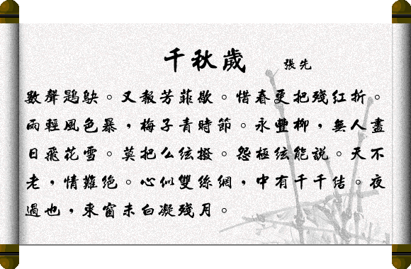 “天不老,情难绝。心似双丝网,中有千千结。”出自东汉诗人张先的《千秋岁》 千秋岁 数声鶗鴂,又报芳菲歇。惜春更选残红折,雨轻风色暴,梅子青时节。永丰柳,无人尽日花飞雪。 莫把幺弦拨,怨极弦能说。天不老,情难绝,心似双丝网,中有千千结。夜过也,东窗未白孤灯灭。 ![]() “天不老,情难绝”:从李贺的“天若有情天亦老”化来,期盼天长地久的意思,天怎么会老呢?天不会老,情就断不了。 “心似双丝网,中有千千结”:以心似丝网比喻情之缠绵固结。表达心中的感受,对彼此的感情,剪不断理还乱的意思。 译文1: 几声鸟叫告知人们,春天的美景已经过去。我惋惜逝去的春光,在花丛中流连,选好的一枝来折。一片细雨,一阵暴风,正是梅子刚熟的时候。如永丰坊中的那棵柳树,尽管无人观看,也终日飘飞着柳絮,就象下着一场大雪。 不要拨弦弹琴,那种幽怨的曲调更令人愁肠百结。天因无情天不老,人缘有情情难绝。我的心似双丝结成的网,其中有无数的结,天色渐亮时才把那盏如豆的孤灯吹灭,又是一个孤独难熬的长夜。 译文2: 鹈鴂鸟儿又开始唱歌,仿佛在告诉人们,春天的美景已经消歇。我贪恋惋惜这旖旎的春光,在花丛中流连,选好一枝未折。细雨霏霏,疾风阵阵,正是梅子刚青时节。如永丰坊中的那棵柳树,尽管无人光顾,也终日飘飞着柳絮,似漫天大雪。 不要把幺弦来弹拨,那种幽怨的曲调更令人愁肠百结。天因无情天不老,人缘有情情难绝。我的心似双丝结成的网络,其中有千结万结。又是一个难熬的长夜,东窗未白,天色渐亮时才把那盏如豆的孤灯吹灭。这等苦楚,更向何人说? 赏析: 这首《千秋岁》写的是悲欢离合之情,声调激越,极尽曲折幽怨之能事。 上片完全运用描写景物来烘托、暗示美好爱情横遭阻抑的沉痛之情。起句把鸣声悲切的鶗鴂提出来,诏告美好的春光又过去了。源出《离骚》“恐鶗鴂之先鸣兮,使夫百草为之不芳。”从“又”字看,他们相爱已经不止一年了,可是由于遭到阻力,这伤情却和春天一样,来也匆匆,去也匆匆。惜春之情油然而生,故有“惜春更把残红折”之举动。所谓“残红”,象征着被破坏而犹坚贞的爱情。一个“折”字更能表达出对于经过风雨摧残的爱情的无比珍惜。紧接着“雨轻风色暴,梅子青时节”是上片最为重要的两句:表面上是写时令,写景物,但用的是语意双关,说的是爱情遭受破坏。“梅子黄时雨”(贺铸《青玉案》)是正常的,而梅子青时,便被无情的风暴突袭,便是灾难了。青春初恋遭此打击,情何以堪!经过这场灾难,美好的春光便又鶗鴂声中归去。被冷落的受害者这时也和柳树一样,一任爱情如柳絮一般逝去了。 换头“莫把幺弦拨,怨极弦能说”两句来得很突然。幺弦,琵琶第四弦。弦幺怨极,就必然发出倾诉不平的最强音。这种极怨的气势下,受害者接着表示其反抗的决心,“天不老,情难绝”。这两句化用李贺“天若有情天亦老”诗句而含意却不完全一样,此处强调的是天不会老,爱情也永无断绝的时候。这爱情是怎样的呢?“心似双丝网,中有千千结。”“丝”“思”,谐音双关。这个情网里,他们是通过千万个结,把彼此牢牢实实地系住,谁想破坏它都是徒劳的。这是全词“警策”之语。情思未了,不觉春宵已经过去,这时东窗未白,残月犹明。如此作结,言尽而味永。 这首词韵高而情深,含蓄又发越,可以说,兼有婉约与豪放两派之妙处。