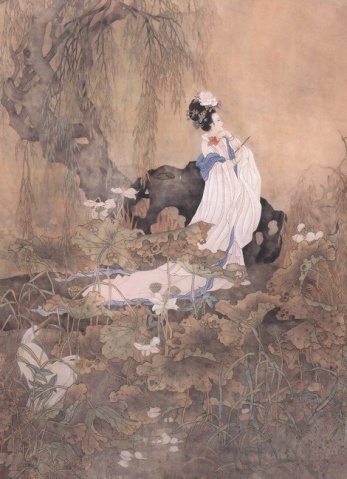 一丛花① 张先 伤高怀远几时穷?无物似情浓。离愁正引千丝乱。更陈陌、飞絮濛濛。嘶骑渐遥②,征尘不断,何处认郎踪? 双鸳池沼水融融,南北小桡通③。梯横画阁黄昏后,又还是、斜月帘栊。沉恨细思,不如桃杏,犹解嫁东风。 [注释] ①一丛花:该调首见张先,这首词又名《一丛花令》、《南吕宫》。 ②骑(jì)名词,指马。 ③桡(ráo):船桨,指船。 《译词》 离别久远的伤怀,何时才能了尽?世间无任何事物,比情感更深沉浓烈。离愁别怨叫我,心乱如千丝万缕。东边路上飞着蒙蒙柳絮,那嘶叫的马儿渐渐远去。征尘飞起不断,迷茫中何处找寻郎的踪迹? 池水溶溶,有嬉戏的对对鸳鸯伴侣。小船可通南北方向,扶梯空横在画阁里,黄昏之后,又是明月斜照在窗棂,藏在心中的离恨呀,我细细思量:真不如桃杏,还懂得嫁给东风,比什么都幸福。 译文1: 在高楼上眺望而伤感,苦苦地思念着远方的心上人,这样的事何时才能结束呢?看来在这世界上再没有什么东西能比爱情更为强烈的了!离愁别恨正牵连着千丝万缕的柳条纷乱不已,更何况东陌之上,垂柳已是飞絮蒙蒙了呢。我眼前还浮现着你的马儿嘶鸣着,越跑越远,一路不断扬起灰尘的情景,情郎啊,你叫我到哪里寻找你的踪迹呢? 池水溶溶,一对鸳鸯在戏水,这水南北可通,时见有小船往来。雕梁画栋的楼阁上梯子已经撤去,黄昏以后,依然还是独个儿面对帘栊,望着斜照在它上面的冷冷清清的月亮。怀着深深的怨恨,我反复思量,我的命运竟然不如桃花杏花,它们倒还能嫁给东风,随风而去呢。 译文2: 带着伤感,登上高楼遥远远方,这无限的情思何时才是个尽头?世间万物再没有任何种像情那么浓厚的了。分离的愁苦正像那千万条柳丝随风乱舞,更有那城东的街道上飘飘飞舞的濛濛柳絮。我的情人骑在嘶鸣的马上,渐渐远去,路上扬起飞尘,我到哪里去辨识情郎哥的踪迹呢。 春水溶溶的池塘中,有一对鸳鸯在悠闲地游泳,南来北往的小船在水中划着。想从前的美好日子,我们登上阁楼,相约一起看黄昏,看如今,黄昏的风景依旧,斜月还是那个斜月,帘栊还是那个帘栊。余恨越来越深,仔细思量,我还不如那桃花杏花,他们还懂得抓住机会嫁给了东风。 译文3: 登上高楼,向远方眺望,思念起远在天边的情人,这无限的情思何时才能了结?世间万物,没有什么能比这相思更苦的了。离别的愁绪正像那纷纷乱乱的柳丝,更有那城东田间小路上飘飞的白絮,迷迷濛濛,让人心烦意乱。心上人骑着马儿渐渐远去,一路上尘土飞扬,坐骑逐渐消失在春烟中,我到何处去辨识情人的行迹! 在春水溶溶的池塘中,并头的鸳鸯在纵情漂游嬉戏,池南池北,小船儿悠然地在池沼中往返飘荡。在那令人沉醉的日子里,在寂静的暮色中,我们在画阁亭台上相依相偎。看如今景物依旧,还是那弯斜月,它的余辉依旧洒在旧日的窗棂上。细细思量,细细品味,离愁别恨竟是如此深重。真不如让这孤苦寂寞的思情,化作艳丽的桃花杏花,在东风的吹拂下竞吐芳华,不虚度美好的青春。 ![]() [赏析] 这是一首伤别念远的闺怨词。全词用白描手法表现伊人心理活动。上阕直抒胸臆,突出抒情主人公的离恨。“无物似情浓” 这一比喻,将抽象的“浓情”强调到世间无物可比的程度,更将离恨推到无以复加的地步,也表达出愁思的迷离纷扬,无处不在。突出思妇念远的真情和执著。下阕集中写思妇念远的痴情。“双鸳”与“斜月”勾出无限的忧思。感情炽烈,情真意切,凄婉深刻,极富感染力。 关于这首词有个故事说:张先曾经与一个小尼姑有私约,老尼姑管教很严,她们住宿在池岛中的一个小阁楼上。待到夜深人静,小尼姑就偷偷地从梯子上下来,使张先能登池岛来阁楼与她幽会。临别时,张先十分留恋不舍就写了这首《一丛花》词来抒发自己的情怀。(《绿窗新话》引杨湜《古今词话》)看来这是出于好事者有意的附会,未必真有其事。细读全篇,不难看出它只不过是一首表现最常见的怀远伤别主题的闺怨词。 此词写一位女子她的恋人离开后独处深闺的相思和愁恨。词的结尾两句,通过形象而新奇的比喻,表现了女主人公对爱情的执着、对青春的珍惜、对幸福的向往、对无聊生活的抗议、对美好事物的追求,是历来传诵的名句。 起首一句,是经历了长久的离别、体验过多次伤高怀远之苦以后,盘郁萦绕胸中的感情的倾泻。它略去了前此的许多情事,也概括了前此的许多情事。起得突兀有力,感慨深沉。第二句是对“几时穷”的一种回答,合起来的意思是伤高怀远之情之所以无穷无尽,是因为世上没有任何事情比真挚的爱情更为浓烈的缘故。这是对“情”的一种带哲理性的思索与概括。这是挟带着强烈深切感情的议论。以上两句,点明了词旨为伤高怀远,又显示了这种感情的深度与强度。 接下来三句,写伤离的女主人公对随风飘拂的柳丝飞絮的特殊感受。“离愁”,承上“伤高怀远”。本来是乱拂的千万条柳丝引动了胸中的离思,使自己的心绪纷乱不宁,这里却反过来说自己的离愁引动得柳丝纷乱。这一句貌似无理的话,却更深切地表现了愁之“浓”,浓到使外物随着它的节奏活动,成为主观感情的象征。这里用的是移情手法。而那蒙蒙飞絮,也仿佛成了女主人公烦乱、郁闷心情的一种外化。“千丝”谐“千思”。 上片末三句写别后登高忆旧。尤言:想当时郎骑着嘶鸣着的马儿逐渐远去,消逝尘土飞扬之中,今日登