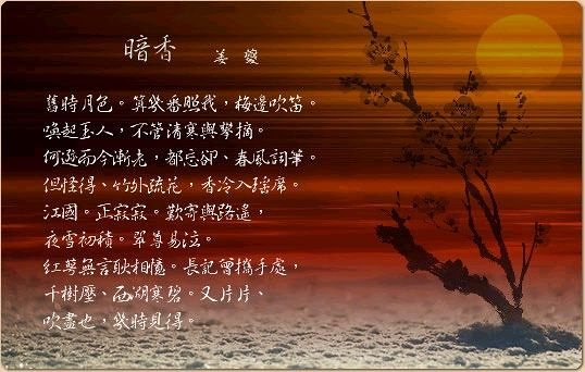 辛亥之冬,余载雪诣石湖。止既月,授简索句,且征新声,作此两曲,石湖把玩不已,使二妓肆习之,音节谐婉,乃名之曰:”暗香”、”疏影”。 旧时月色,算几番照我,梅边吹笛?唤起玉人,不管清寒与攀摘。何逊而今渐老,都忘却春风词笔。但怪得竹外疏花,香冷入瑶席。 江国,正寂寂,叹寄与路遥,夜雪初积。翠尊易泣,红萼无言耿相忆。长记曾携手处,千树压、西湖寒碧。又片片、吹尽也,几时见得? 【注释】 ① 辛亥:光宗绍熙二年。(1191)。 ② 载雪:冒雪乘船。 ③ 诣:到。 ④ 石湖:在苏州西南,与太湖通。南宋诗人范成大晚年居住在苏州西南的石湖,自号石湖居士。 ⑤ 止即月:指刚住满一个月。 ⑥ 授简索:给纸索取诗调。简:纸。 ⑦ 征新声:征求新的词调。 ⑧ 把玩:指反复欣赏。 ⑨ 二妓:乐工和歌妓。 ⑩ 隶习:学习。 寄与路遥:表示音讯隔绝。这里暗用陆凯寄给范晔的诗:“折梅逢驿使,寄与陇头人。” 千树:写寒冬时千树红梅映在西湖碧水之中的美丽景色。宋时杭州西湖上的孤山梅树成林,所以有“千树”之说。 【译文】 辛亥年冬天,我冒雪去拜访石湖居士。居士要求我创作新曲,于是我创作了这两首词曲。石湖居士吟赏不已,教乐工歌妓练习演唱,音调节律悦耳婉转。于是将其命名为《暗香》、《疏影》。昔日皎洁的月色,曾经多少次映照着我,对着梅花吹得玉笛声韵谐和。笛声唤起了美丽的佳人,跟我一道攀折梅花,不顾清冷寒瑟。而今我像何逊已渐渐衰老,往日春风般绚丽的辞采和文笔,全都已经忘记。但是令我惊异,竹林外稀疏的梅花,谒将清冷的幽香散入华丽的宴席。江南水乡,正是一片静寂。想折枝梅花寄托相思情意,可叹路途遥遥,夜晚一声积雪又遮断了大地。手捧起翠玉酒杯,禁不住洒下伤心的泪滴,面对着红梅默默无语。昔日折梅的美人便浮上我的记忆。总记得曾经携手游赏之地,千株梅林压满了绽放的红梅,西湖上泛着寒波一片澄碧。此刻梅林压满了绽放的红梅,西湖上泛着寒波一片澄碧。此刻梅林压满了飘离,被风吹得凋落无余,何时才能重见梅花的幽丽? 【译文二】 旧时皎洁的月光,曾多少次照着我,在梅花旁吹奏玉笛。笛声唤起美丽佳人,不顾寒冷和我一起把梅花攀摘。而今我像何逊一样渐渐老迈,全无当年春风得意的动人文笔。但奇怪的是竹林外几枝梅花,偏把缕缕幽香送入华丽宴席。 此时,江南水乡正分外的凄冷静寂。想寄你一枝寒梅可惜路太远,还有一夜茫茫大雪堆积。手捧翠绿酒杯不禁伤心落泪,只能默对红梅深情想念你。永难忘那时我们携手同游,千树寒梅绽放,西湖一片澄碧。而今眼看梅花又片片落尽,可不知几时还能见到你? ![]() 【评点】 本篇为词人咏梅名作之一。全词将咏梅与怀人相结合描写,既咏赞梅花优雅的芳姿神韵,又抒写词人身世飘零之恨和感事怀人伤离念远之情。 上片写词人悲凉身世。前五句写对往事的回忆。“旧时月色”点出时间和空间范围,“旧时”拉开了时间的距离;月色在天,又撑起了空间的境地;“算几番照我”承接上句的月色,勾勒出词人回忆昔日情景时的凝神状态;“梅边吹笛”,点出“梅”字,切题咏物;笛声“唤起玉人”,她“不管清寒与攀摘”,此二句以美人烘托梅花,写玉人的一片深情都倾注在梅花上,增添了梅花的厚重。“何逊”三句写现实情景,词人以“何逊”自比,感叹时光易逝,面对梅花,再也写不出当年春风得意的诗句了。末三句笔锋一转,点明题旨,具体描绘了石湖的梅花。 下片感事怀人。前四句以江南的凄寂反衬内心的相思之情,想寄她一枝寒梅,却重重相隔无法寄达。自然引出下两句:“翠尊易泣,红萼无言耿相忆。”“长记”三句写的是昔日与情人携手同游梅林的情景。最后两句转回现实,写此时梅花凋零的肃杀景象。“几时见得”一语双关,一是梅花落了几时开,又有几时还能见到心上人的意思,韵味深长。 【赏析】 这首词是姜夔客居范成大宅邸时的咏梅之作。上阕先追忆往昔在杭州西湖月夜赏梅的情景,和今日赏梅景况相对照,情怀凄清寂寞。下阕先写今日赏梅的遥远思念,再与离愁别绪,最后回到眼前,写梅的凋残,表现出无限怅恨。该词将咏梅与忆念“玉人”相交相织,时空跳跃幅度较大,穿插典故,咏物寄情,形神兼备,情趣高洁。 本篇为作者咏梅名作之一。本篇在咏梅同时抒发了怀念故人的情怀。此词作是作者载雪访范成大于石湖时写的,同时还写了《疏影》。张炎在《词源》中所说:"诗之赋梅,唯和靖(林逋)一联(指"疏影横斜水清浅,暗香浮动月黄昏")而已,世非无诗,无能与之齐驱耳。词之赋梅,唯白石《暗香》、《疏影》二曲,前无古人,后无来者,自立新意,真为绝唱。"张炎对林逋的《山园小梅》和姜夔《暗香》、《疏影》的评价是很高的。但是他的作品没过多的历史价值,实际上只是借物咏怀、即景言情的抒情诗,写作者所见所感,寄寓个人身世飘零和昔盛今衰的慨叹。 《暗香》一词,以梅花为线索,通过回忆对比,抒写作者今昔之变和盛衰之感。词上片写月中赏梅。词人从回忆往日赏梅开头,凭空升出一番意绪,时间、意象重叠。古诗中“月色”几乎都有一种冷的意味,在月光的冷色调里就能造成一种幽冷的范围,着重色调与氛围的感受,多了一层朦胧。 “旧时”把读者带入一种对往事的回忆中,同时也含有一种今昔的对比,同时也见出“月色依旧,人事已非”的感慨,毕竟“岁岁年年花
