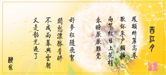 柳永 凤额绣帘高卷,兽环朱户频摇。两竿红日上花棚。春睡厌厌难觉。 好梦狂随飞絮,闲愁浓,胜香醪。不成雨暮与云朝。又是韶光过了。 注 ①此词写一富贵人家的小姐在春日里思念能得一如意郎君相伴,但这一如意郎君却始终没能出现的愁苦心情。上片着意刻画这位小姐无所事事,任时光在春睡中度过的孤单寂寞之情景;下片写这位小姐之所以如此打发美好的春光,是因其思春情切,为没能得一如意郎君相伴而苦恼,并恨青春易过的心绪。 ②凤额绣帘高卷:凤额绣帘,横额上绣有凤凰图案的帘帐;高卷,高高地卷起,说明夜色早已过去,夜间所用的帘帐已经卷了起来。 凤额:器物端部饰有凤形的装饰物。 ![]() ③兽珠朱户频摇:兽环bù,古时门上常镶一野兽之头的装饰物,兽头的嘴里叨着一铜环,所以称为兽环;朱户,红漆的大门;频摇,有节奏地晃动,指兽环在晃动。此句主要在点明词中这位主人公小姐生长在富贵之家,普通人家是没有朱户兽环的。 ④两竿红日上花梢:两竿红日,升起有两棵竹竿那么高的红日;上花梢,太阳光已经照到开花的树梢。此句意在写明时间是天亮好一阵子了。 ⑤春睡厌厌难觉:厌厌,精神不振的样子。此句是说:这位小姐在此春日的大好时光里睡的时间已经很长,但仍然一付精神不振难以醒来的样子。 ⑥好梦狂随飞絮:好梦,怀春之梦,梦得有情郎;狂随,很快地随着。此句之意是:刚刚做了一个得遇有情郎的好梦,谁知却像飞絮一样,很快就不见了。 ⑦闲愁浓胜香醪:闲愁,因无所事事而引发的忧愁;香醪,非常醇厚的美酒。此句之意是:因无所事事而引发的怀春之忧愁比那非常醇厚的美酒还要浓烈。醪:浊酒。 ⑧不成雨暮与云朝:雨暮与云朝典出宋玉《高唐赋》,楚襄王田猎于高唐,夜梦一神女自称为炎帝之女瑶姬,现为巫山之神,与楚襄王成就了一夜的夫妻情爱,到天明临走之时告诉楚襄王:“妾在巫山之阳,高丘之阻,旦为朝云,暮为行雨,朝朝暮暮,阳台之下。”后来人们就以朝云暮雨比喻男女之性爱。此句之意是:这位小姐在其好梦之中还没有与她的梦中情郎成就朝云暮雨,就醒来了。 ⑨又是韶光过了:韶光,美好的春光,此指梦中的好风光。此句之意是:又是一次美好的梦中风光过去了。