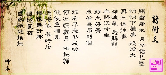 柳永 闲窗漏永,月冷霜花堕。悄悄下帘幕,残灯火。再三追往事,离魂乱、愁肠锁。无语沉吟坐。好天好景,未省展眉则个。 从前早是多成破。何况经岁月,相抛亸。假使重相见,还得似、旧时么。悔恨无计那。迢迢良夜。自家只恁摧挫。 ![]() 作者 柳永(约987年—约1053年),北宋著名词人,婉约派代表人物。汉族,崇安(今福建武夷山)人,原名三变,字景庄,后改名永,字耆卿,排行第七,又称柳七。宋仁宗朝进士,官至屯田员外郎,故世称柳屯田。他自称“奉旨填词柳三变”,以毕生精力作词,并以“白衣卿相”自诩。其词多描绘城市风光和歌妓生活,尤长于抒写羁旅行役之情,其中慢词独多,铺叙刻画,情景交融,语言通俗,音律谐婉,在当时流传极其广泛,有“凡有井水饮处,皆能歌柳词”之说。柳永作为婉约派最具代表性的人物之一,对宋词的发展有重大影响,代表作有《雨霖铃》、《八声甘州》、《凤栖梧》等