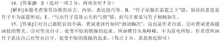 黄庭坚 酒浇胸次不能平,吐出苍竹岁峥嵘。 卧龙偃蹇雷不惊,公与此君俱忘形。 晴窗影落石泓处,松煤浅染饱霜兔。 中安三石使屈蟠,亦恐形全便飞去。 【注】黄庭坚贬戎州时,与黄斌老交往。黄斌老善画竹,画了一幅横竹送黄庭坚,黄庭坚因而作了此诗。石泓:石砚。霜兔:用兔毫制成的笔。 ⑴次韵:依次用所和诗中的韵作诗,也称步韵。黄斌老:四川梓潼人,宋代画家文与可的妻侄,善画墨竹。 ⑵胸次:胸中,胸间。亦指胸怀。《庄子·田子方》:“行小变而不失其大常也,喜怒哀乐不入于胸次。” ⑶岁峥(zhēng)嵘(róng):岁月峥嵘,形容苍竹出于寒冬严峻天气。峥嵘,高峻貌,引申为卓越,不平凡。 ⑷卧龙:此处形容树木或树根盘曲之状。偃(yǎn)蹇(jiǎn):横卧的样子。 ⑸此君:竹的代称。这里用的是王徽之的故事。《晋书·王徽之传》:“﹝徽之﹞尝寄居空宅中,便令种竹。或问其故,徽之但啸咏指竹曰:‘何可一日无此君邪!’”后因作竹的代称。唐岑参《范公丛竹歌》:“此君托根幸得地,种来几时闻已大。” ⑹石泓:砚台的别称。 ⑺松煤:用松烟制成的墨。霜兔:用雪白的秋兔毫制成的笔。元倪瓒《画竹寄张天民》诗:“自矜霜兔健,安有鲁鱼乖。” ⑻屈蟠(pán):盘曲。北魏贾思勰《齐民要术·桃》引汉卫宏《汉旧仪》:“东诲之内度朔山上有桃屈蟠三千里。”唐杜甫《西枝村寻置草堂地夜宿赞公土室》诗:“惆怅老大藤,沉吟屈蟠树。” ⑼“中安”二句:指画面有三块石头压着竹子,使之盘曲诘屈,不得伸展。一旦得到伸展,形体画全了,卧龙便会飞去。 14.下列对本诗的理解,不正确的两项是(5分) A.“吐”字写出了黄斌老画竹动作熟练,一气呵成;“峥嵘”写出所画之竹不同凡响。 B.诗中把竹比作“偃蹇”之卧龙,是说竹子屈服在雷霆之下,暂时失去刚直的品性。 C.黄斌老把自己的品格灌注到所画竹子之上,与竹“俱忘形”,才画出气节不凡的竹。 D.第三联的意思是,在晴明的窗下,黄斌老用兔毫笔饱蘸松烟墨画出了这幅横竹图。 E.尾联运用比喻、夸张的手法,写出竹子直耸云天的气势,突出了黄斌老画技之高超。 15.诗歌表达了哪些思想感情?请简要分析。(6分) 参考答案 14、BE 15.对自己被贬官不满。对黄斌老高超画技的赞美。对坚贞自守,处变不惊的情操的追求。所画横竹头角峥嵘、不为雷地所惊。作者借所画竹子表达自己对坚贞自守、处变不惊的情操的追求。 ![]() 二 (1)诗中第二句的“吐”字很有表现力,请简要赏析。(2分) (2)诗中的“横竹”有什么特点?作者是怎样表现出来的?(4分) 参考答案 (1)“吐”照应第一句,说明这幅画的创作目的是把心中的块垒倾诉出来,(1分)同时突出了横竹的气势,苍劲挺拔。(1分) (2)横竹苍劲挺拔,不为风雷所惊(硬朗、不屈),传神逼真。作者用了比喻、夸张等手法,把横竹比喻成卧龙,最后一句运用夸张的手法表现横竹的逼真。(特点任写两个得2分,手法每个1分) 三 注:此诗是黄庭坚贬戎州(今四川宜宾)时为黄斌老送他一幅横竹画而作。 14. 下列对这首诗的赏析,不正确的一项是( ) A. 第一、二两句中“吐”表明黄斌老创作动机非凡,故画出的竹气势峥嵘,不同凡响。 B. 第三、四句把竹子比作“偃蹇”之卧龙,屈服困顿在雷霆之下,隐喻诗人被贬的遭遇。 C. 第五、六句描述黄斌老在晴明的窗下,用兔毫笔饱蘸松烟墨,画出了这幅横竹图。 D. 第七、八句写画上三块石头是防止竹子画好了像龙一样飞去,突出黄斌老画技高超。 15. 黄斌老笔下的竹子为全诗的情感抒发起了什么作用?请结合诗句进行分析。 【答案】 14. B 本题B项,“竹子屈服在雷霆之下”错,“卧龙偃蹇雷不惊”由“雷不惊”可见原诗的意思是竹子不为雷霆所屈。“隐喻诗人被贬的遭遇”错,应是表现作者的刚直不阿,不屈不挠。故选B。 15. (1)所画竹子活灵活现,栩栩如生,对黄斌老高超画技的赞赏之情。(2)借咏竹子峥嵘不屈,处变不惊的形象,托物言志,表达作者对时局难以平复的不平与愤懑,政治上遭受打击后不屈不挠的坚韧气度。 参考译文 借酒浇灌胸中抑郁不能平,吐出来画作青竹岁月峥嵘。 像卧龙横卧雷霆不能惊,您与青竹全都忘了形。 晴天的窗影落在砚池里,松烟墨浅染蘸饱了霜兔。 画中安置三块怪石使青竹屈蟠,也担心形状完全会飞去。 背景 黄庭坚贬戎州时,与黄斌老交往,斌老善画竹,画了一幅横竹送黄庭坚,黄庭坚因作此诗。斌老是文同(字与可)的妻侄。文同是北宋的诗人,也是最善画竹的画家,“胸有成竹”就是他的故事。因此,斌老画竹的艺术风格和技巧是有其渊源的。而文同与苏轼是表兄弟,关系极好,作为“苏门四学士”之一的黄庭坚到了戎州,便与在那里做小官的斌老交上了朋友。 黄庭坚编修《神宗实录》,被章惇、蔡京一党诬为“修史不实”,于绍圣二年(1095年)贬黔州,又于元符元年(1098年)迁戎州,在戎州共三年。据任渊注,此诗当作于元符元年(1098年),正是黄庭坚初到戎州,心情十分苦闷之时。在这几年中,黄庭坚过的是谪居贬斥的生活,而戎州当时十分偏僻,无论生活或文化条件都很差,他把自己的寓所取名“槁木寮”、“死灰庵”,其心情可知。 赏析 《次韵黄斌老所画横竹》为宋代文学家黄庭坚的诗作。此诗是黄庭坚贬戎州(今四川宜宾)时为黄斌老送他一幅横竹画而作。全诗称赏黄斌老所画横竹,突出了竹的奇横,指出它是画家胸中骨梗的外化。作品风格瘦劲挺拔,充