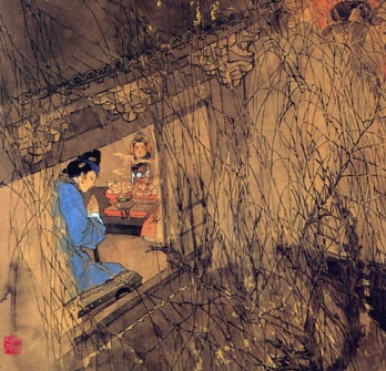 宋代 朱敦儒 春雨细如尘,楼外柳丝黄湿。风约绣帘斜去,透窗纱寒碧。 美人慵剪上元灯,弹泪倚瑶瑟。却卜紫姑香火,问辽东消息。 注释 ①约:缠裹。 ②上元:农历正月十五日为上元节,又名灯节。 ③紫姑;民问传说中的厕神。捌敬叔《异苑》卷五:“世有紫姑神,古来相传是人妾,为大妇所嫉。每以秽事相次役。正月十五日,感激而死。” ④辽东消息:用神话中丁令威化鹤归来之典。 ![]() 赏析 《好事近·春雨细如尘》是宋代词人朱敦儒的早期词作品,写元夕怀人之情致,词风婉约。 这首小词为作者早期作品,写元夕怀人之情致,词风婉约。 起首两句写楼外。春雨绵绵密密,像尘雾一般,灰蒙蒙的,刚刚泛出鹅黄色的柳梢给雨打湿,水淋淋的。说春雨“细如尘”,新鲜而熨贴。春雨是细屑的,轻倩的,迷离漫漶,润物无声,似乎非“如尘”二字无以尽其态。用它来映衬怀人的愁思,便显得十分工致。“湿”承“雨”来。“黄”字体物入微,切合物候,又应“春”意,让人联想到稚柳这迷蒙细雨的薰沐下所焕发的生机。接下来,“风约”逗引出后两句,视点拉回室内。上片状景,由远而近,由外而内,笔笔勾联,丝丝入扣;这几句看似景语,实乃情语,打下了闺人的主观色彩。“如尘”的雨,多少给人以凄迷低黯之感;柳色又新,牵惹着对远人的缕缕情思;阵阵轻寒,更使那碧色的窗纱涂上感伤的色调,寒气直浸入心底其中“寒碧”是以景写情的重笔,女子心中的感受由此得到深刻的展示。作者借拟女主人的眼光,写出了一个寂冷的环境。 过片直接突出了居于画面中心的女主人公——“美人慵剪上元灯,弹泪倚瑶瑟”。上元即农历正月十五日元宵节,宋代是个盛大的节日,民间有吃圆子(汤圆,取阖家团圆之意)、观彩灯、祭紫姑等习俗。点明上元之时,背景就变得更其具体而典型,把人物感情衬托得愈加强烈。周密《武林旧事》卷二“灯品”:“又有深闺巧姓,剪纸而成,尤为精妙。”陆游《十二月一日》诗:“儿书春日榜,女剪上元灯。”说明宋时剪纸做灯,乃闺人巧技,而且有早些日子就开始制作以备上元灯节玩赏的。可见这一句“美人慵剪上元灯”,不是一般的身心慵懒,而是由于情绪恶劣之极。“弹泪倚瑶瑟”句加重悲情之分量,写她欲鼓瑟以舒怨怀亦不可能,好只倚瑟弹泪了。 结束两句:“却卜紫姑香火,问辽东消息。”前一句承接上文,转进一层,与美人问卜的事。紫姑,相传为唐武则天时寿阳刺史李景之妾,为大妇所嫉,正月十五日夜被害死于厕间,上帝悯之,命为厕神。旧时民间每于元宵夜图画其形以祭,并扶乩卜问祸福。 无心剪灯,有意问卜,写出少妇关注之所。就这样,结句全词层层推进之后,以轻淡之笔出之。辽东,古郡名,故址今辽宁省东南部,多用来借指遥远的边地,以代亲人之所。至词的主旨已经明确、完整地表达出来,而字面上终归没有道破。淡语入情,含蓄不尽。这一结语使全词意境浑成,主旨突出,堪称巧妙。