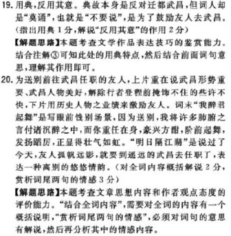 【宋】岳甫 编修公易镇武昌,安阳岳甫作歌头一阕,奉祖行色。甫再拜。 鲁口天下壮,襟楚带三吴。山川表里营垒,屯列拱神都。鹦鹉洲前处士,黄鹤楼中仙客,拍手试招呼。莫诵昔人句,不食武昌鱼。 望樊冈,过赤壁,想雄图。寂寥霸气,应笑当日阿瞒疏。收拾周黄策略,成就孙刘基业,未信赏音无。我醉君起舞,明日隔江湖。 [注]①岳甫:宋朝词人,岳飞之孙。②本词为送友人(时任编修官职)前往武昌任职而作,小序意为敬献小词,聊为送别,为行者增添些豪壮风采。三国时吴统治者孙皓一度从建业迁都武昌,上层人士反对迁都,造作歌谣云:“宁饮建业水,不食武昌鱼。” 1.分析上片“莫诵昔人句,不食武昌鱼”的写法特点与作用。(3分) 2.结合全词内容,赏析词尾“我醉君起舞,明日隔江湖”所表达的情感。(5分) 参考答案 1、用典,反用其意。典故本身是反对迁都武昌,但词人却是“莫诵”,也就是“不要说”,是为了鼓励友人去武昌。 2、为送别前往武昌任职的友人,上片重在说武昌形势重要、武昌人物美好,解除行者登程前掩饰不住的些许不快,下片用历史人物之业绩来激励友人。词末“我醉君起舞”是写眼前饯别场景,因为送别,我将许多肺腑之言付诸沉醉之中,而你重任在身;豪兴方酣,阶前起舞,发扬蹈厉。正显得壮气如虹。“明日隔江湖”是说过了今天,友人孤帆远影,就要到遥远的武昌去任职了,表达了一种离别的悠悠情韵。 ![]() 赏析 据《全宋词》对岳甫的记载,他主要活动在宋孝宗、宋光宗年间,也就是南宋覆亡前,宋朝和金朝对峙的时候。“胡尘未已,烽烟时烈。”作者送友人去武昌,从国难时艰的大局需要处着眼,词中包含了很多劝勉和激励的话语,弹拨的是那个时代的爱国主调。 “鲁口天下壮”,发语雄断,振领全篇。第二句直接点“壮”的原因,第四句“拱”字,又对“壮”字作了作用上的补充,四句神完气足,笔势浑成。鲁口即指武昌一带。武昌形势险要,雄踞京华上游,历来为兵家必争之地。金元侵略者南下侵犯宋朝,要么从下游取扬州、润州,要么从武昌侵犯潭州,再西上东下,这证明了武昌是在战略要冲的位置。“襟楚带三吴”,襟、带本来都是名词,这里作意动来用,以楚地为襟,以三吴为带。意思是,譬如人的衣着,楚地是武昌的襟领,三吴(宋时指常州、苏州、湖州一带)则是它的长长的飘带;它昂首荆楚一带,顾视杭州,牵动全国。自从王勃用“襟三江而带五湖”来形容南昌的地势以后,人们看重了“襟”字和“带”字的形象比拟作用,一用它,就使读者生出很多联想,而且飘逸了文势。“山川表里营垒”,武昌一带既有历史上争战时遗留下的旧垒,又有宋代设防的军营,这些营垒外凭长江,内倚山峦,“造化钟神秀”。“屯列拱神都”,承“营垒”而来,是说无数的营垒屯列在武昌上游,它便像铜墙铁障拱卫着下游的京城临安。开篇四句极写友人将去的地方,形胜险壮,扼据要冲。“鹦鹉洲前处士”三句,则是说武昌一带隐士高人众多,人才云集。比如有乘鹤云游的子安那样的仙人,还有洲渚上“侣鱼虾而友麋鹿”的逸者。友人要去做军政长官,只要拍一拍手,就能招呼到很多旷世名流。 词中所说的“神都”,即京城临安。封建官员向来看重在京城供职,接近权力中心,享受优渥;而不愿外放,尤其把任所偏远的地方看作畏途。作者友人的身份是编修,是参与国史实录的编纂者,也可能在国防机关枢密院掌管文字,是重要的职位,而武昌则在杭州西面千里远的地方。在词中,编修楼的这位要人即将去外地任职,驻镇武昌了,他显出了一些不痛快。词的上片尾段处说得十分明白:“莫诵昔人句,不食武昌鱼。”“莫诵”表明了作者是在清楚地慰勉友人。三国时吴国统治者孙皓一度从建业迁都武昌,上层人士反对迁都,编歌谣唱道:“宁饮建业水,不食武昌鱼。”词人对友人说,不要讲“不食武昌鱼”,而是应该到武昌去。慰勉的话放在上片末段处来说,很有份量,因为前面七句分两层,说的是武昌形势重要、武昌人物美好。这两点说得很充分,用“莫诵”来表达,显得自然而有力。下片开头的三个短语,是作者为友人作设想的话:“当你西行渐远,望鄂城樊口一带峰峦,经赤壁一带峭壁,一定缅怀三国时群雄争战的雄图大略吧。”“寂寥”以下四句,词人从两方面,对友人的未来提出了告诫和期望。当年霸气的曹操有寂寥的、让人嗟叹的一面,因为曹操一时疏忽,中了周瑜、黄盖之计,造成了大败的结局。“应笑”是提醒,是箴试,要后来的人不要重蹈曹操的覆辙。这是从反面说。另一面,孙权、刘备集团则汇聚众人谋略,成就了大业。“收拾周黄策略”,“收拾”,继承,集中。这是从正面说,只要善于谋事,善于汲取前人有益经验,就能成就孙刘那样的大业。与武昌相关的典实,最吸引人的,就是公元208年的那场赤壁鏖战了。尽管词人送友人的时候,国势、时局与汉代末年完全不同,然而词中提到的用智谋和勇气破灭一时强敌的精神,却是古今相通的。所以词人说,“未信赏音无”,意思是:“我不相信,如今的人已经不欣赏那场转弱为强的赤壁之战中,孙权和刘备的胜举!”“未信”,用语含蓄,与上片“莫诵”的直言不同,笔调一变。“收拾”三句,从内在精神里,遥遥呼应一个“壮”字,是“奉祖行色”,用来增加壮志感慨的最高音。结笔二句,作者在对场面的想象描述中悠然打住,令人神远。“我醉君起舞”,“君
