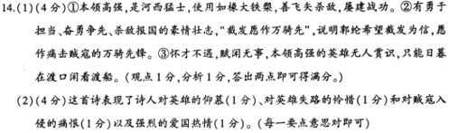 苏轼 河西猛士无人识,日暮津亭阅过船。 路人但觉骢马瘦,不知铁槊大如椽。 因言“西方久不战,截发愿作万骑先”。 我当凭轼与寓目②,看君飞矢集蛮毡③。 【注】①这是苏轼23岁时的作品。郭纶,本河西弓箭手,屡战有功。仁宗康定元年九月,西贼寇三川寨,三班借职(宋代武臣的最低职级)郭纶固守,定川堡得不陷。②寓目:犹过目,观看。③蛮毡:毡帐,借指来犯的贼寇。 (1)请简要分析诗中郭纶这一人物形象。(4分) (2)作者在诗中表达了怎样的情感?(4分) 参考答案 (1)本领高强,是河西猛士,使用如椽大铁槊,善飞矢杀敌,屡建战功。 (2)这首诗表现了诗人对英雄的仰慕、对英雄失路的怜惜和对贼寇入侵的痛恨以及强烈的爱国热情。 ![]() 诗意 郭纶本是河西一带知名的勇士,如今的人们却都不识得他了,这位昔日的猛将只是在傍晚时分,坐在渡口,闲看过往船只来打发时间。路人只见他骑着一匹瘦弱的青白色马,却不知他曾经使用的长矛大如屋椽。郭纶说,边疆久无战事才沦落如此,一旦有了战况,他誓言愿冲锋陷阵。那时,我自当拭目观看,看这位勇士的飞箭射向敌人的军阵。